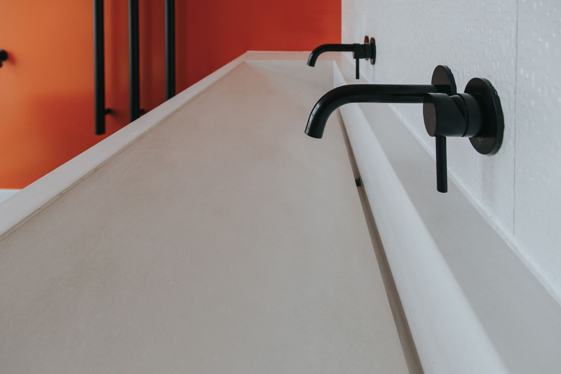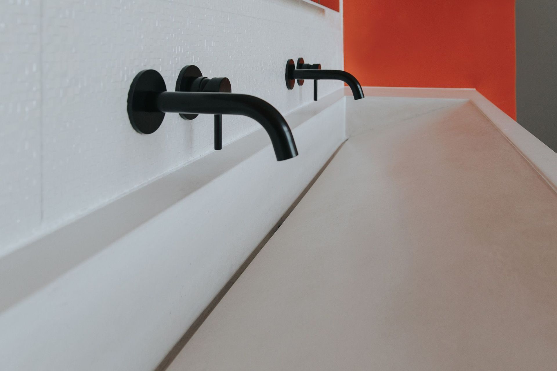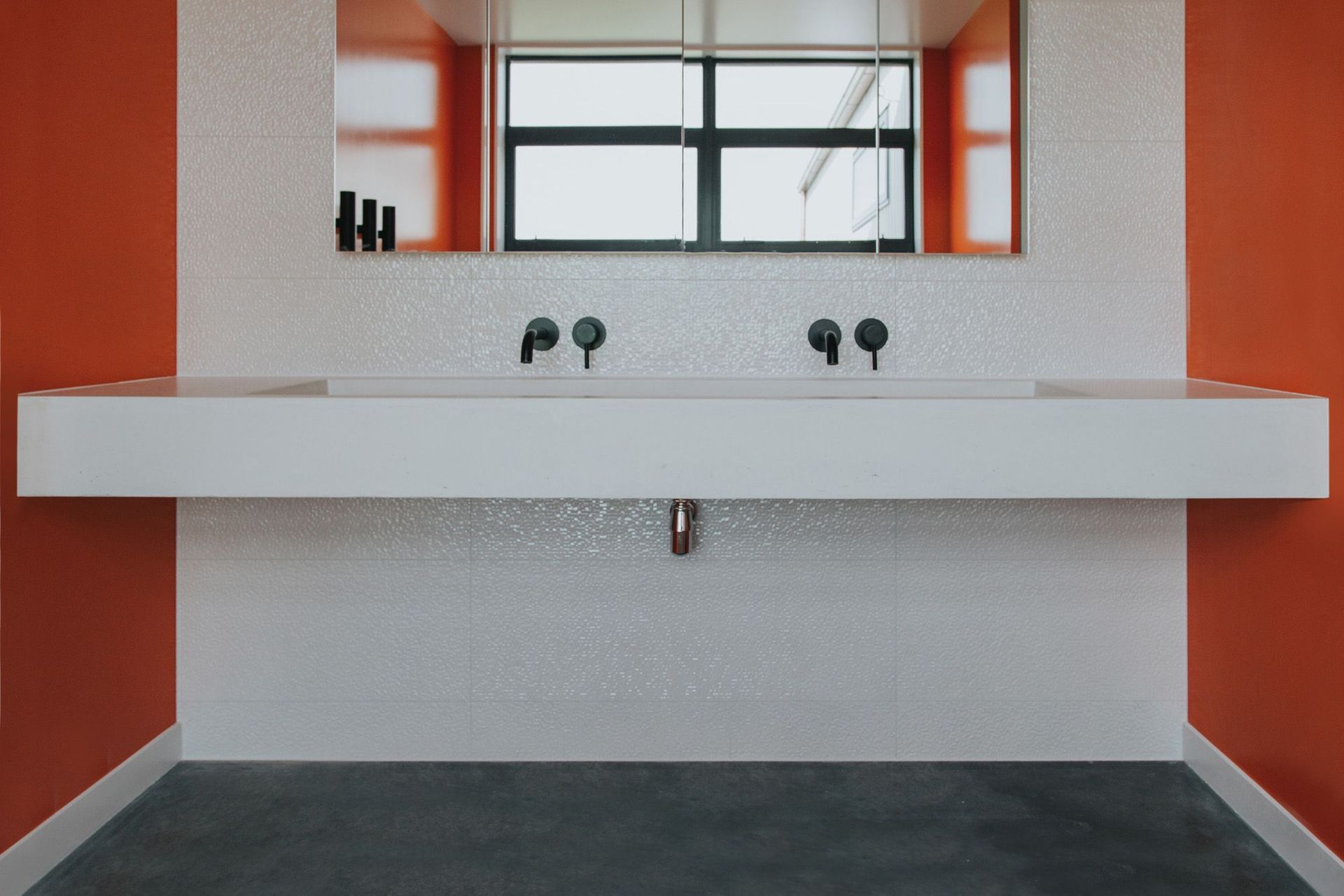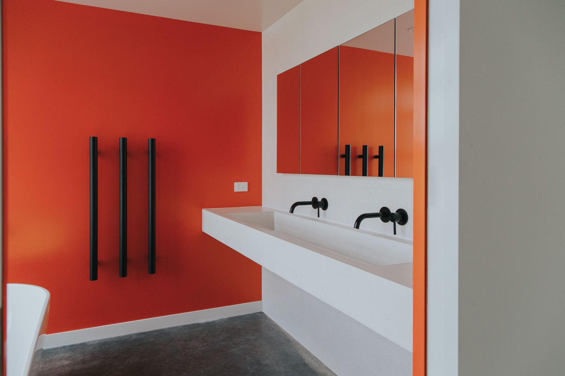ArchiPro Project Summary - A vibrant and modern bathroom design featuring bold orange accents and innovative storage solutions.