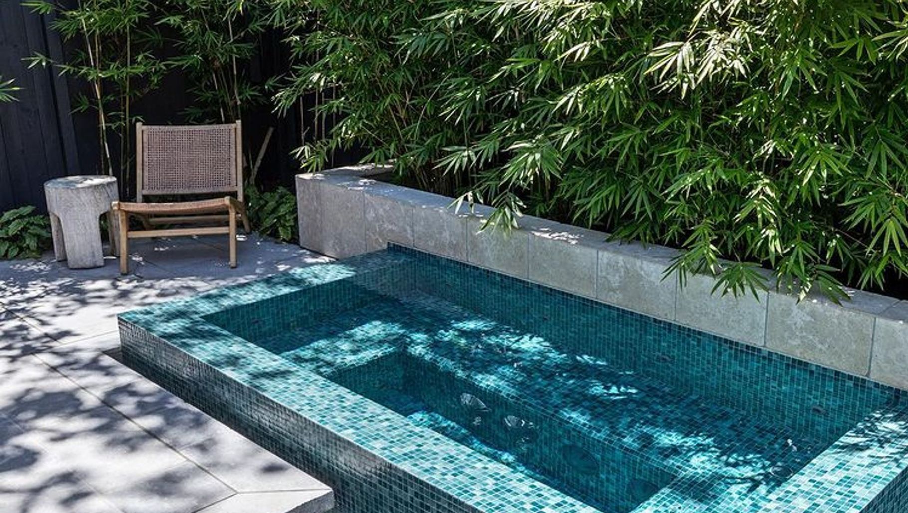 ArchiPro Project Summary - A stunning integration of pool, spa, and outdoor shower in a compact landscape, featuring Pietra Grigio and Sinai White limestone for durability and elegance, expertly designed by Sabo Design and installed by Butterworth Landscapes and Apex Pools and Spas.