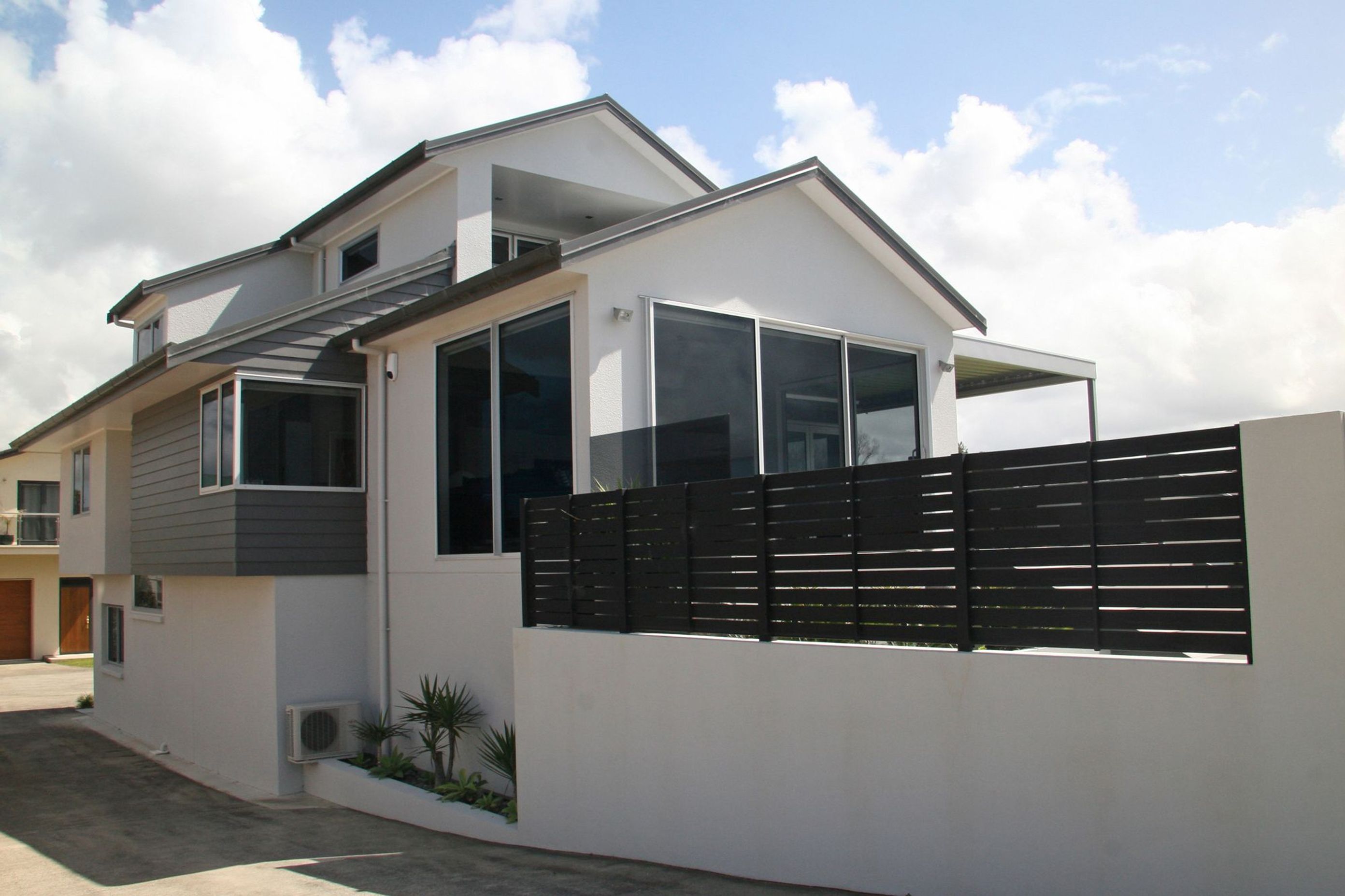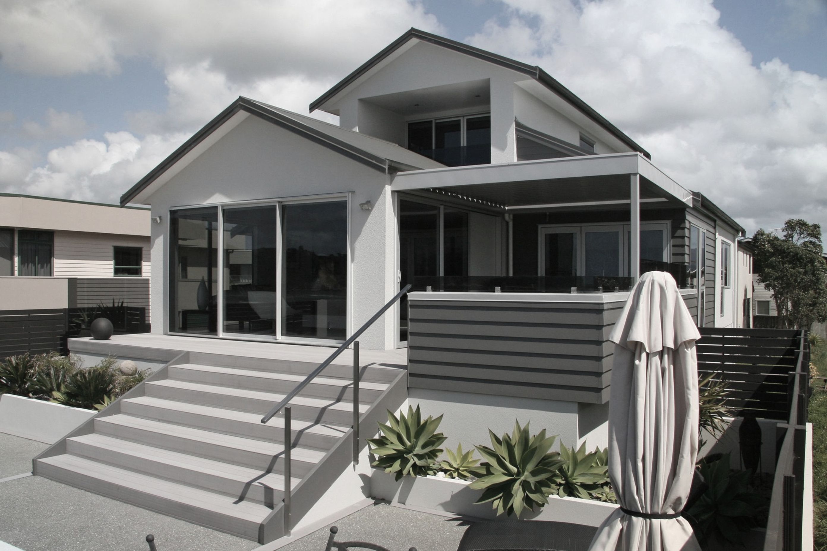 ArchiPro Project Summary - Major renovation of a coastal home featuring new Linea Weatherboard & Plaster cladding, updated roofing, and aluminium joinery, resulting in a stunning modern residence with breathtaking ocean views.