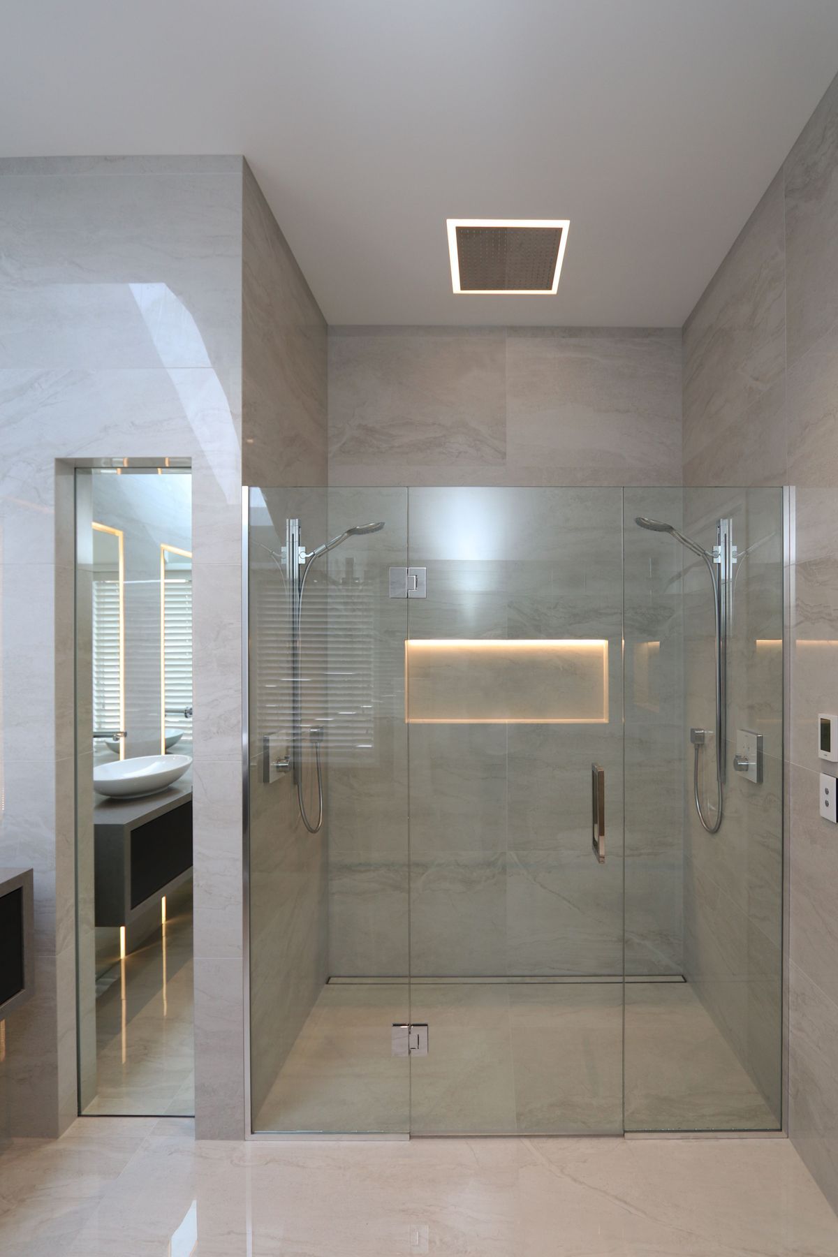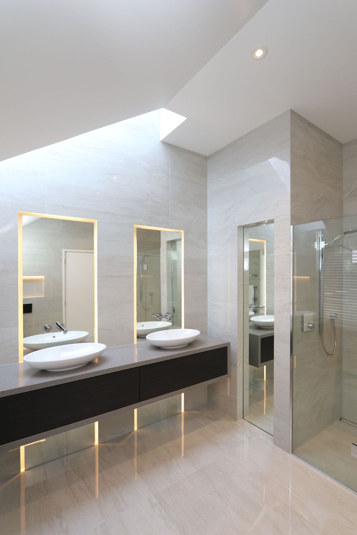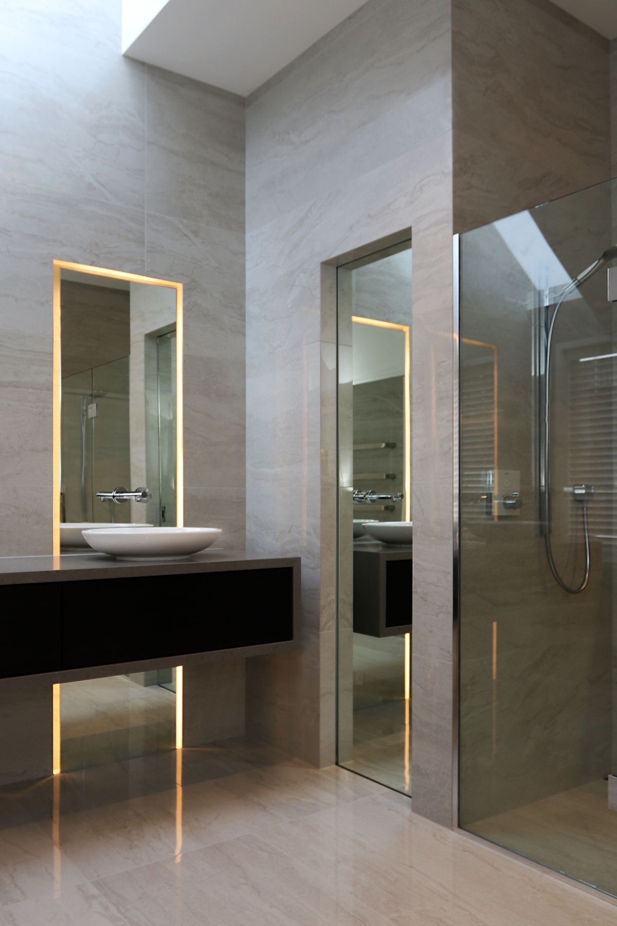 ArchiPro Project Summary - A bespoke design at Burford Place, featuring luxurious gloss tiles, striking floor-length mirrors, and a dark angular vanity, all harmoniously combined to create an indulgent and warm atmosphere with double fixtures and recessed LED lighting.