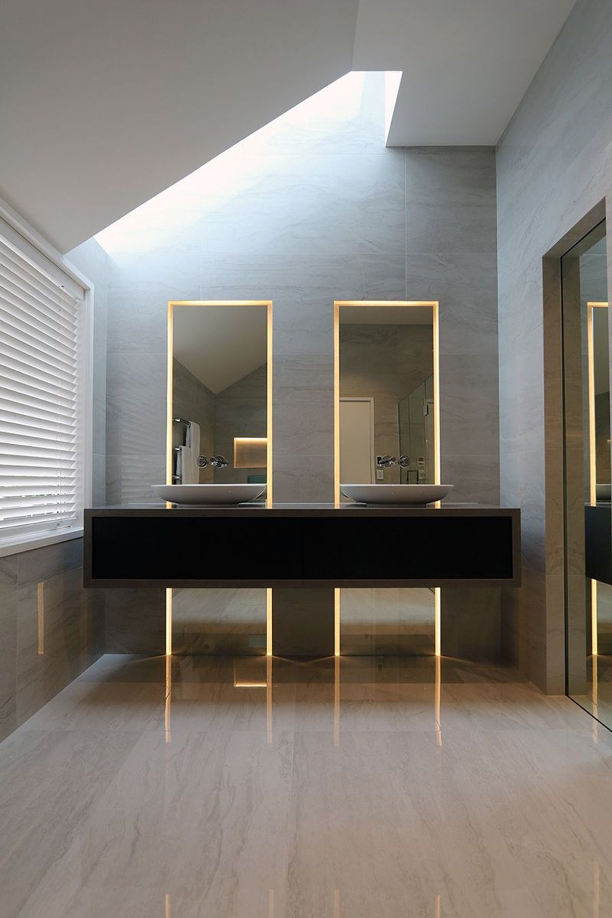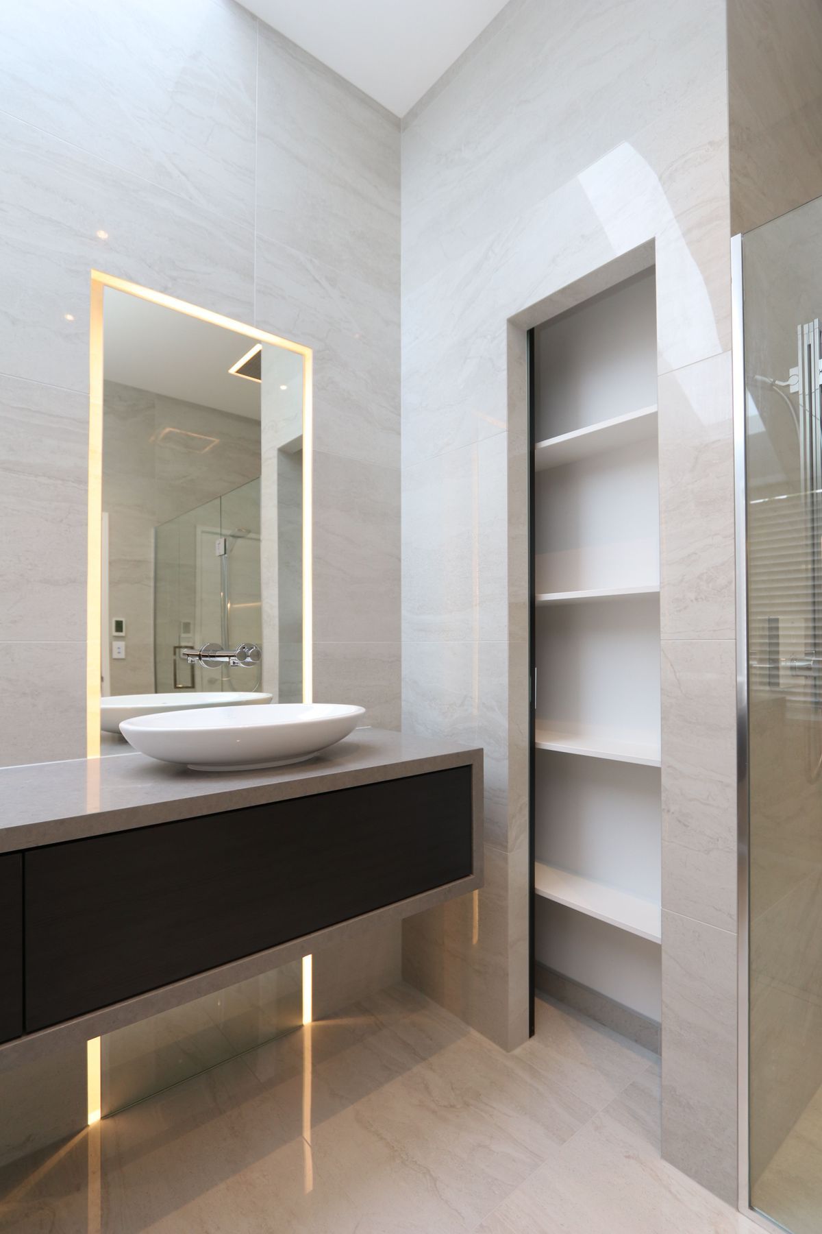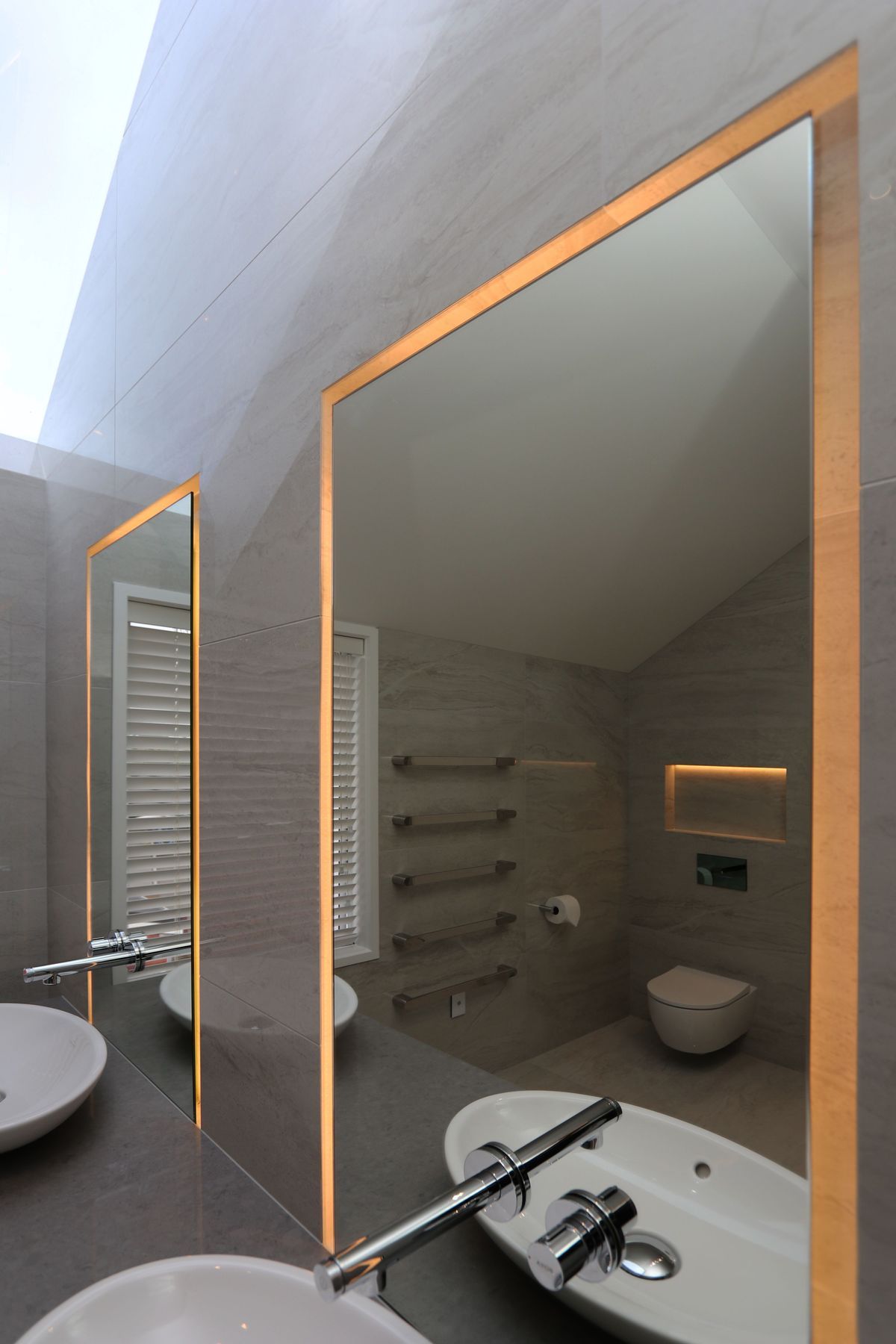 ArchiPro Project Summary - A bespoke design at Burford Place, featuring luxurious gloss tiles, striking floor-length mirrors, and a dark angular vanity, all harmoniously combined to create an indulgent and warm atmosphere with double fixtures and recessed LED lighting.