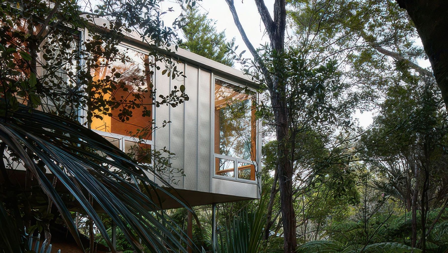 This single storey residence floats on slender steel poles above the gully below, avoiding both the flood plane and the need for any excavation on this bushy corner site.