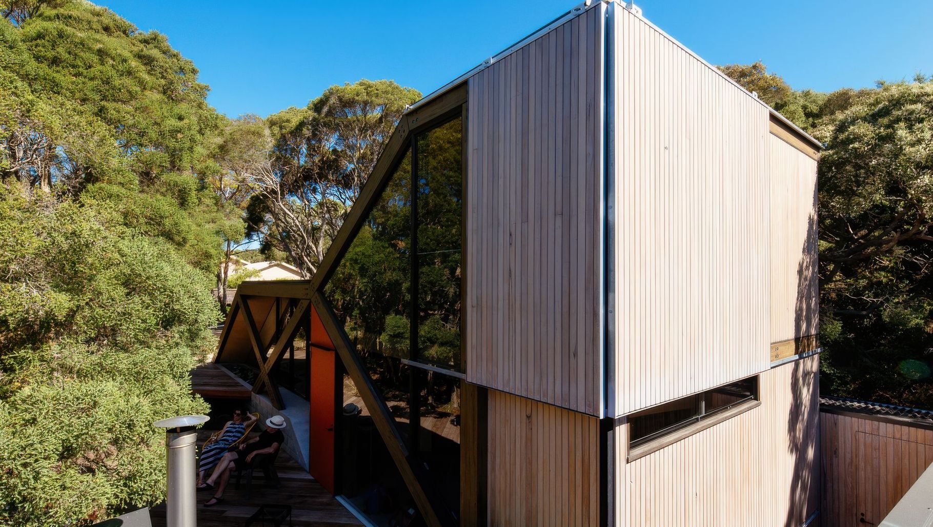 ArchiPro Project Summary - Self-contained extension to a 1960s log cabin, seamlessly integrated into the coastal Moonah woodland, featuring a folding roof that reflects the landscape and an exposed skeletal frame for structural honesty.