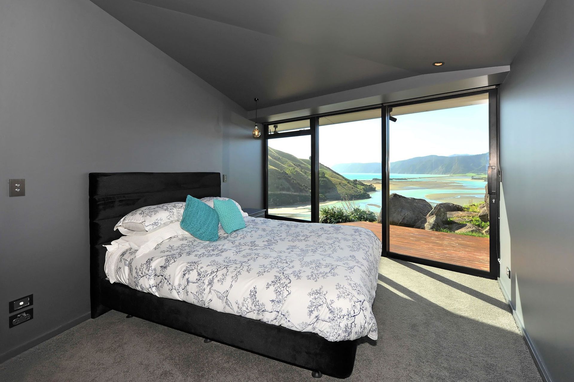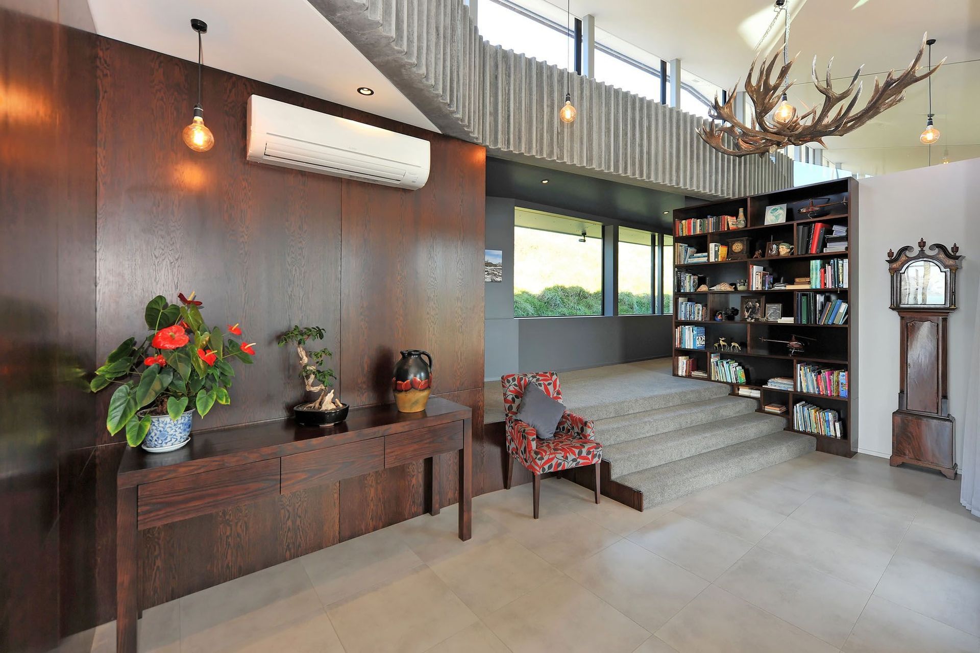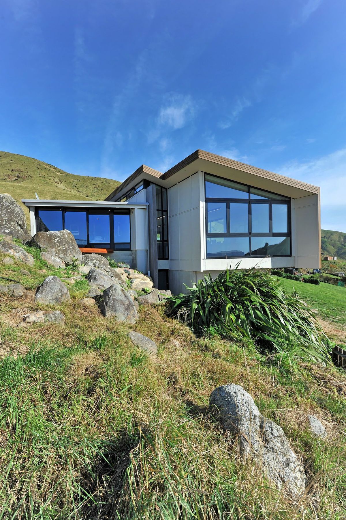 ArchiPro Project Summary - A stunning new build by Jeremy Smith of Irving Smith Architects, Cable Bay House harmoniously integrates with its rocky hillside surroundings, featuring a unique internal fluted concrete beam and a cedar screen, all while offering breathtaking views.