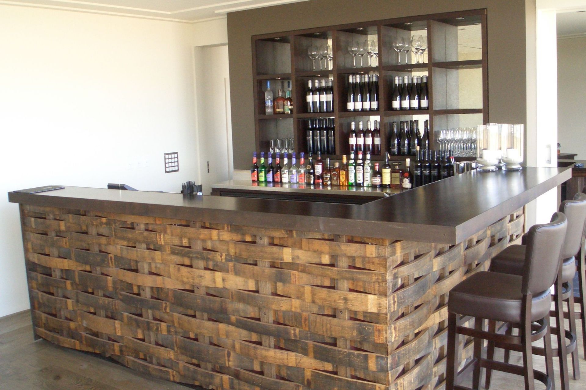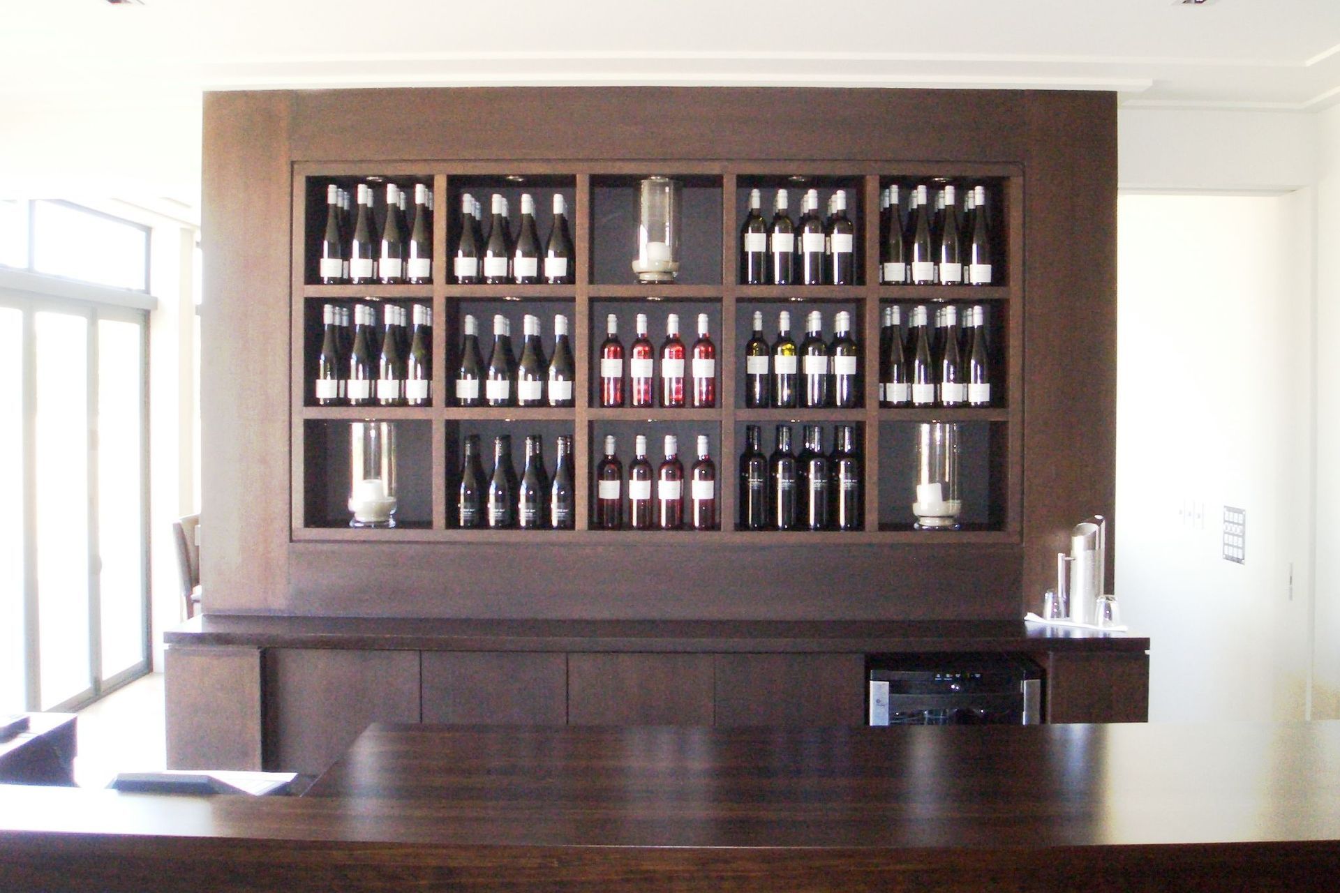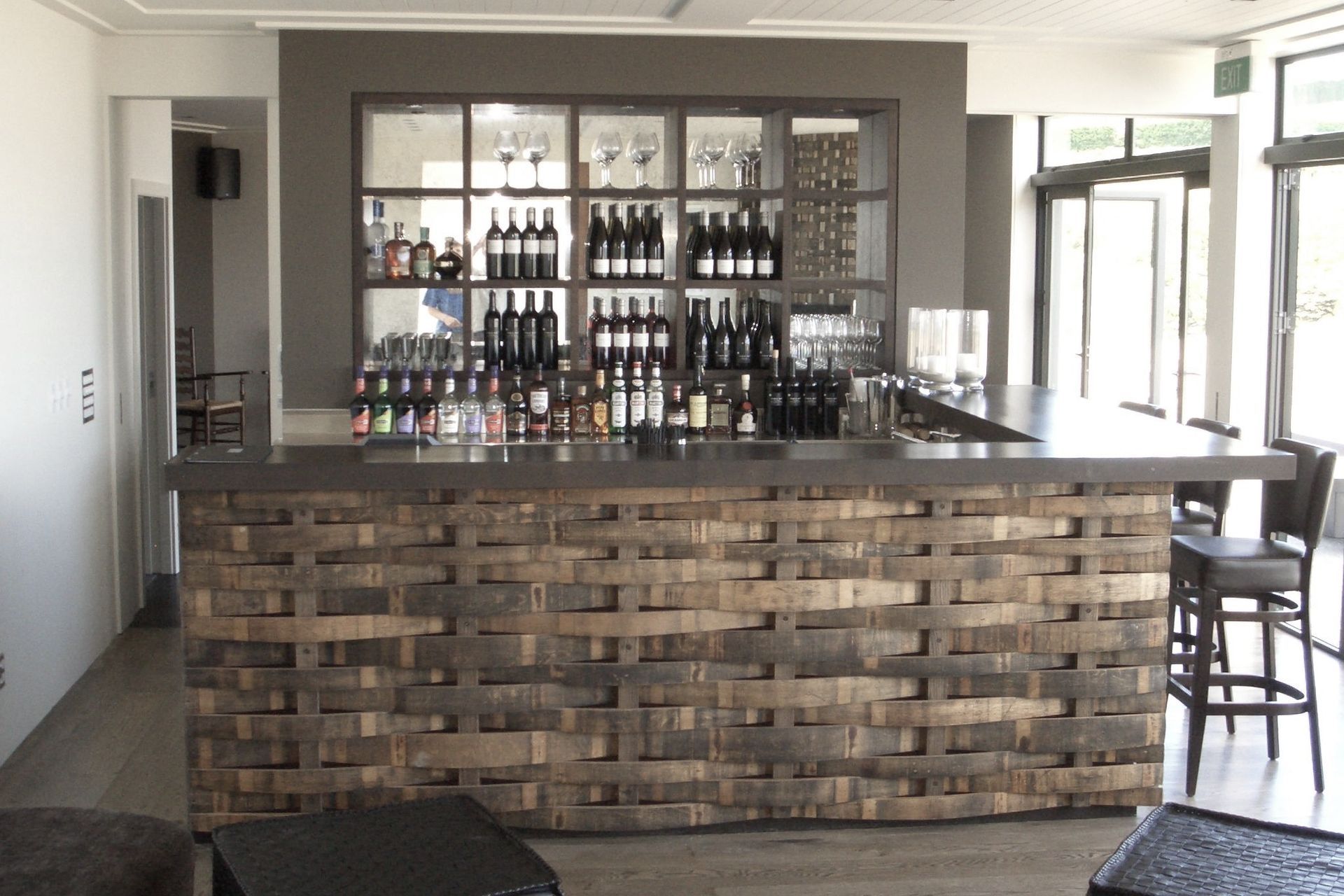 ArchiPro Project Summary - Award-winning vineyard on Waiheke Island featuring bespoke joinery, including a bar crafted from reclaimed oak wine barrels and custom installations throughout the restaurant, entrance, wine tasting room, barrel room, and board room.