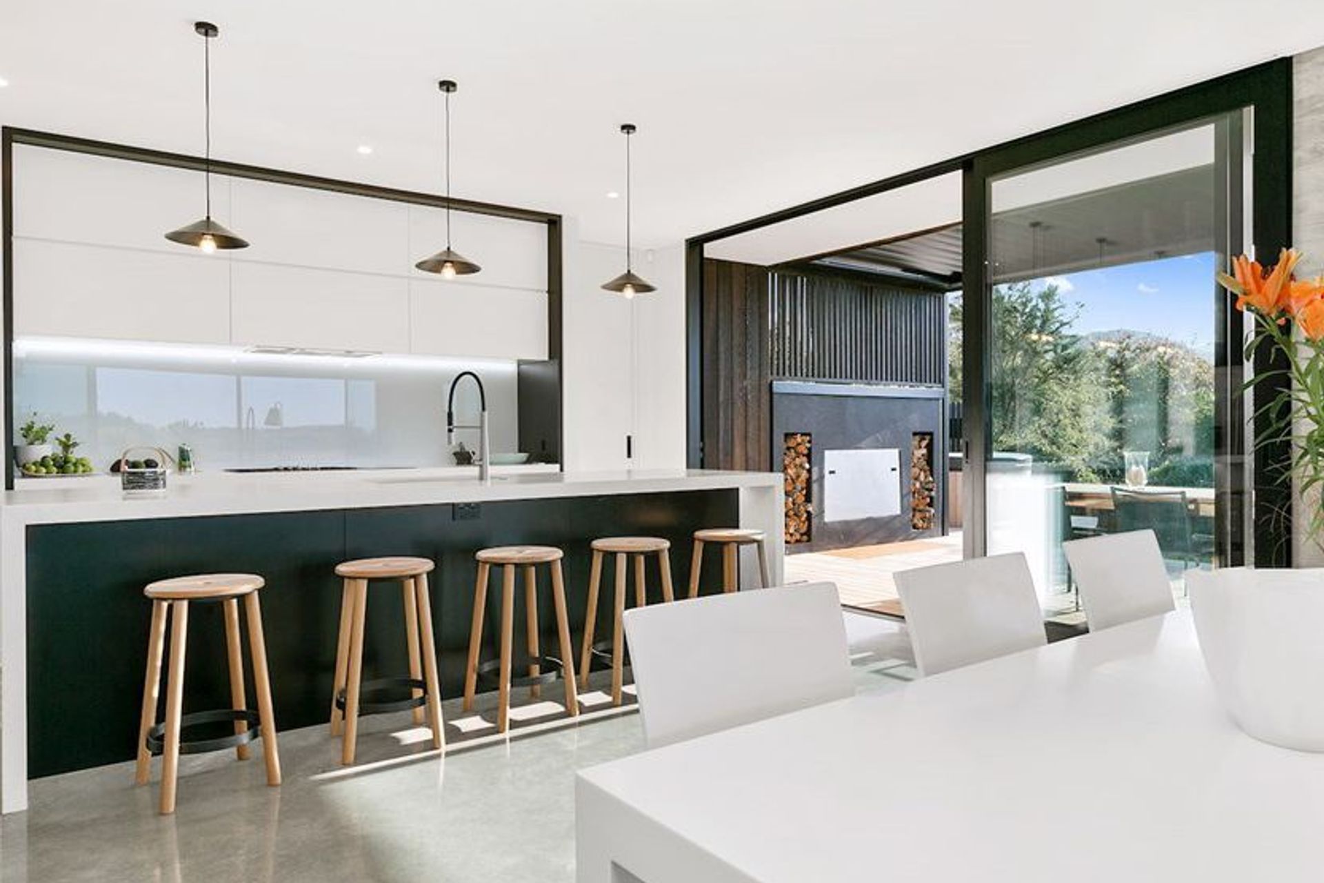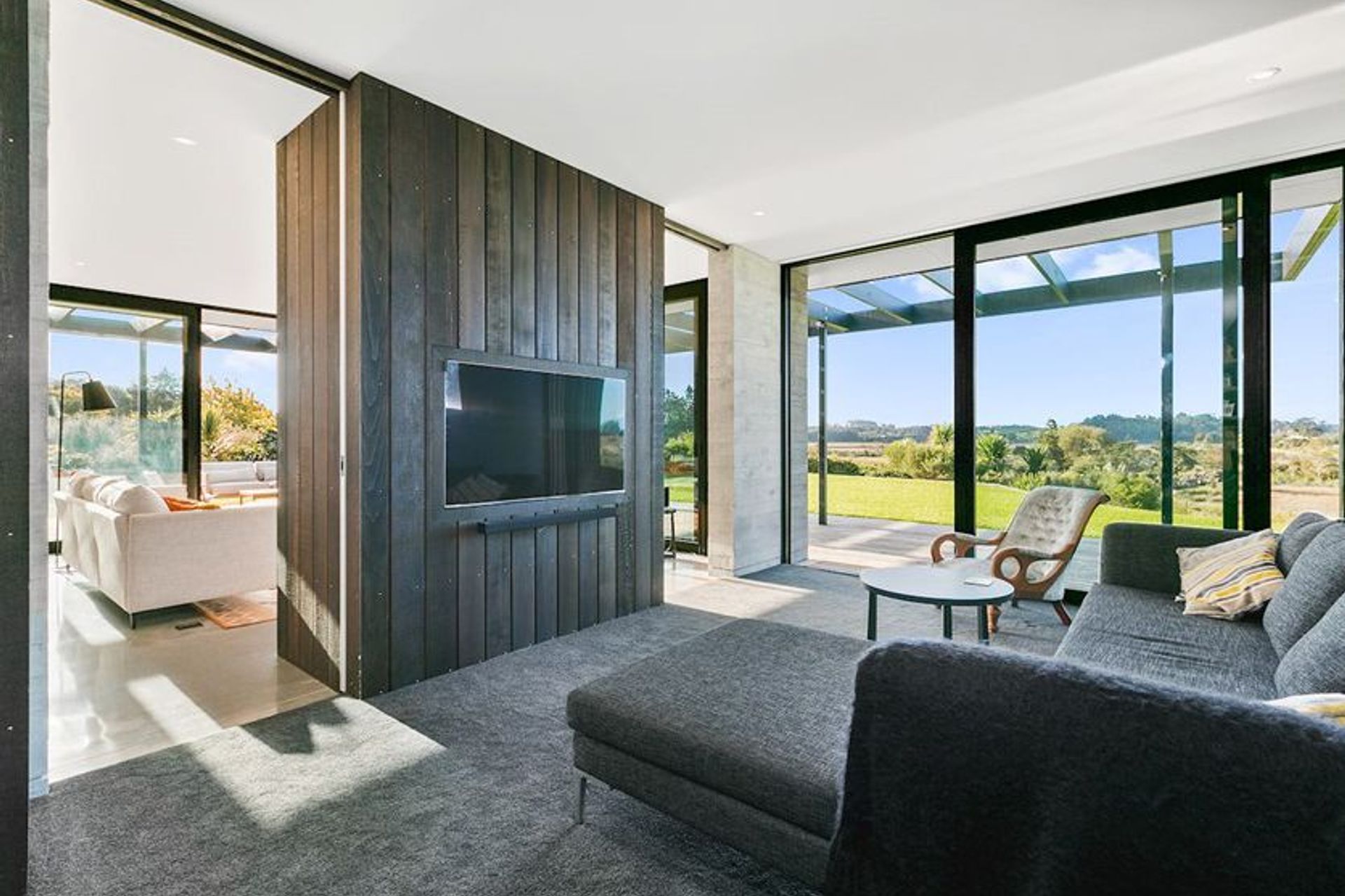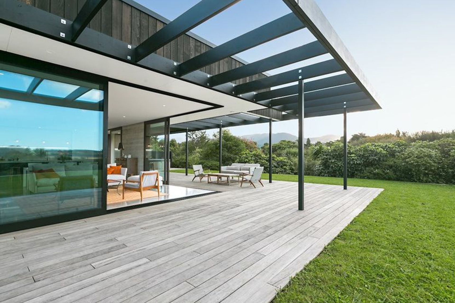 ArchiPro Project Summary - A Gold Award Winning contemporary home in Katikati, inspired by mid-century modern architecture, featuring clean lines, extensive glazing, and a seamless indoor-outdoor flow.