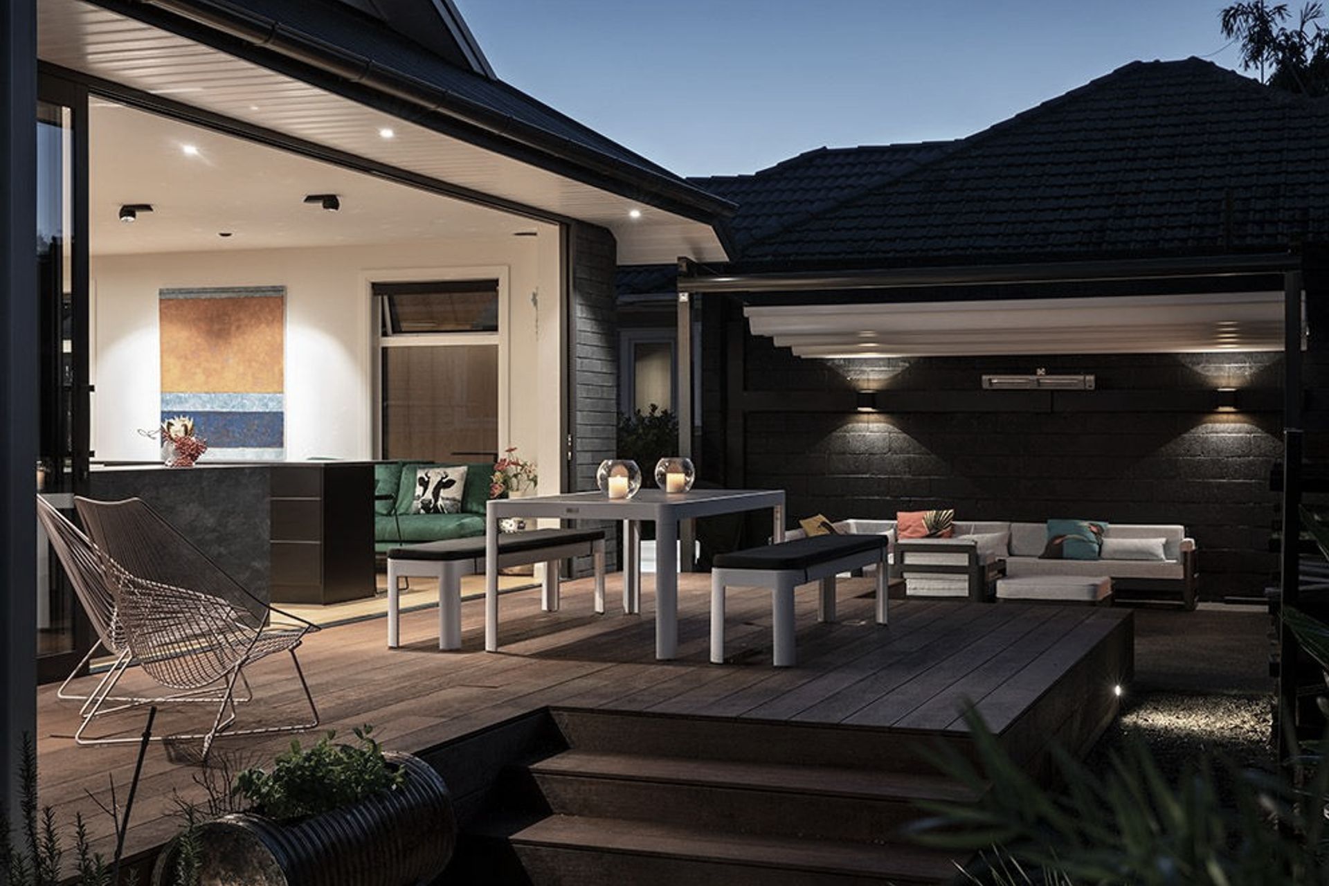 ArchiPro Project Summary - Cambourne Rd features hardwood flooring and a shaded deck, blending modern design with natural materials.