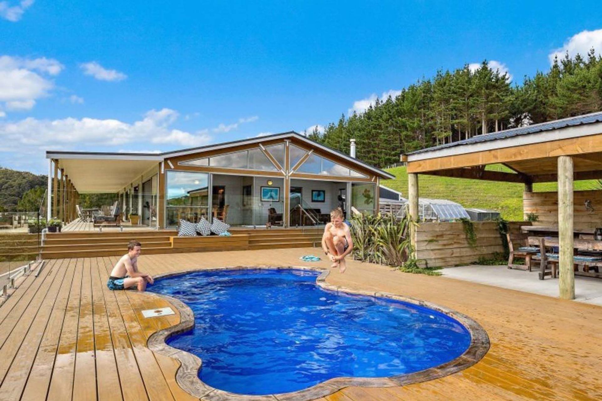 ArchiPro Project Summary - Spacious country homestead featuring 4 bedrooms, 2 bathrooms, inviting covered decks, and unique outdoor entertaining spaces, including a pizza oven and a distinctive pool design, all crafted with quality wood finishes.