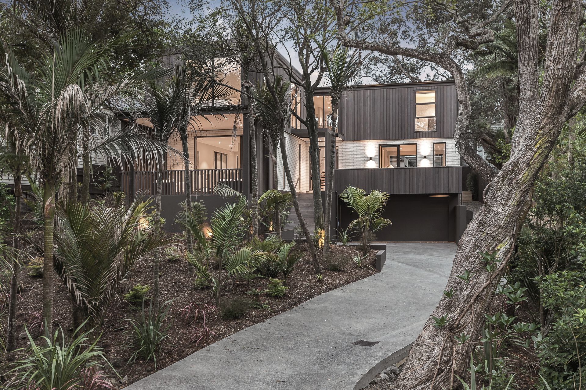 ArchiPro Project Summary - A harmonious residence nestled in native bush, featuring an L-shaped design that maximizes views and outdoor living, complemented by carefully selected materials and award-winning architectural excellence.