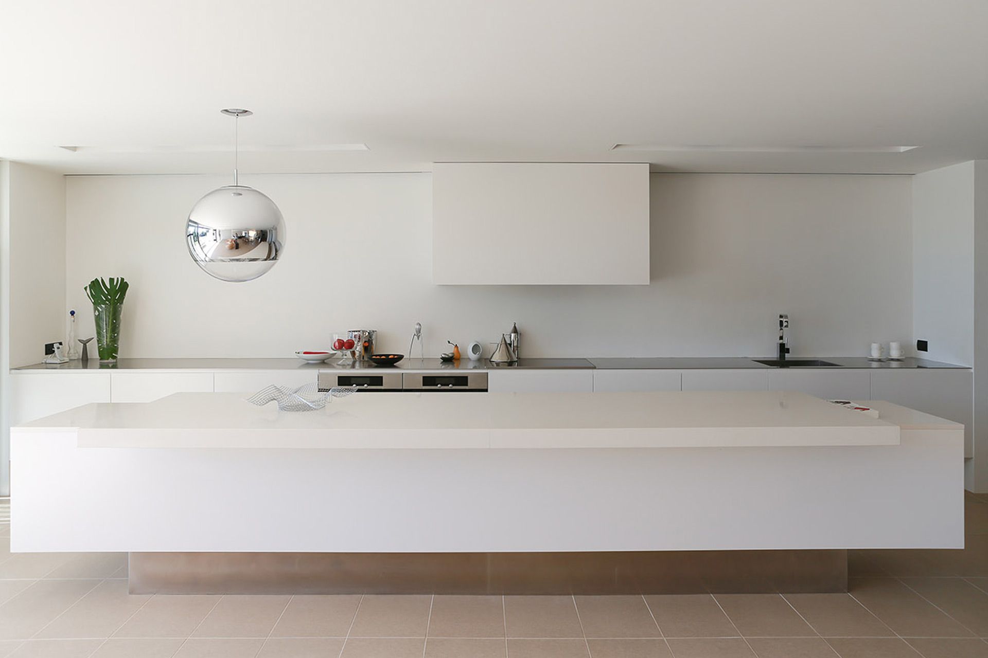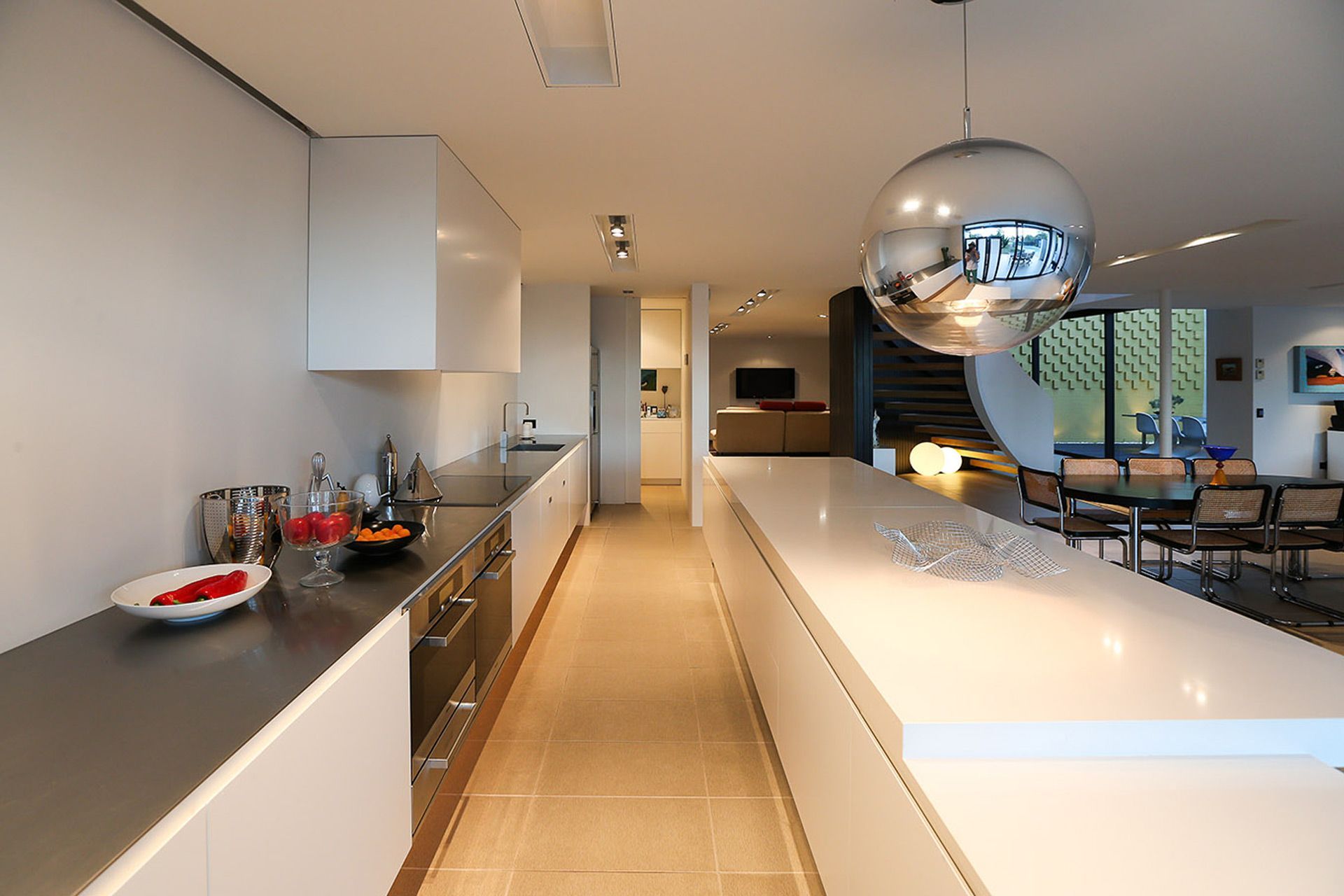 ArchiPro Project Summary - A striking Campbells Bay kitchen featuring a minimalist design with retro 70s influences, crafted from elegant granite and stainless steel, embodying the strong, elemental shapes of Geoff Ward's architectural vision.