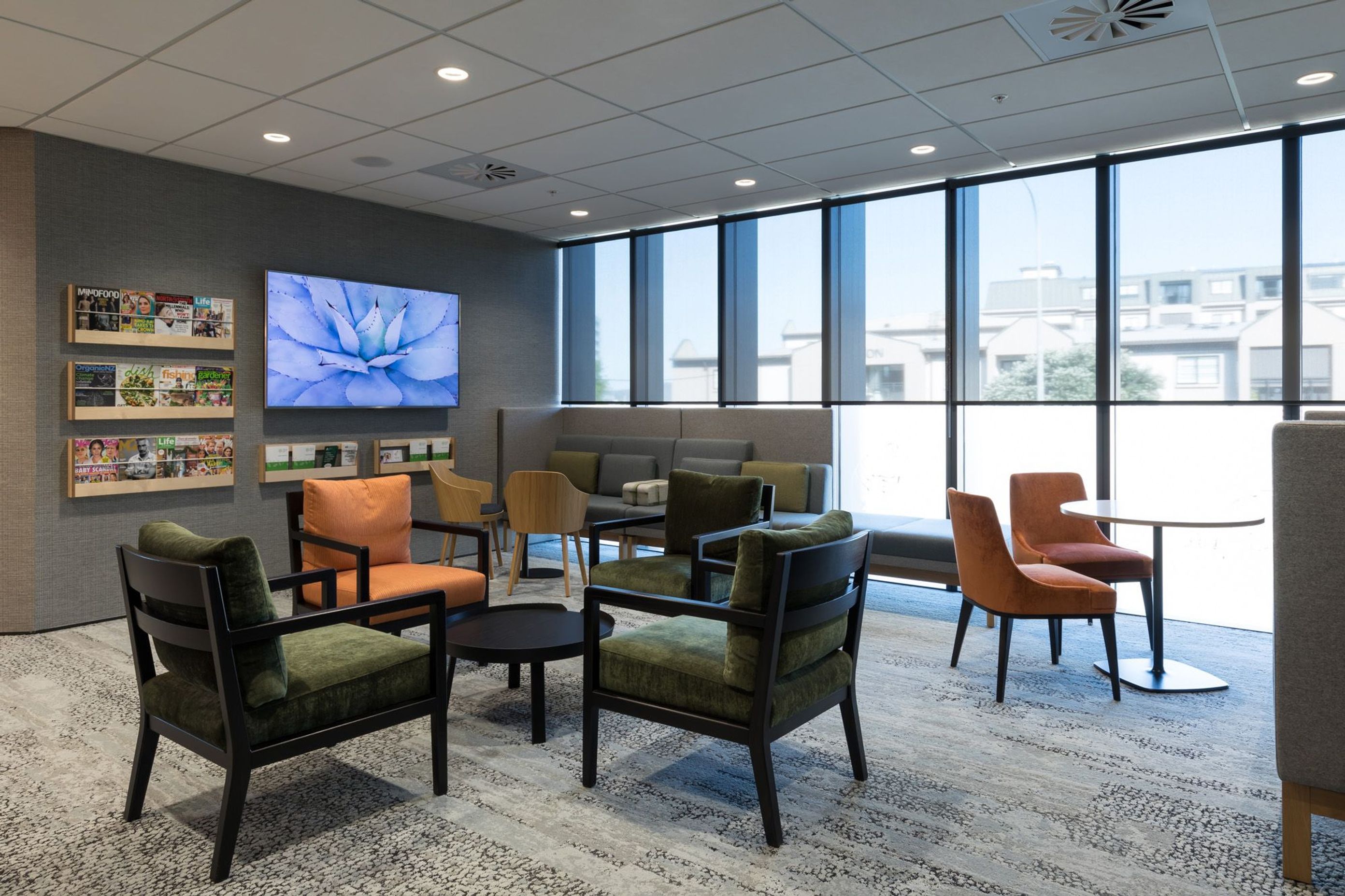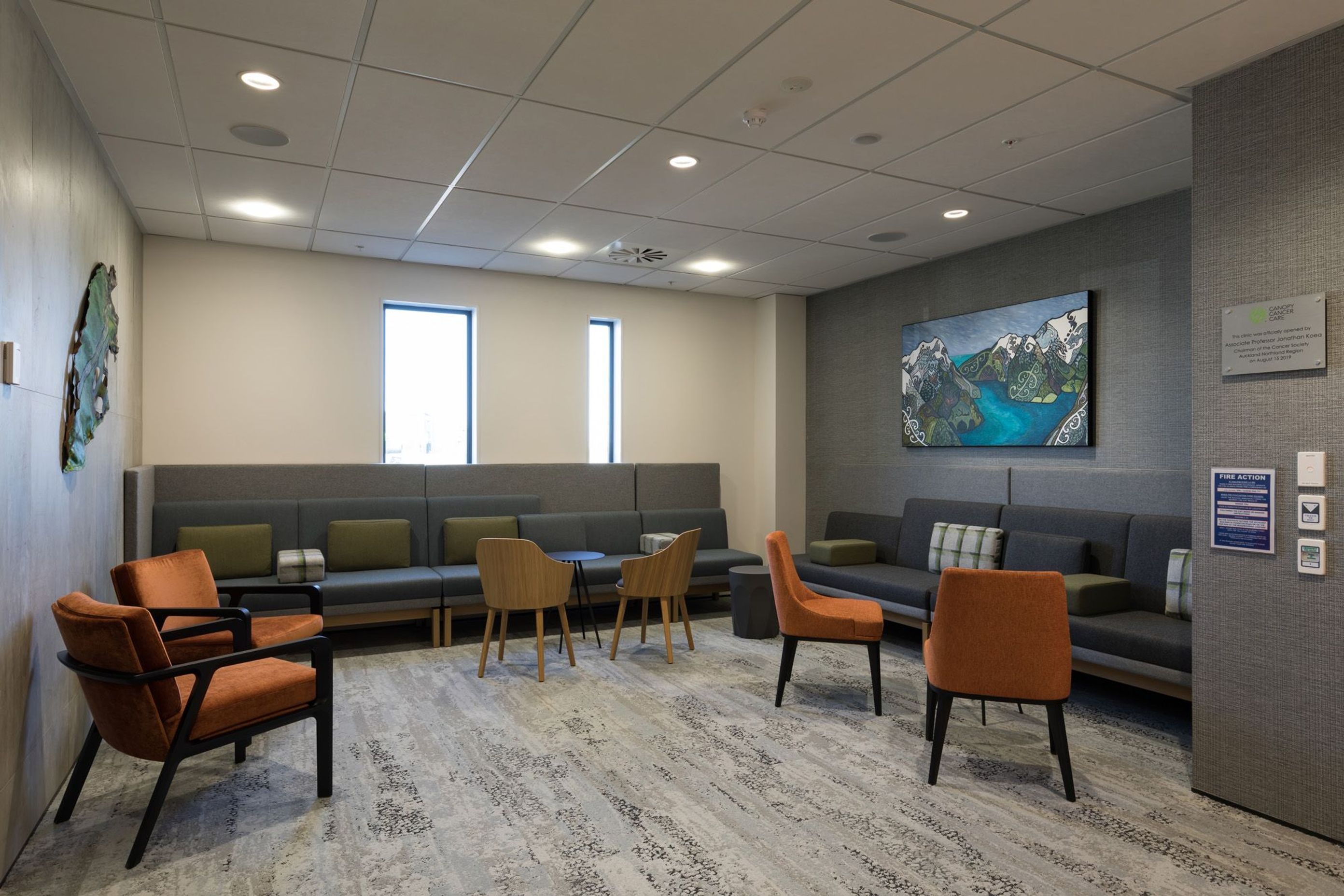 ArchiPro Project Summary - Design and fitout of Canopy Cancer Care's Takapuna branch, blending contemporary fixtures with a homely character to create a comforting environment, featuring medical and surgical rooms, family areas, and vibrant design elements.