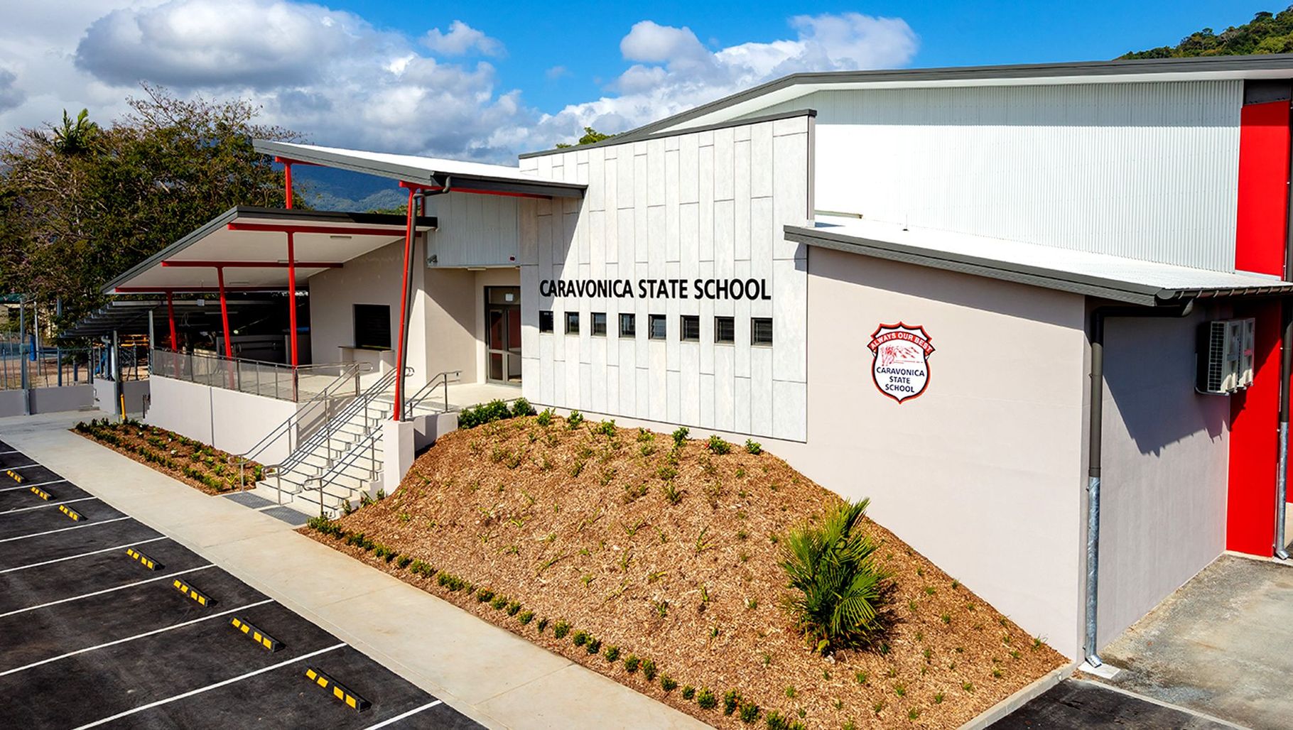 ArchiPro Project Summary - Caravonica State School Sports Hall features a contemporary design that harmonizes with its surroundings, utilizing economical materials and innovative design elements such as plywood panelling and bold red structural columns, while maximizing ventilation and shading.