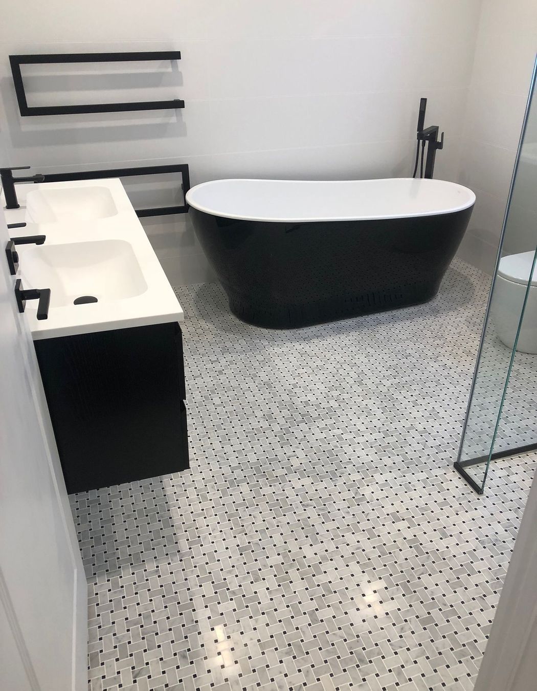 ArchiPro Project Summary - Elegant Carrara tiled bathroom featuring a stunning mosaic weave floor and sleek matt white wall tiles for a sophisticated and timeless aesthetic.