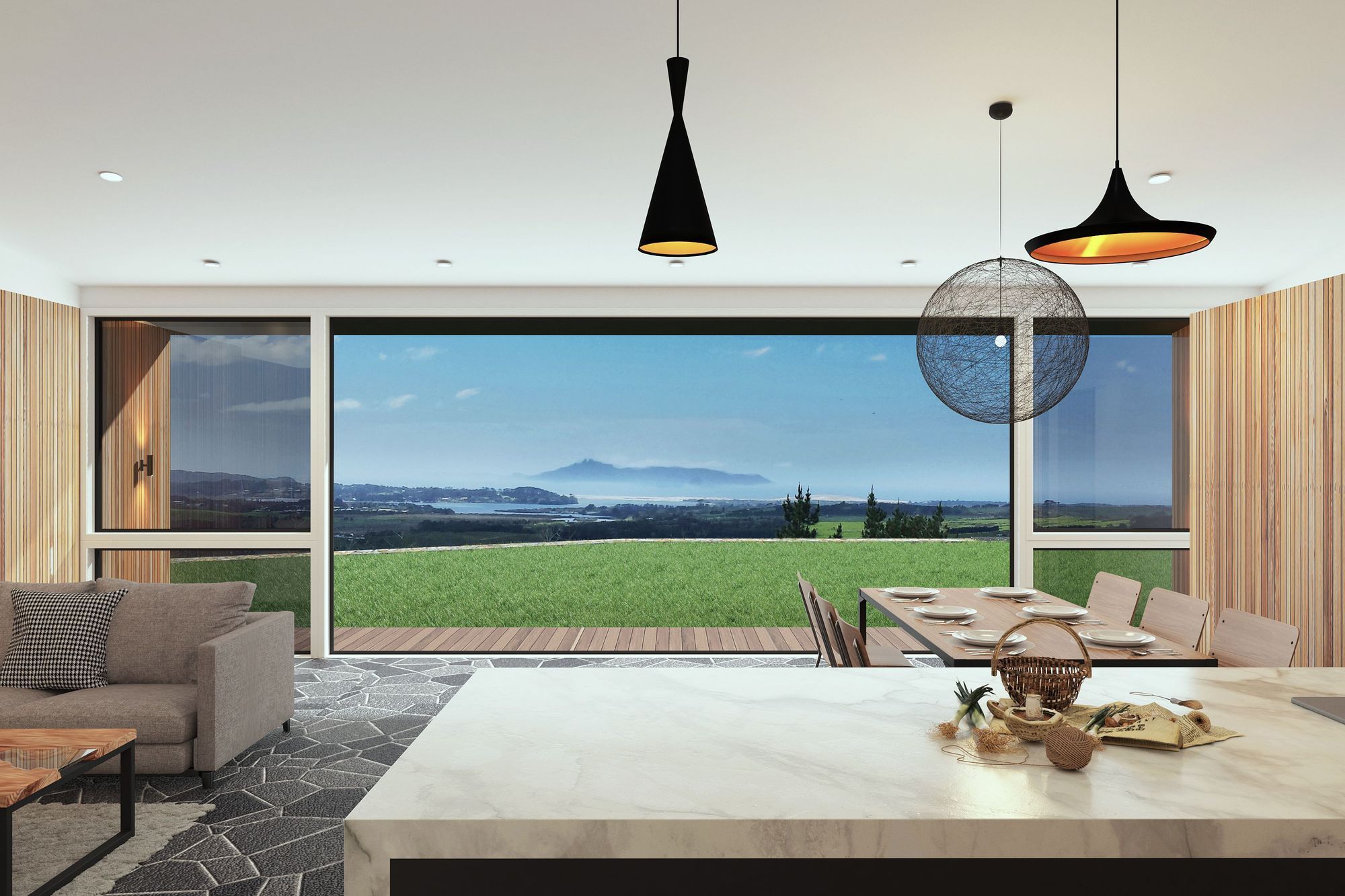 ArchiPro Project Summary - A stunning modern family home in Mangawhai, featuring detailed 3D imagery that captures breathtaking views, custom cedar cladding, and realistic interior lighting, all developed in collaboration with Gubb Design.