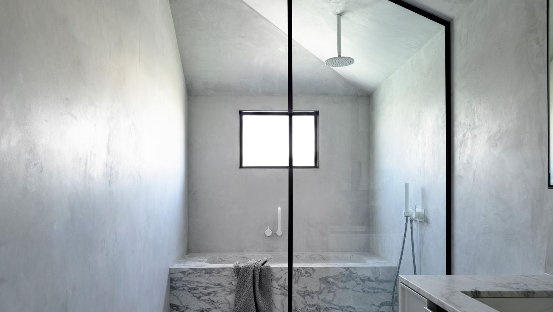 ArchiPro Project Summary - Casa Atrio by Biasol harmoniously blends classic Italian architecture with French design, featuring a light-filled bathroom adorned with elegant marble and X-bond in Haze, complemented by chevron patterns, natural stones, and black-metal detailing for a refined finish.
