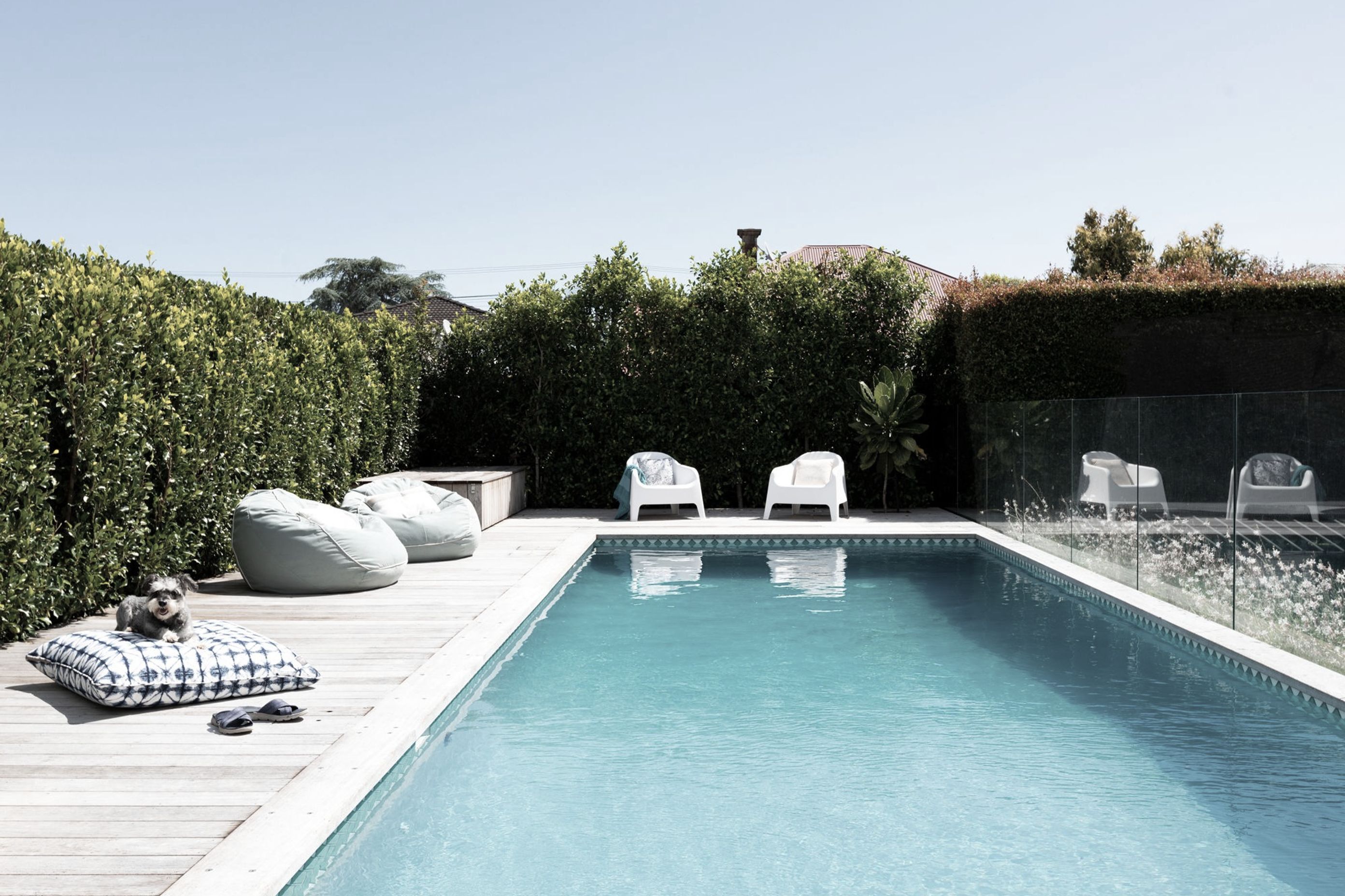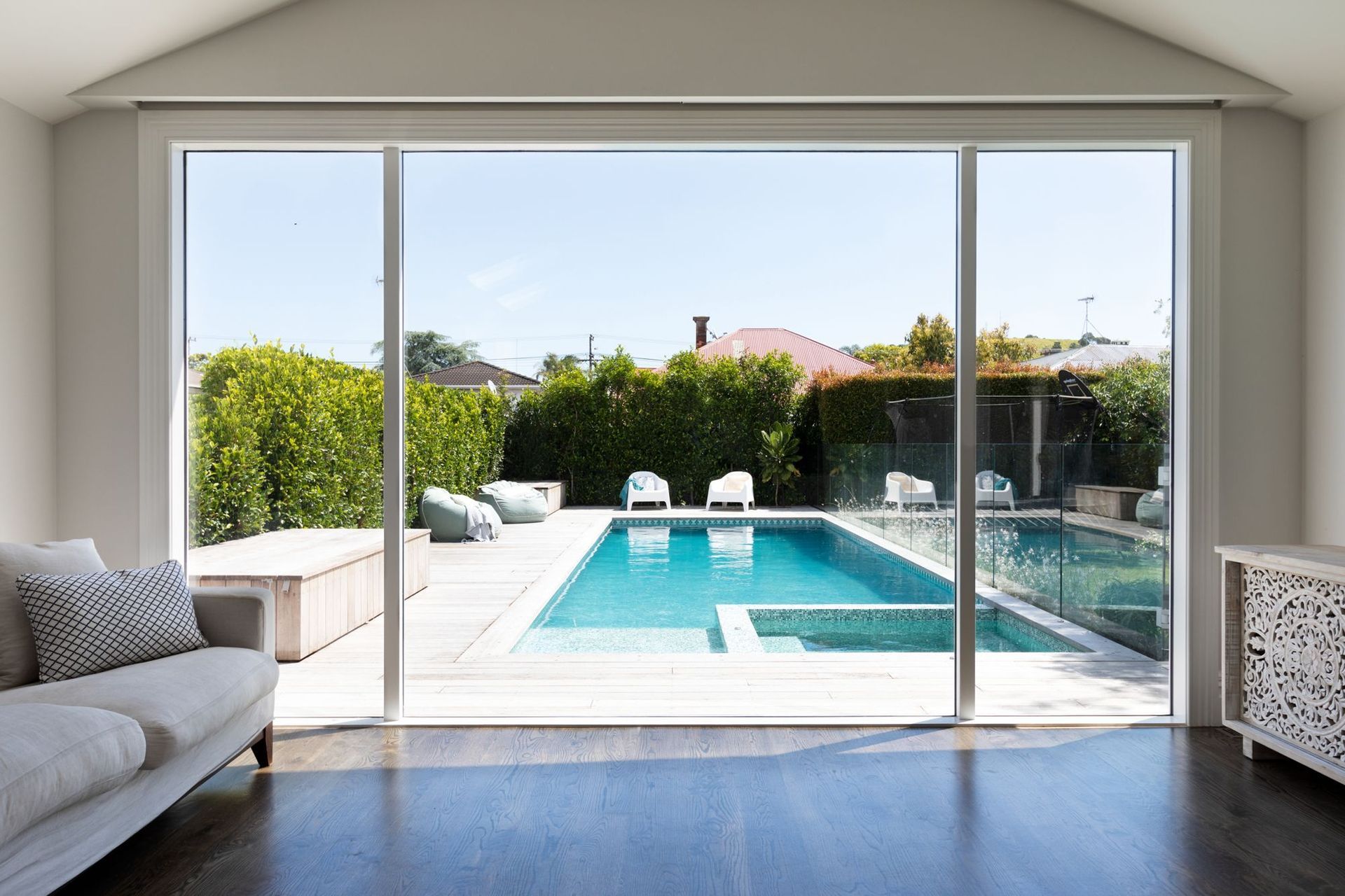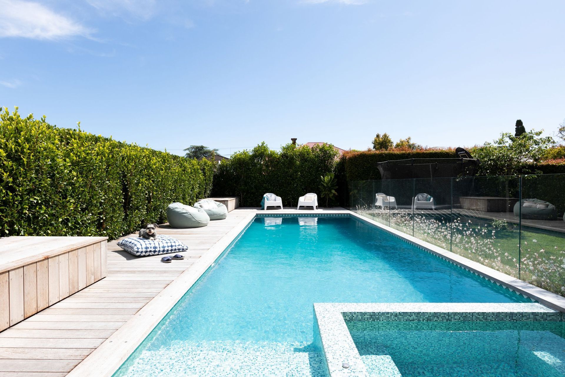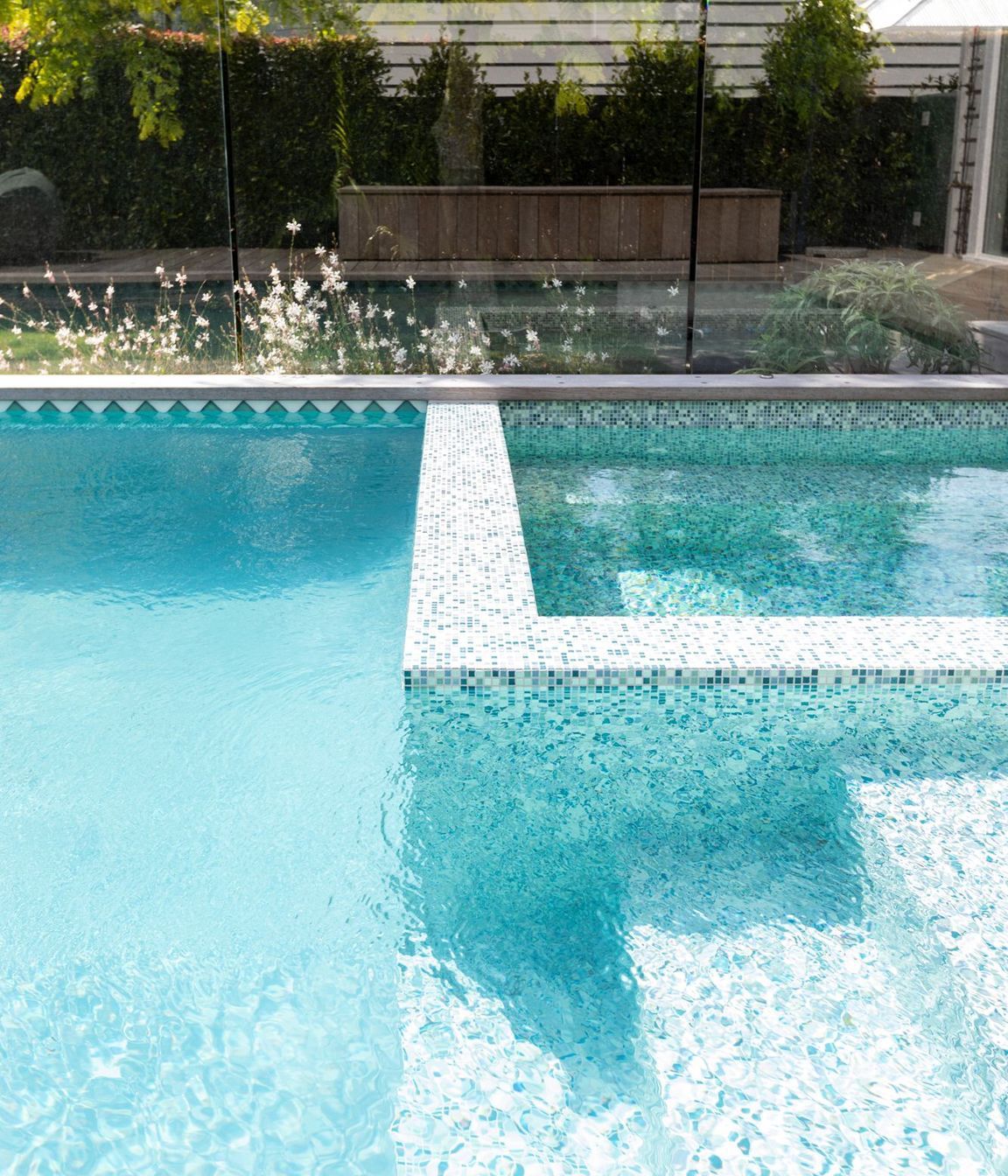 ArchiPro Project Summary - A stunning 13.5m x 4m pool and spa area designed for family gatherings, featuring vibrant tile patterns, a custom plaster blend, an impressive sound system, and layered lighting, seamlessly integrated with a large window for indoor-outdoor enjoyment.