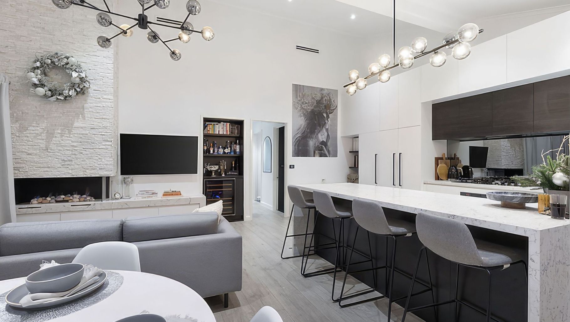 ArchiPro Project Summary - A stylish monochrome kitchen featuring a sleek study area, integrated appliances, and bespoke cabinetry, designed to enhance functionality and reflect the client's personality in the Cheltenham Residence.