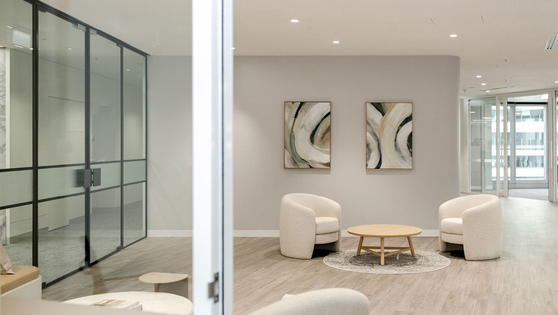ArchiPro Project Summary - Chifley Tower: A stunning architectural landmark in Sydney's commercial hub, featuring sleek design elements and contemporary furnishings, expertly transformed by McCormack and Strutt Studios, showcasing GlobeWest products throughout the foyer and office spaces.
