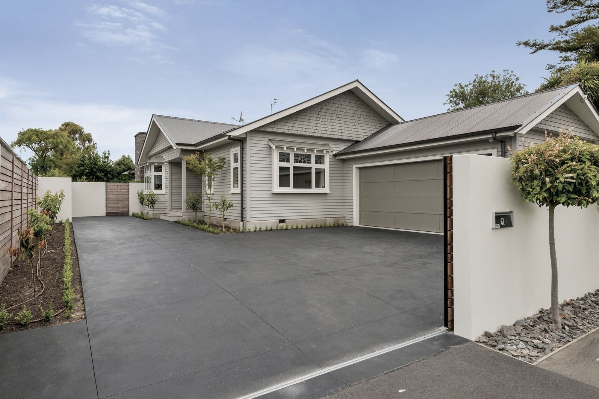 ArchiPro Project Summary - The Christchurch Home features modern design with grey siding and a stylish garage door, complemented by a concrete driveway.