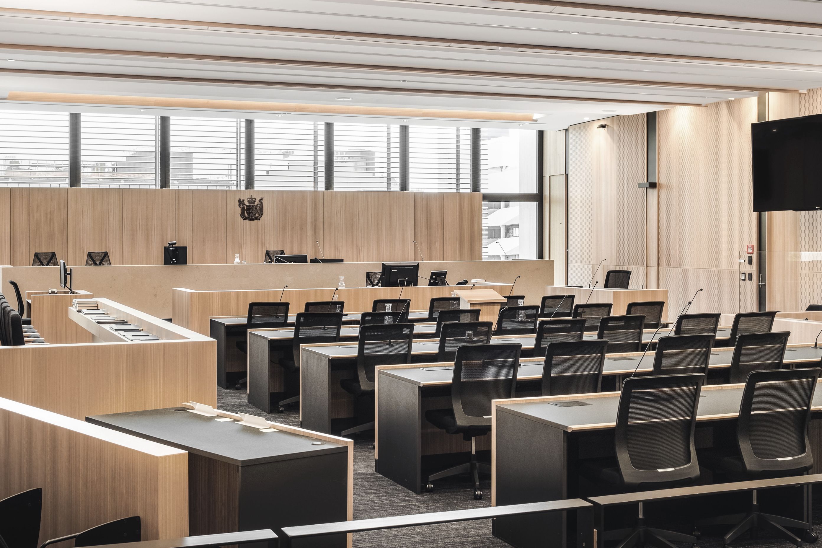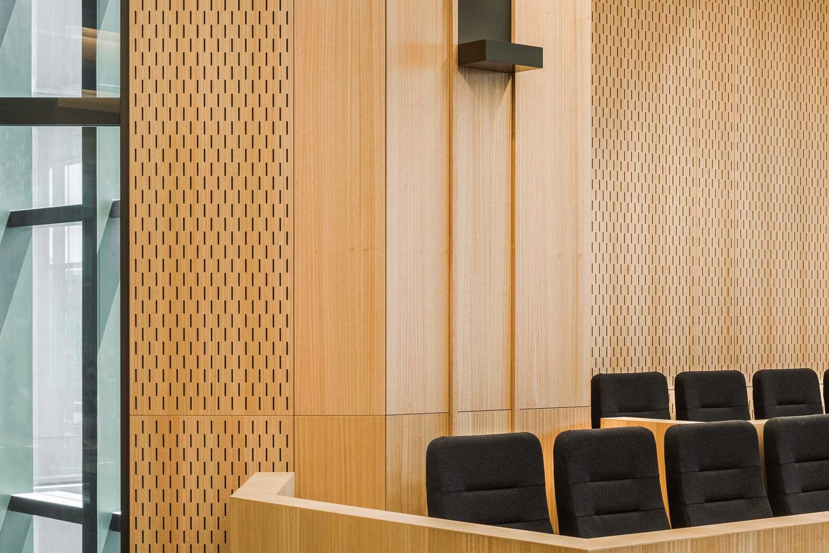 ArchiPro Project Summary - Christchurch Justice Precinct showcases exquisite Eucalyptus Ash veneer in wall and ceiling panelling, along with courtroom furniture and cabinetry, enhancing the space with fire-retardant natural MDF panels and decorative perforated patterns.