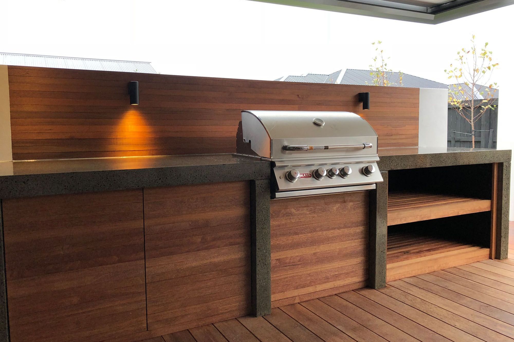 ArchiPro Project Summary - Contemporary courtyard featuring polished concrete bench, built-in BBQ with Kwila cabinetry, and striking lighting that enhances the space at night.