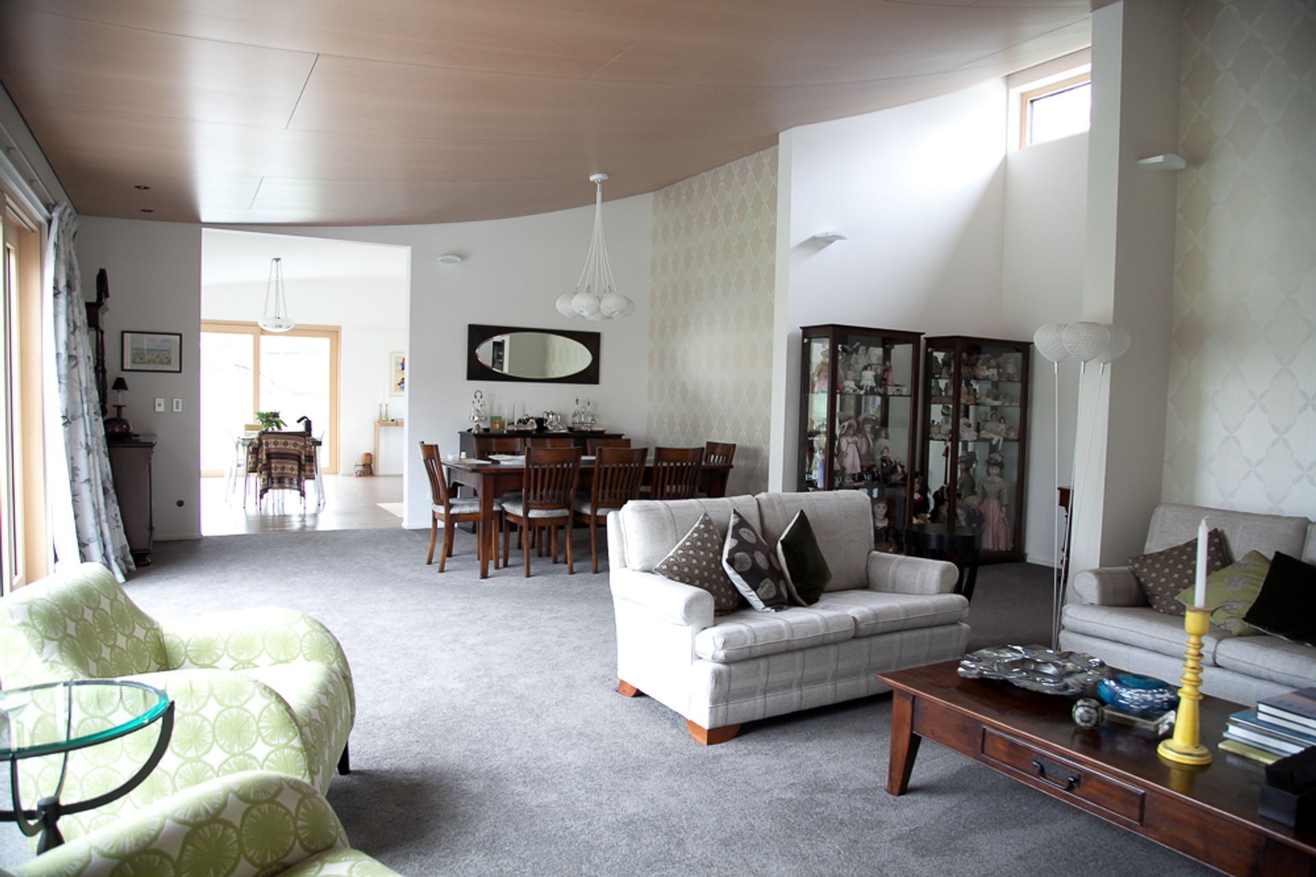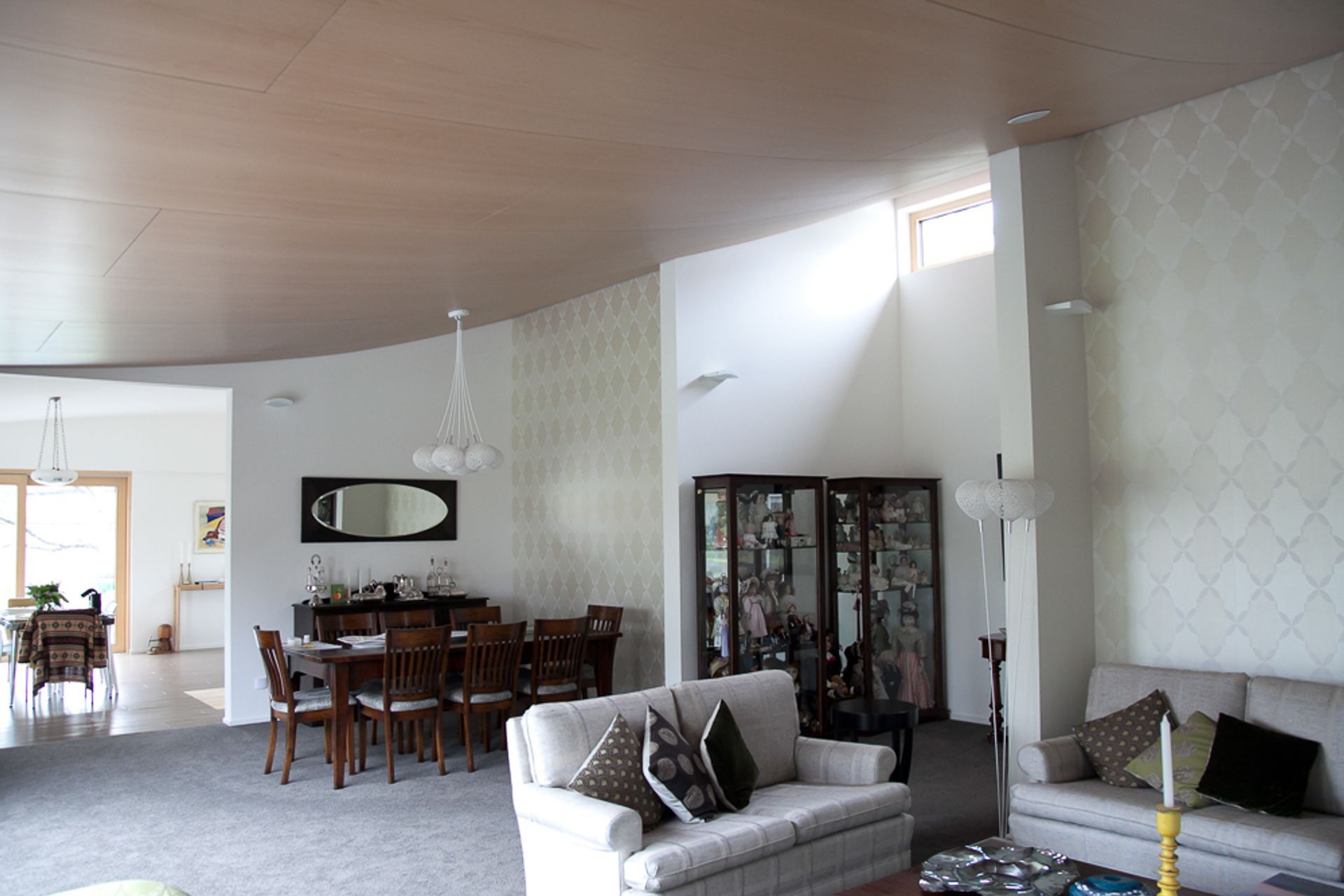ArchiPro Project Summary - A stunning architectural home featuring curved ply ceilings, cedar cladding, and top-tier appliances, achieving an impressive air change rate of 0.27 per hour, setting a new standard in New Zealand's building performance.