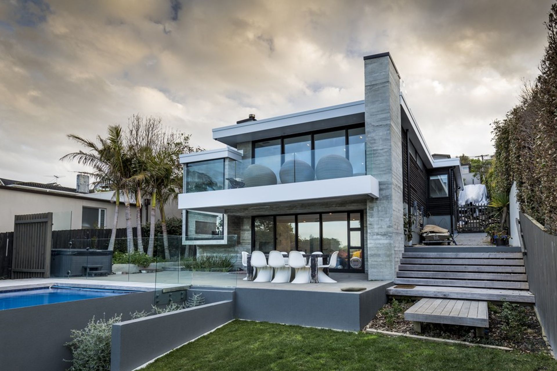 ArchiPro Project Summary - A contemporary 400m2 residence featuring a three-level open plan layout, complemented by cantilever concrete decks, a swimming pool, and inviting entertaining areas.
