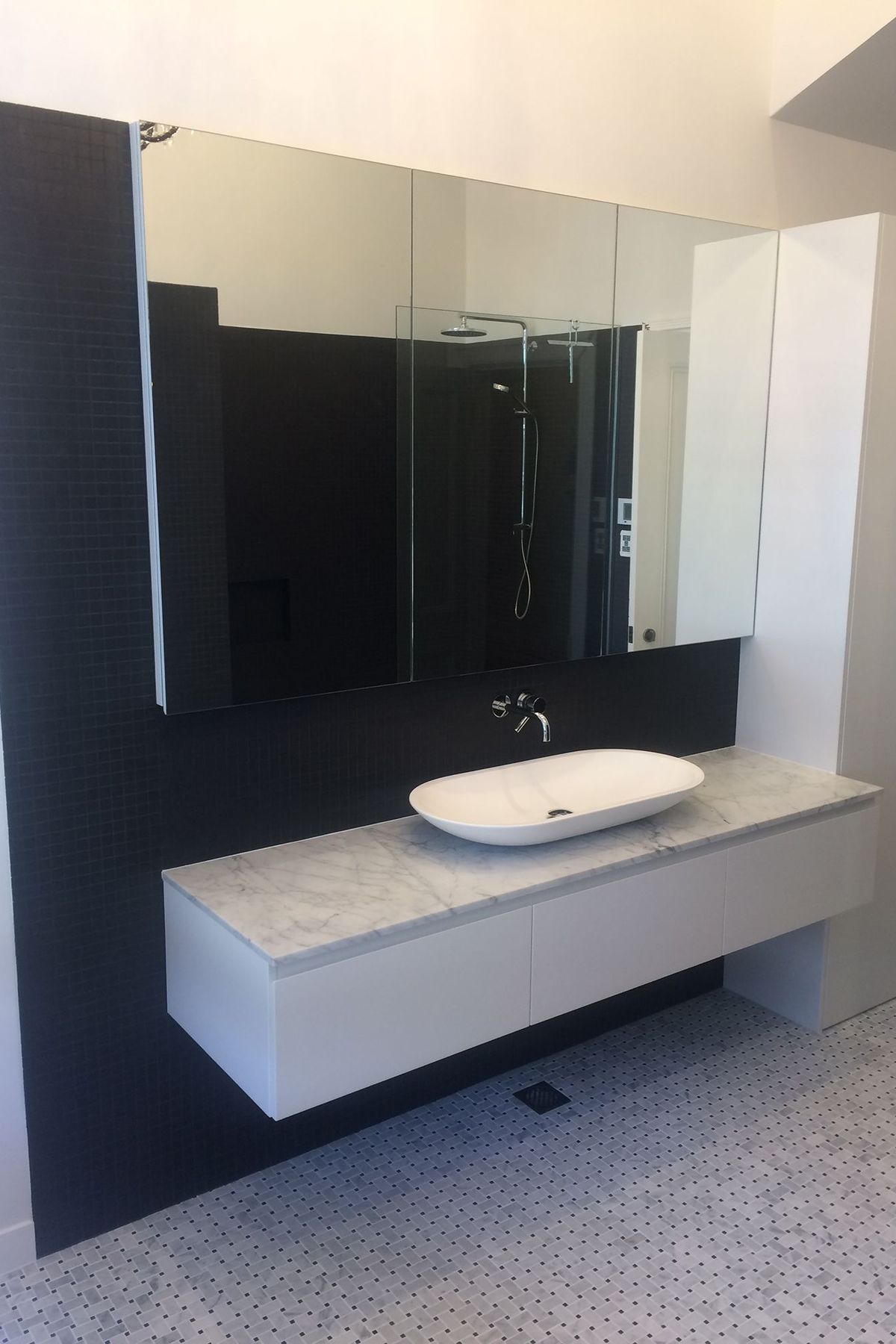 ArchiPro Project Summary - Elegant Cinca mosaic walls complemented by a sophisticated Carrara wave floor, creating a harmonious and stylish bathroom environment.