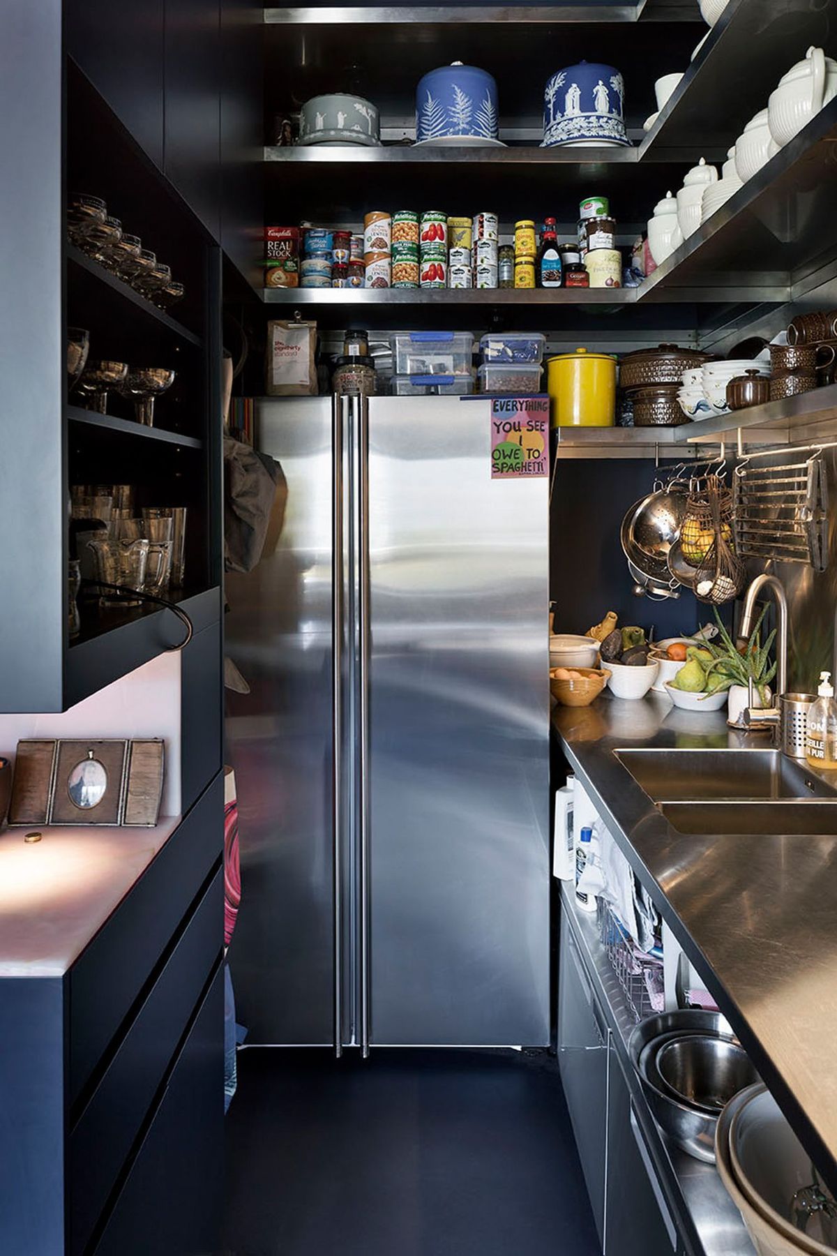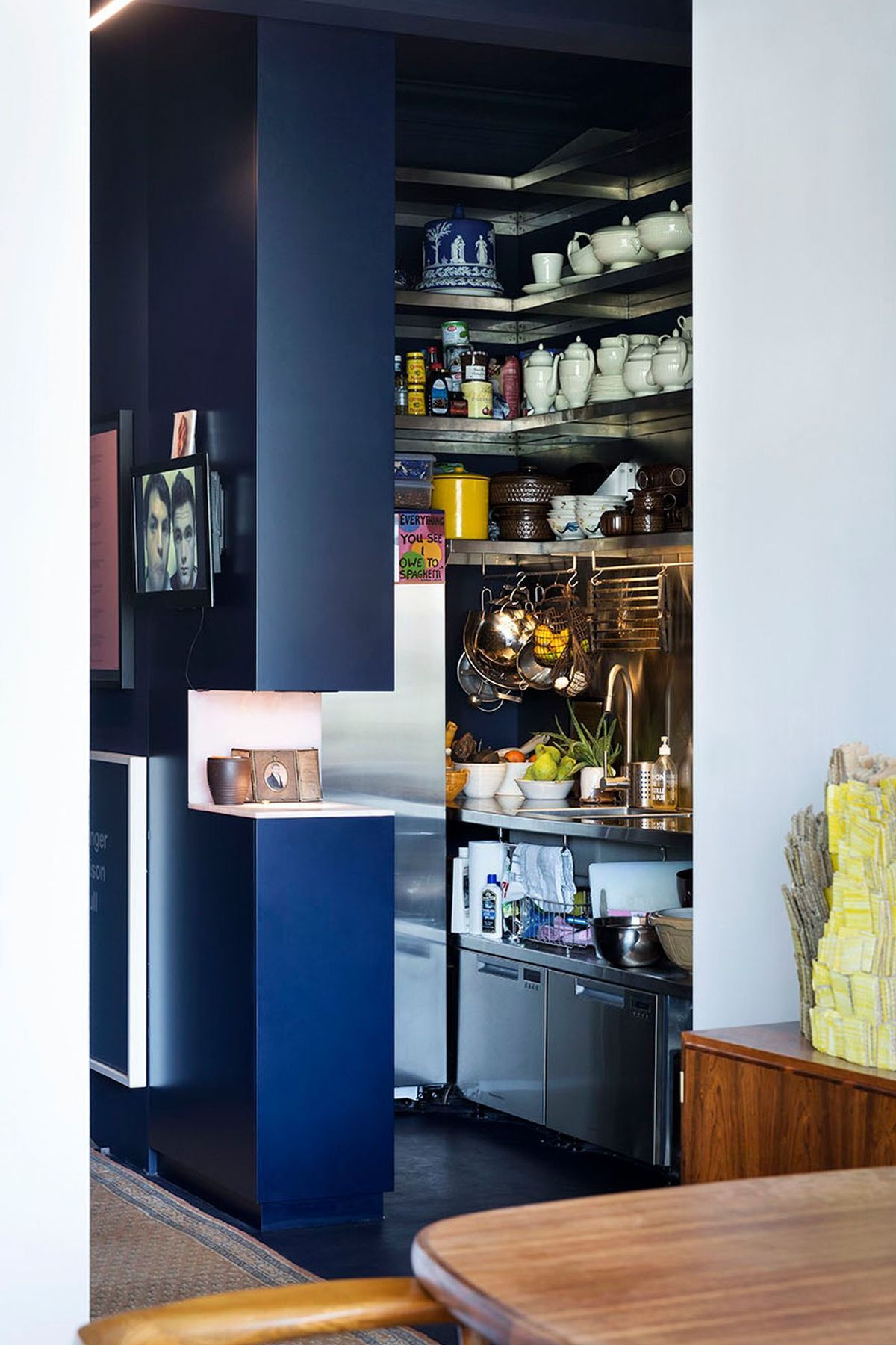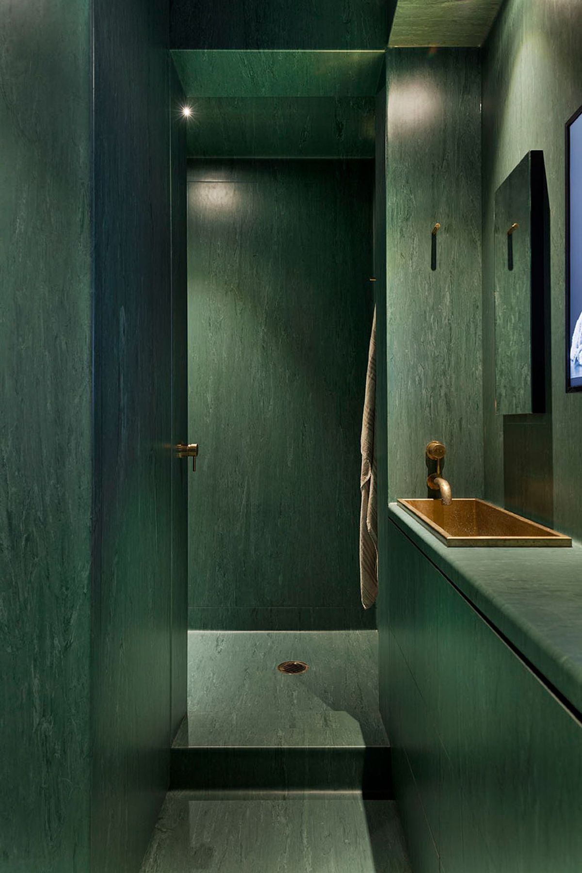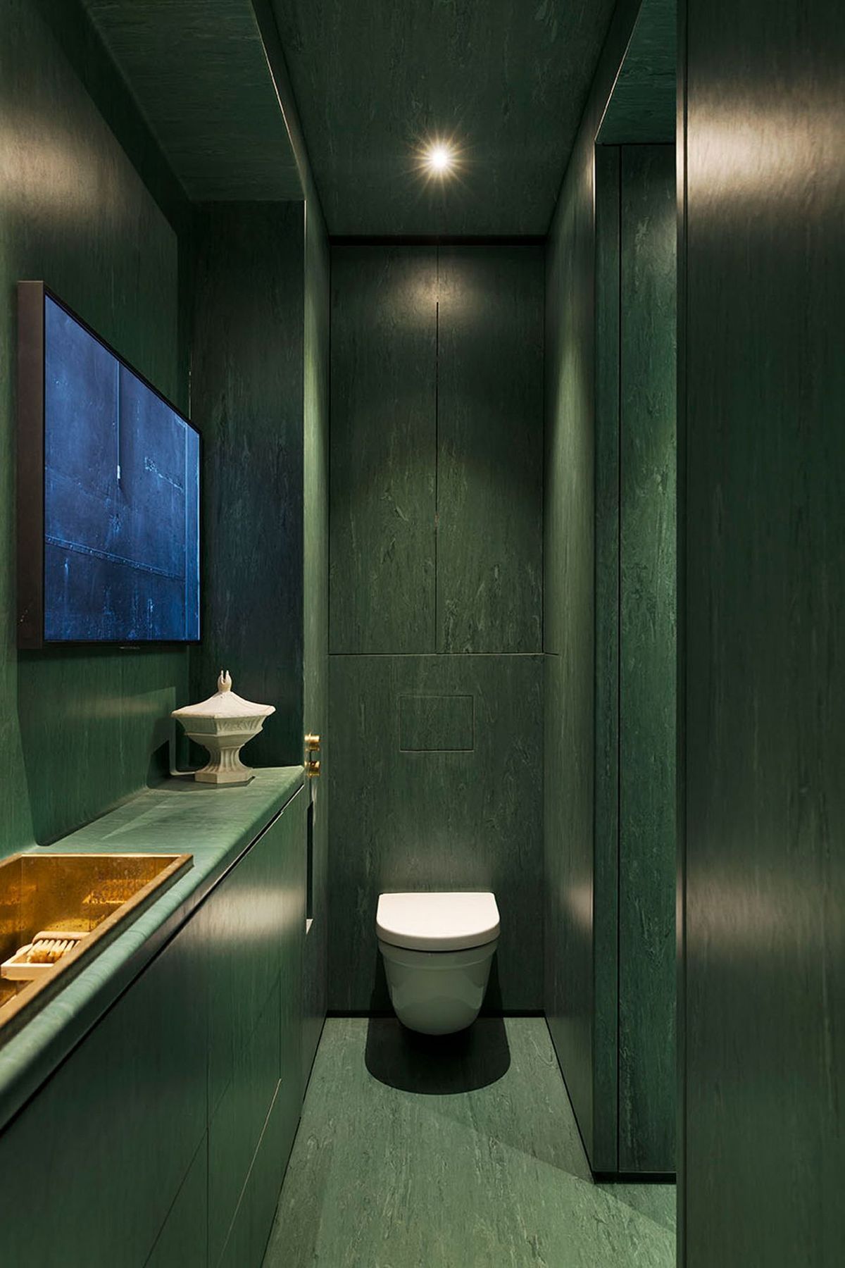 ArchiPro Project Summary - Conceptual and unique downtown apartment featuring a functional kitchen, dedicated art space, and a distinctive wet room with brass detailing and a dynamic art piece.