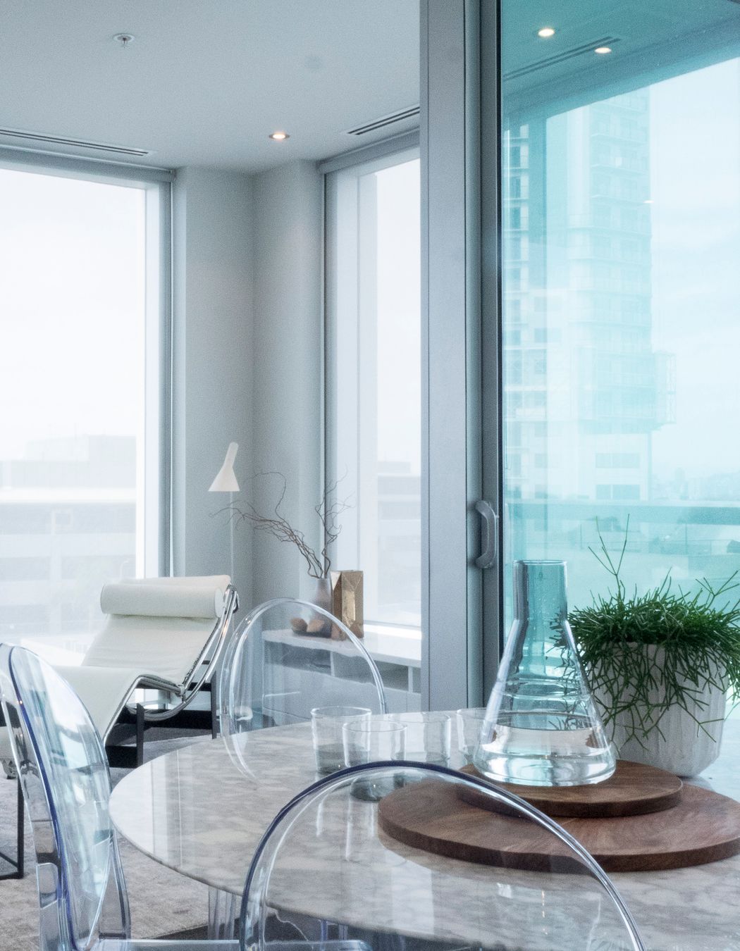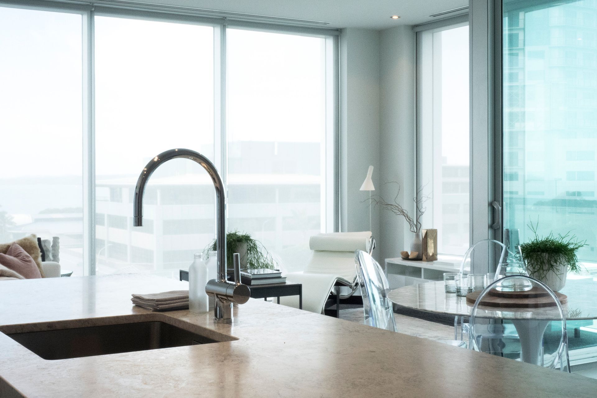 ArchiPro Project Summary - A contemporary city apartment renovation enhancing views with natural stone finishes, updated appliances, and a warm, inviting interior featuring eclectic furniture and soft grey walls.