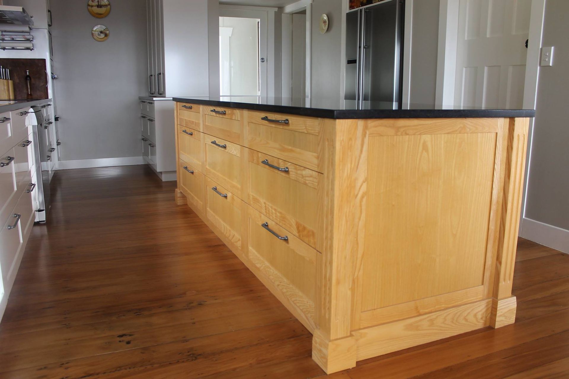 ArchiPro Project Summary - A stunning kitchen featuring lacquered drawer front panels, stainless steel tops and splashbacks, complemented by a solid timber island unit with crafted details, granite top, and stainless steel appliances, enhanced by lighting in glass shelving for showcasing special items.