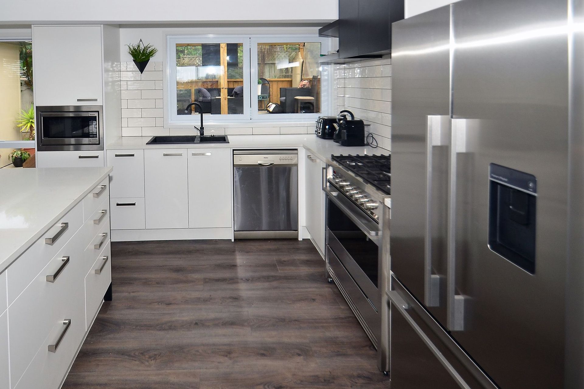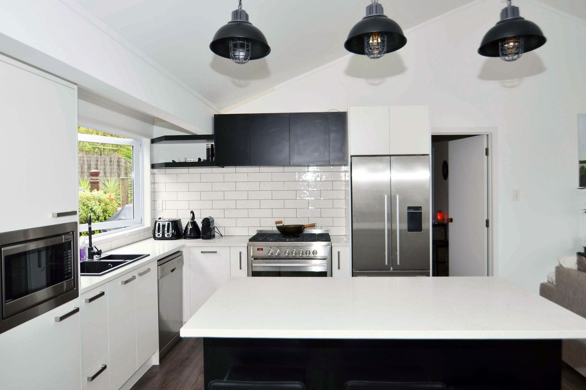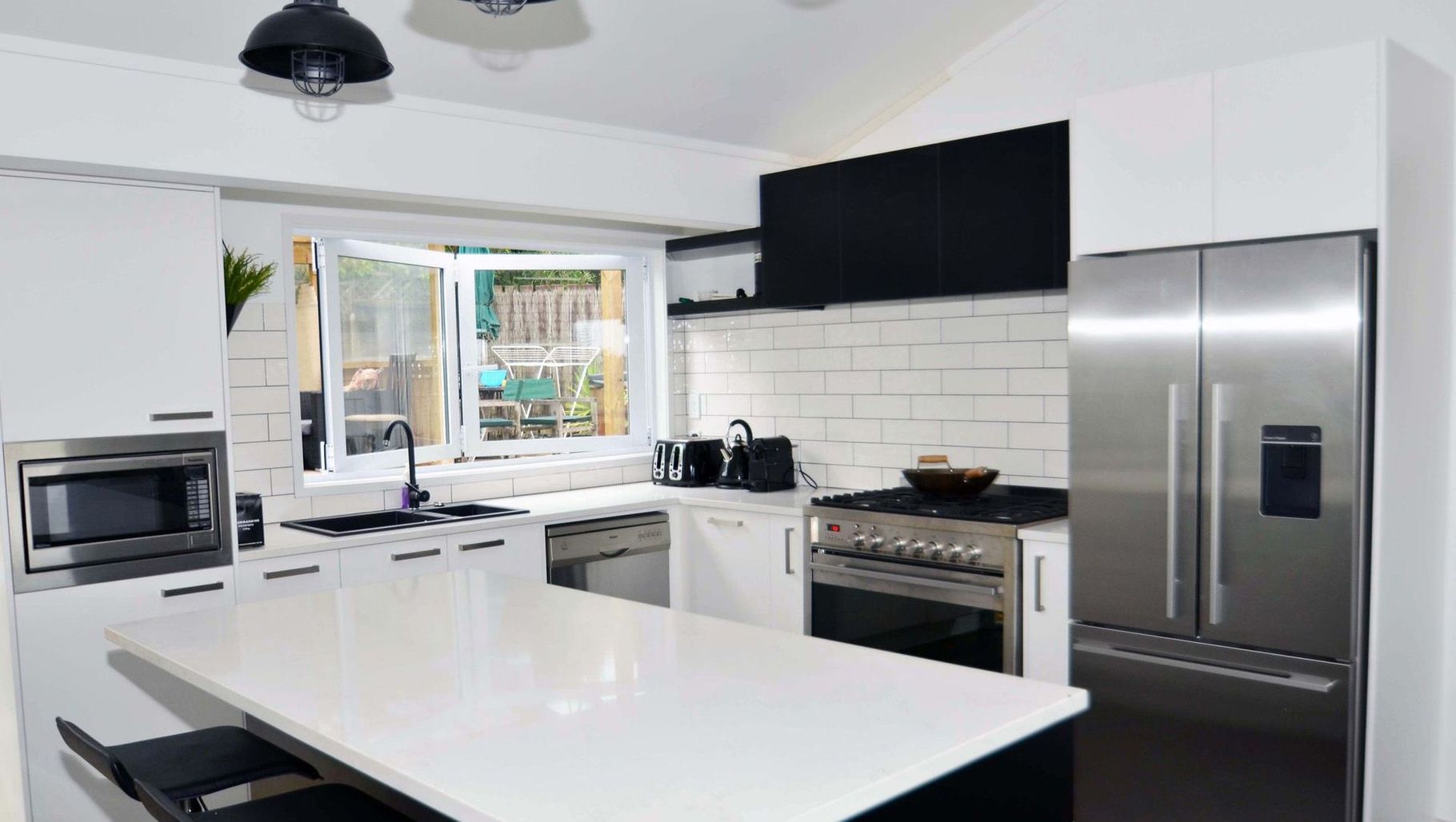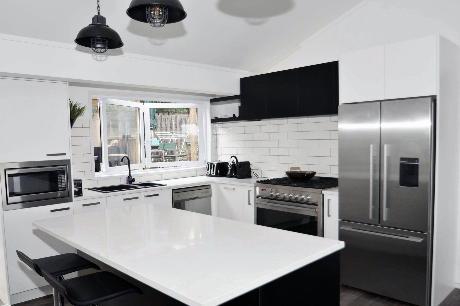ArchiPro Project Summary - A timeless monochrome kitchen transformation featuring bold accents, utilizing Prime and Melteca laminates, Primestone engineered stone, and Heritage Hardware for a captivating yet functional home hub.
