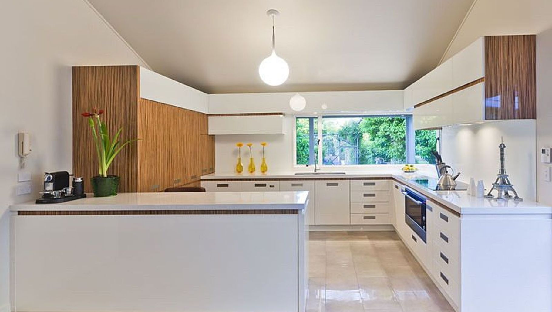 ArchiPro Project Summary - A functional and stylish kitchen designed for a discerning interior designer, featuring white lacquered cabinets, Corian bench tops, and integrated appliances, all harmoniously tied together with negative timber detailing.