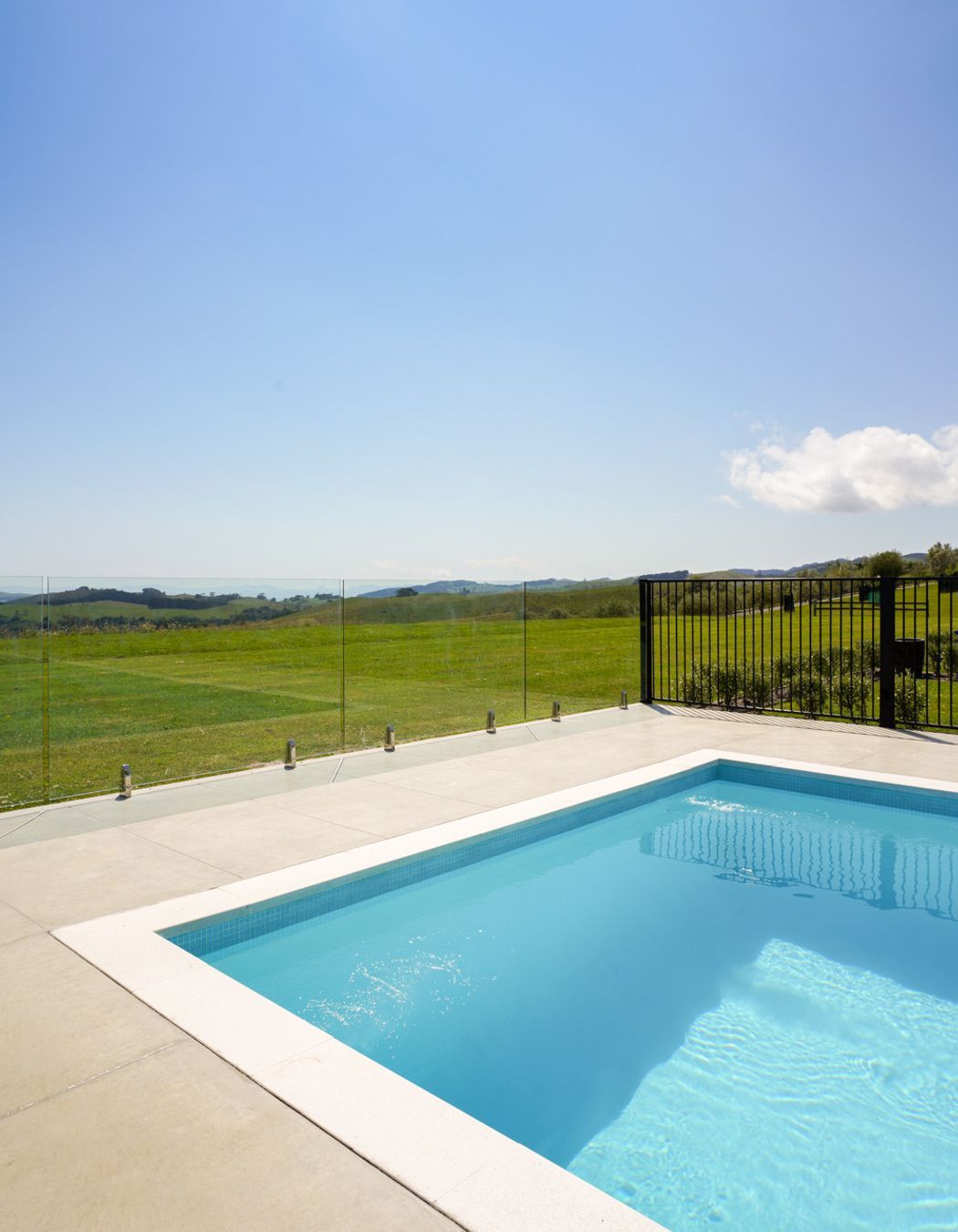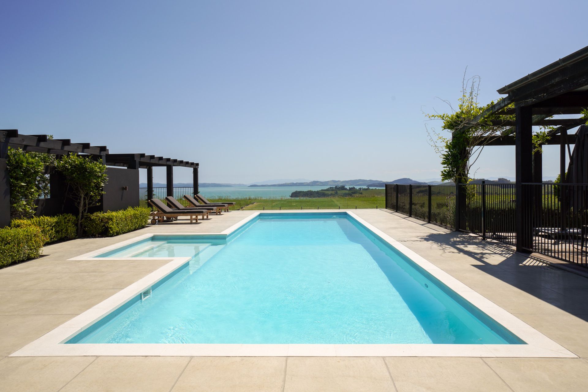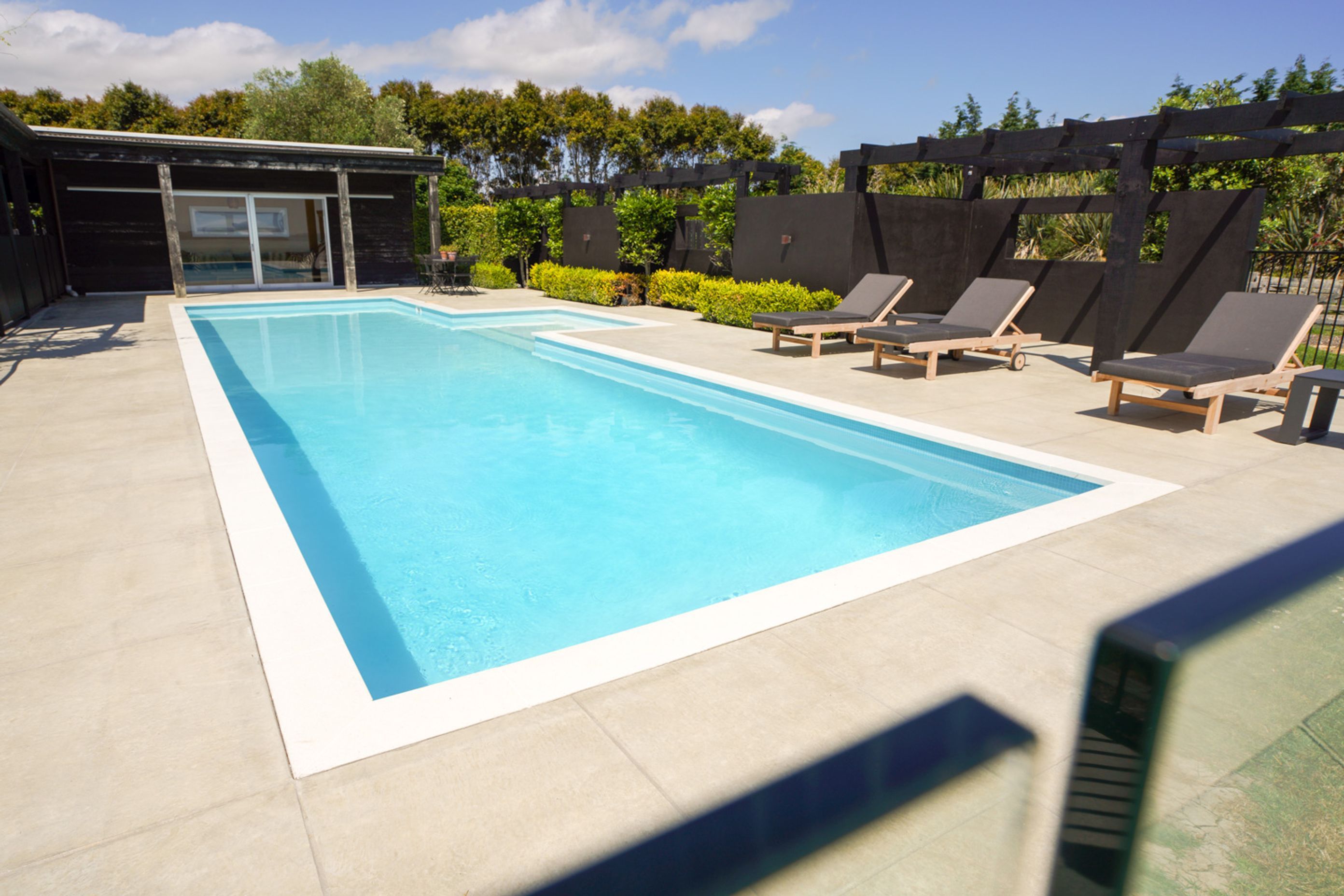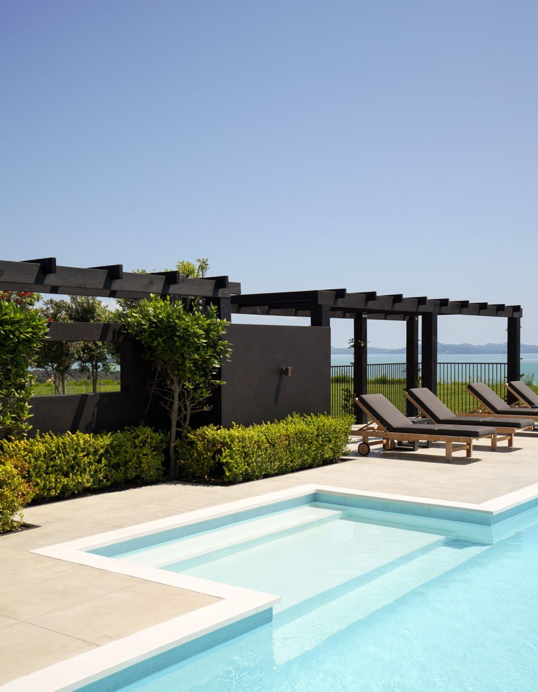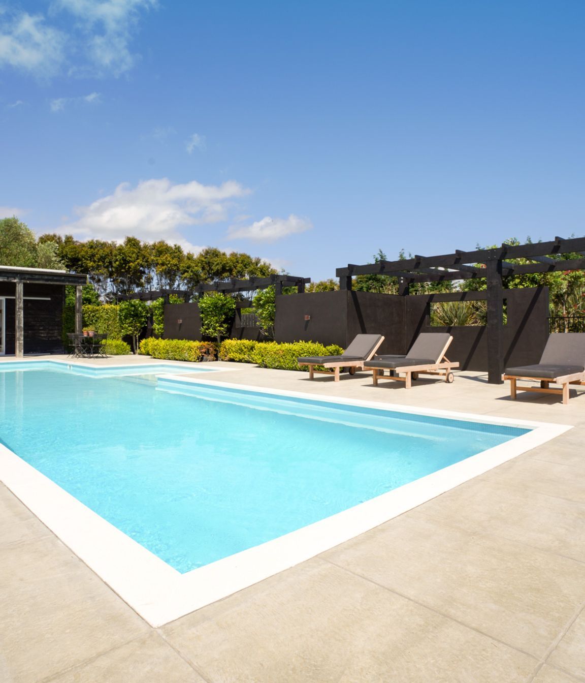 ArchiPro Project Summary - A beautifully designed outdoor pool area by Buka Woods, featuring Peter Fell coloured concrete, complemented by expert craftsmanship from Inground Pools Ltd and RGC, with a solar heating system by Sunbather Pool Solar Heating NZ and elegant balustrade by Glass Vice Products Ltd.