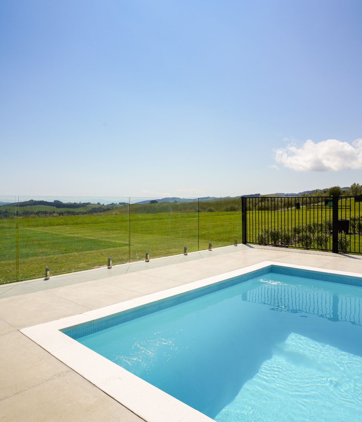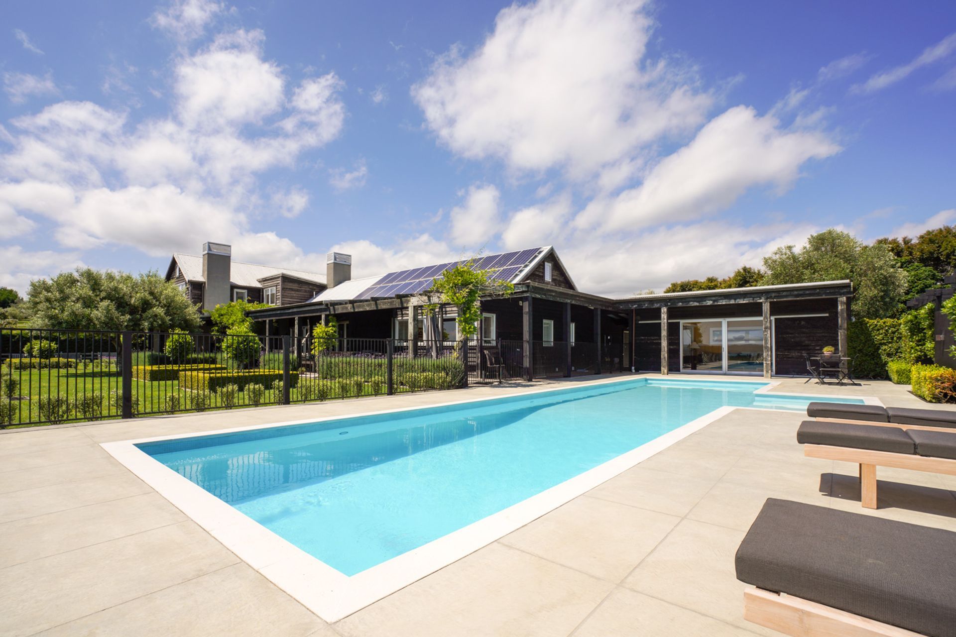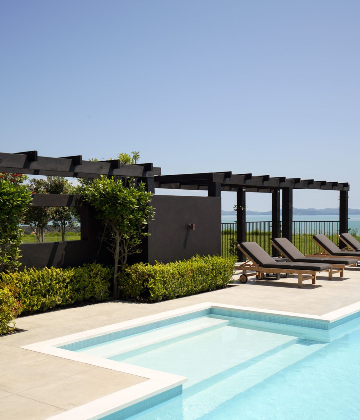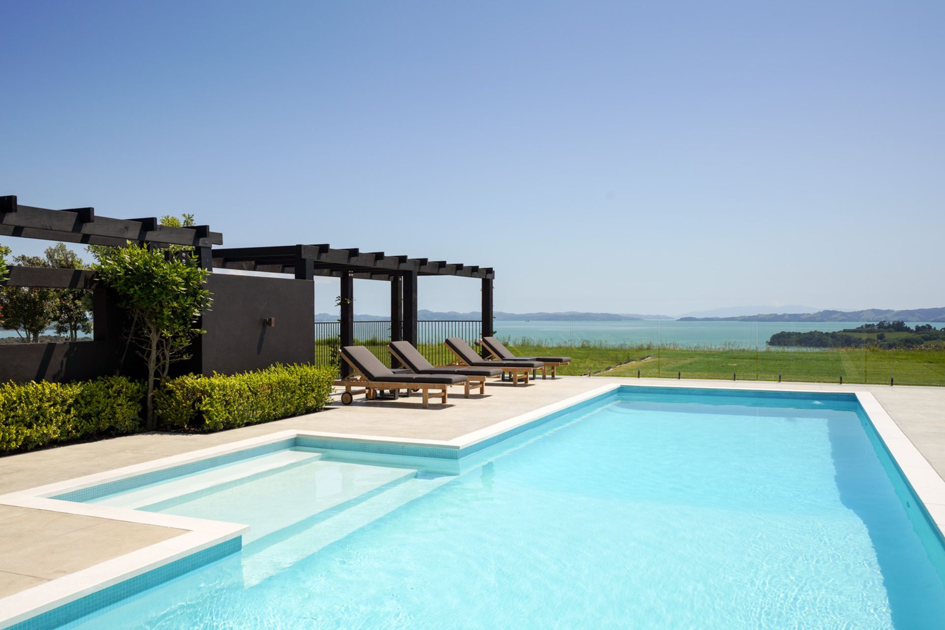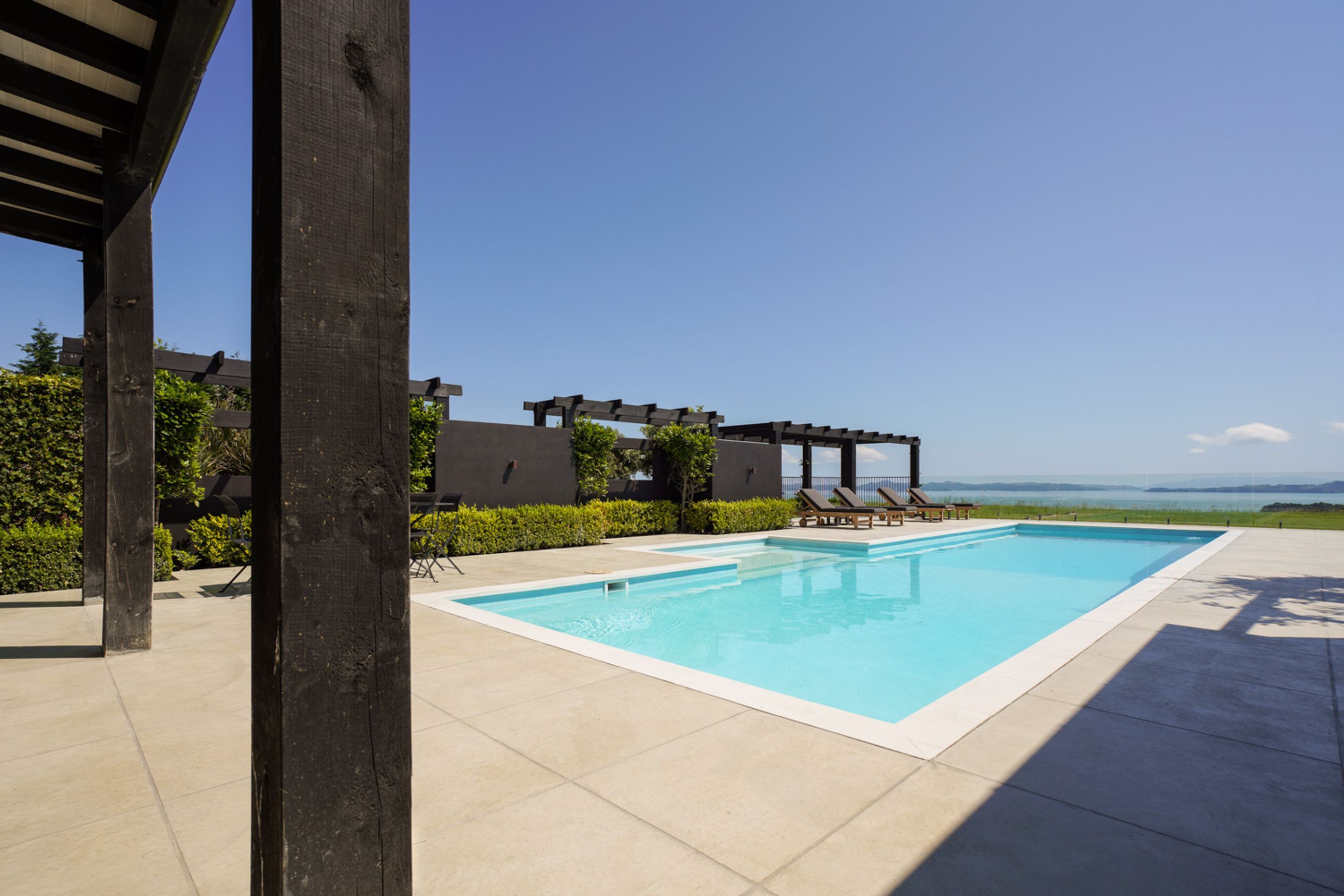 ArchiPro Project Summary - A beautifully designed outdoor pool area by Buka Woods, featuring Peter Fell coloured concrete, complemented by expert craftsmanship from Inground Pools Ltd and RGC, with a solar heating system by Sunbather Pool Solar Heating NZ and elegant balustrade by Glass Vice Products Ltd.