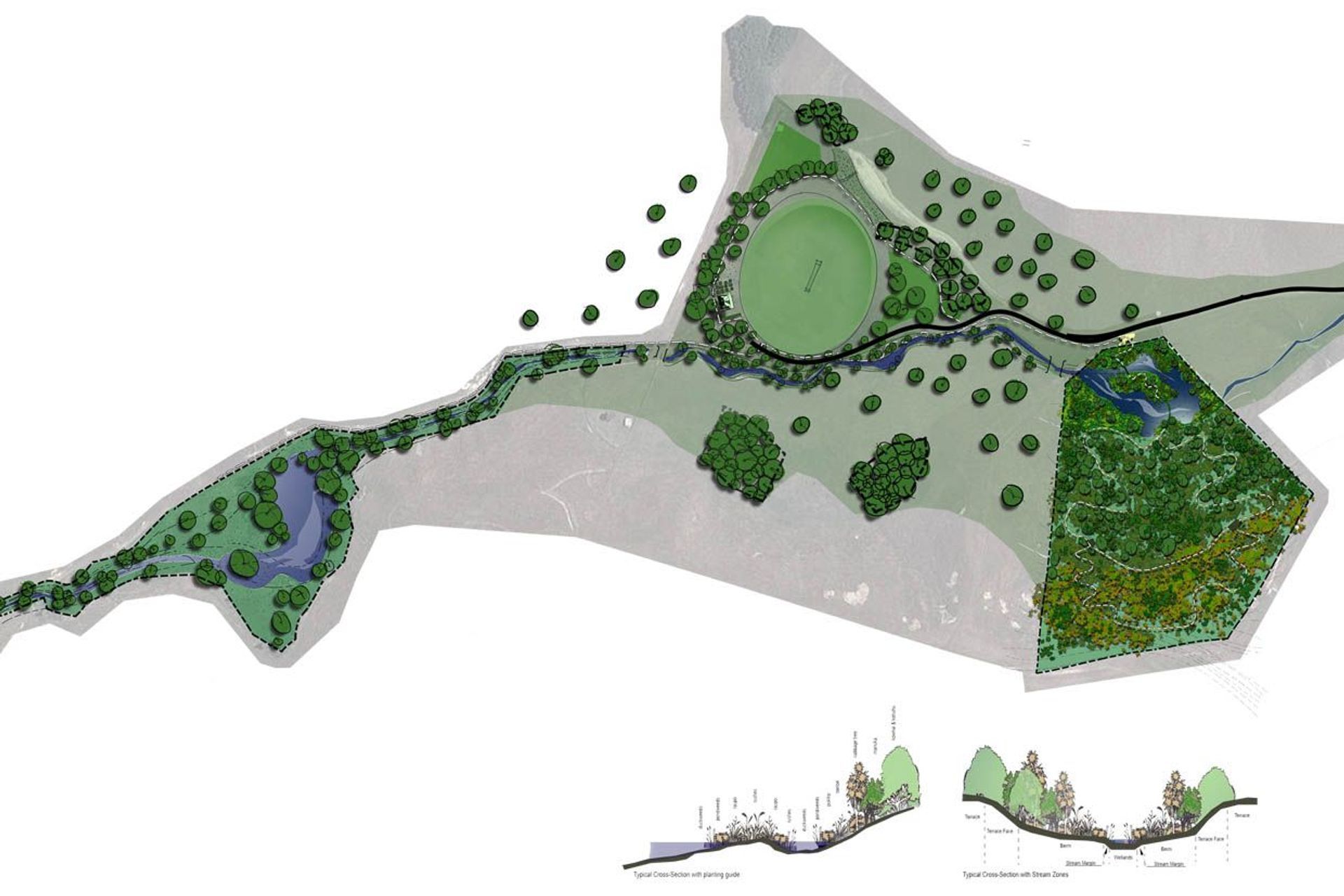 ArchiPro Project Summary - Clifton Country Cricket Club: A harmonious blend of cricket and nature, featuring native riparian waterways and over 10,000 native plants, creating a vibrant community space that celebrates environmental stewardship and the quintessential Kiwi spirit.