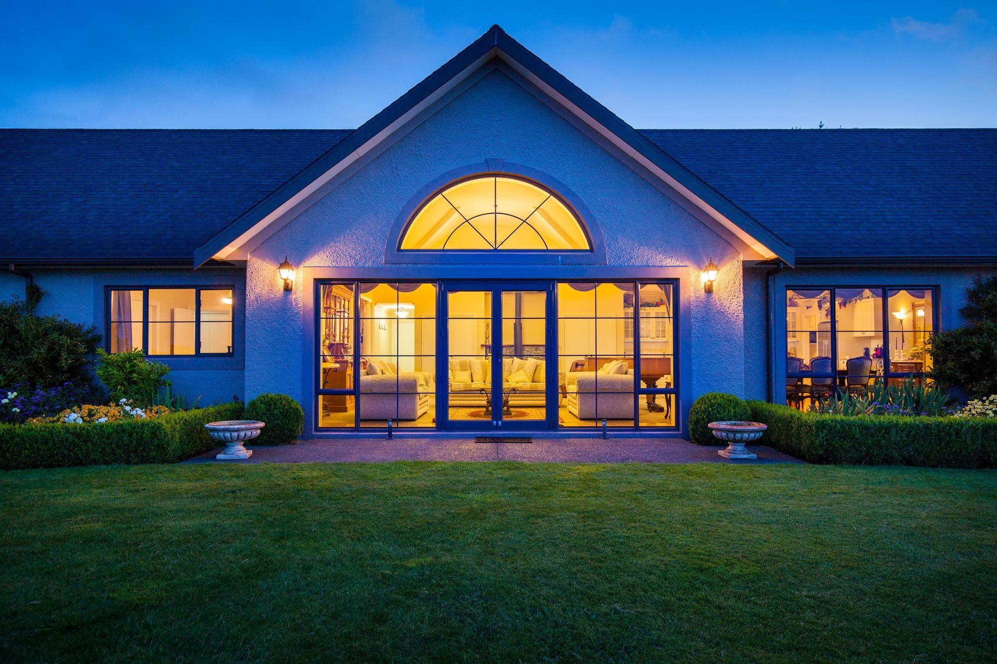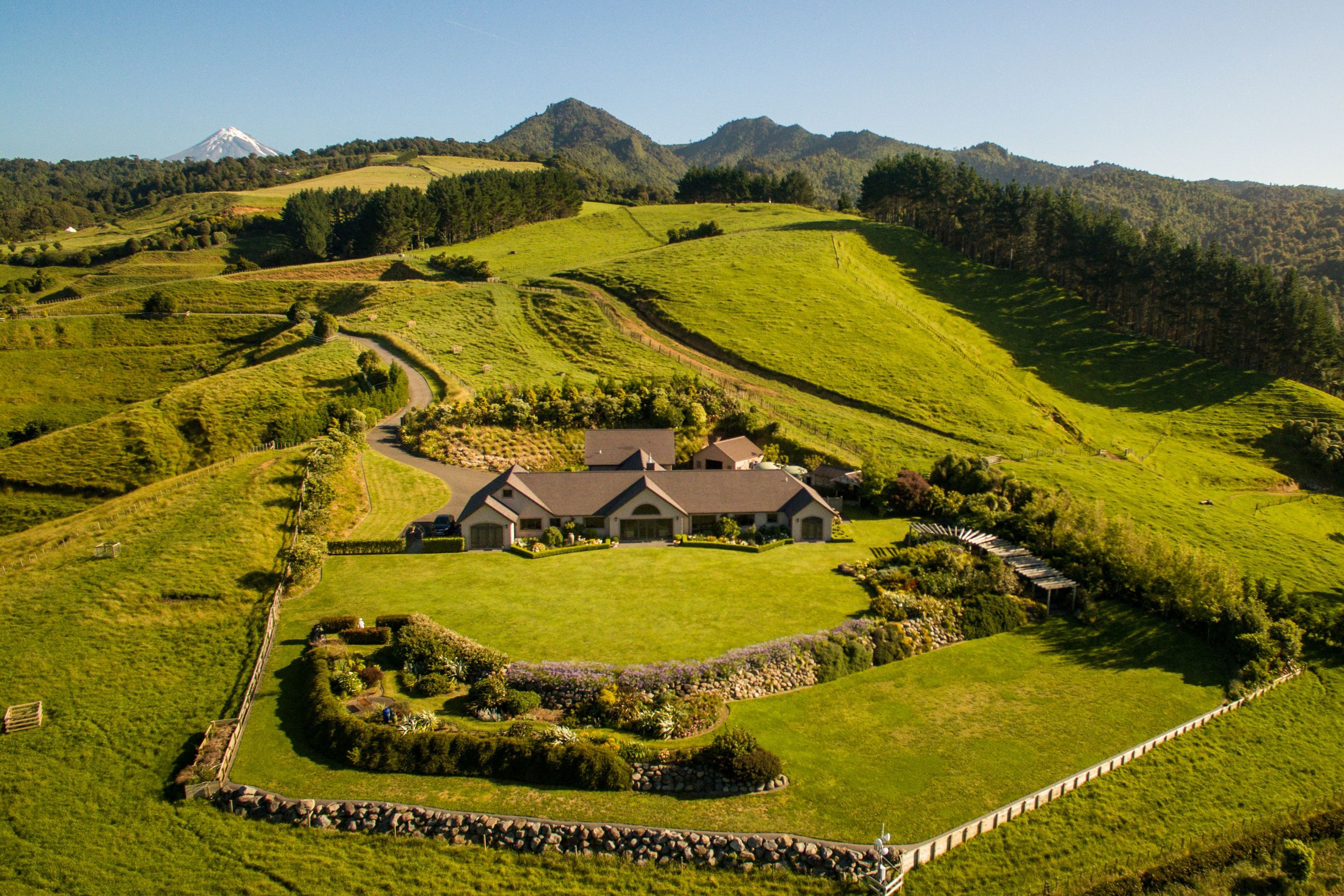 ArchiPro Project Summary - A grand American country style estate in Oakura, featuring sophisticated Hamptons elegance, expansive indoor/outdoor living spaces, and stunning countryside views, complete with an outdoor entertaining area, fireplace, barbecue, and spa bath.