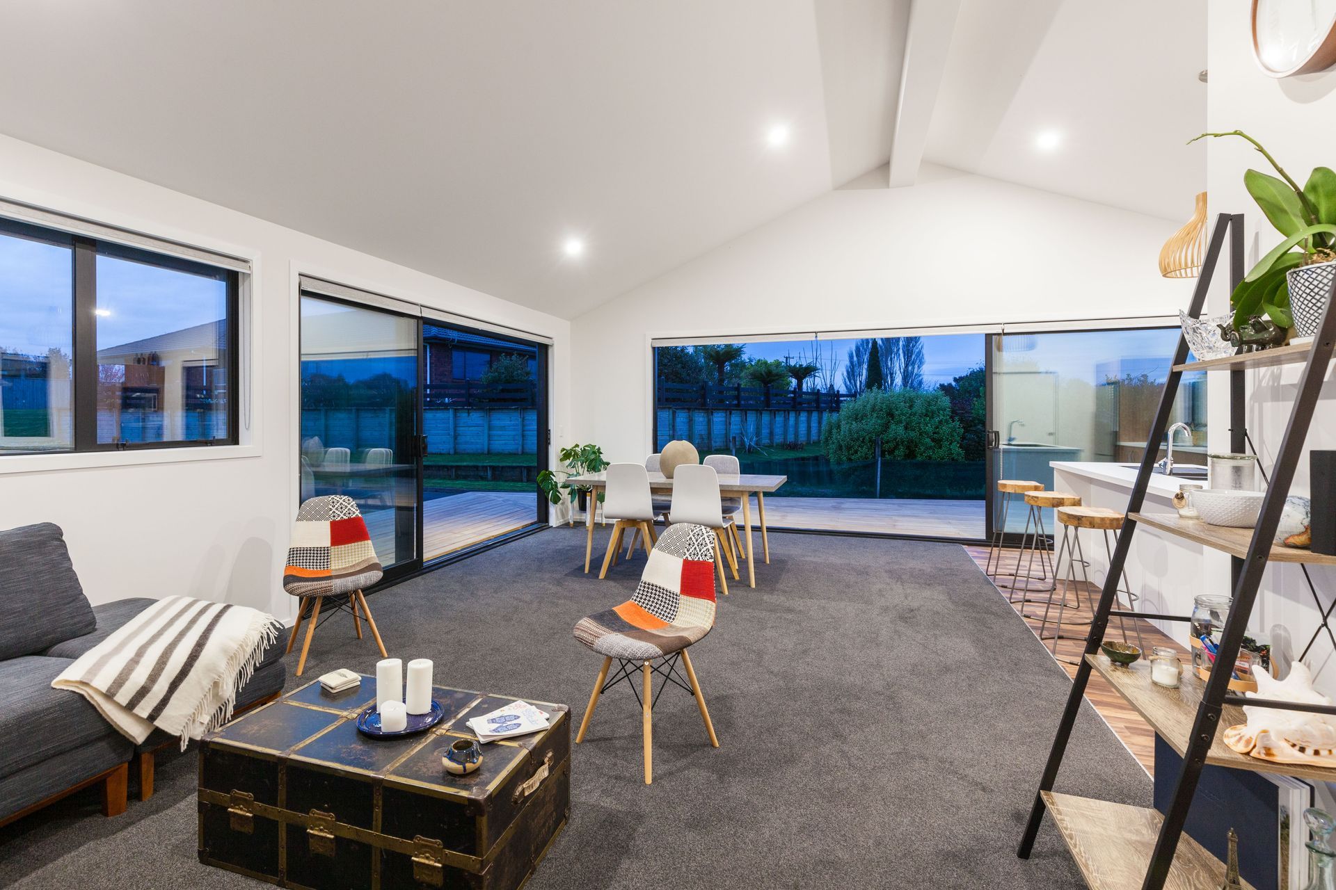ArchiPro Project Summary - Affordable coastal home in Urenui featuring open-plan living, full-height sliding doors, and a separate double garage, designed to complement the relaxed lifestyle of northern Taranaki.