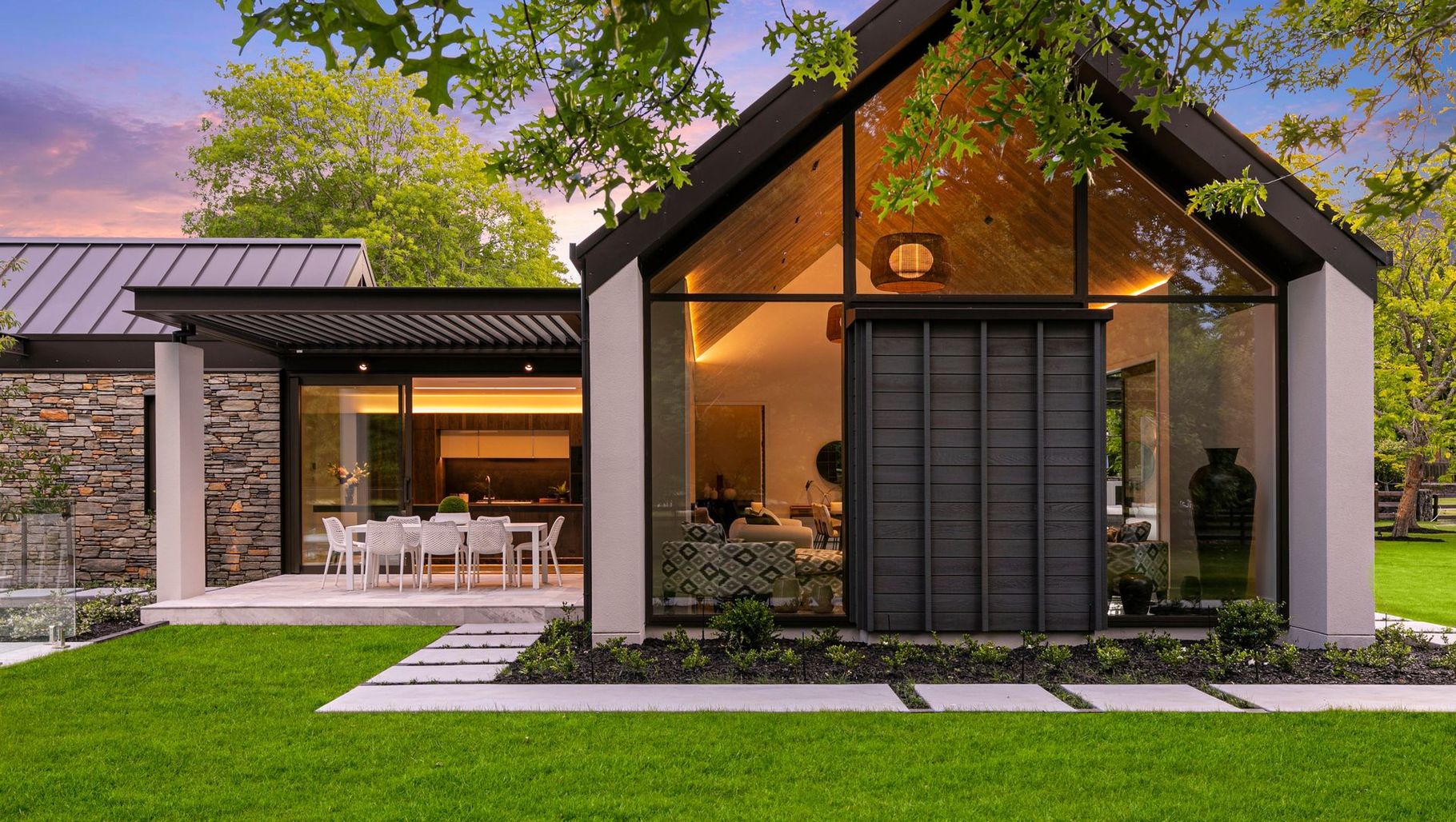 ArchiPro Project Summary - Contemporary stone and battened cedar home featuring linked gabled pavilions, designed for seamless indoor-outdoor living with motorised louvred pergolas, completed in 2023 near Auckland.