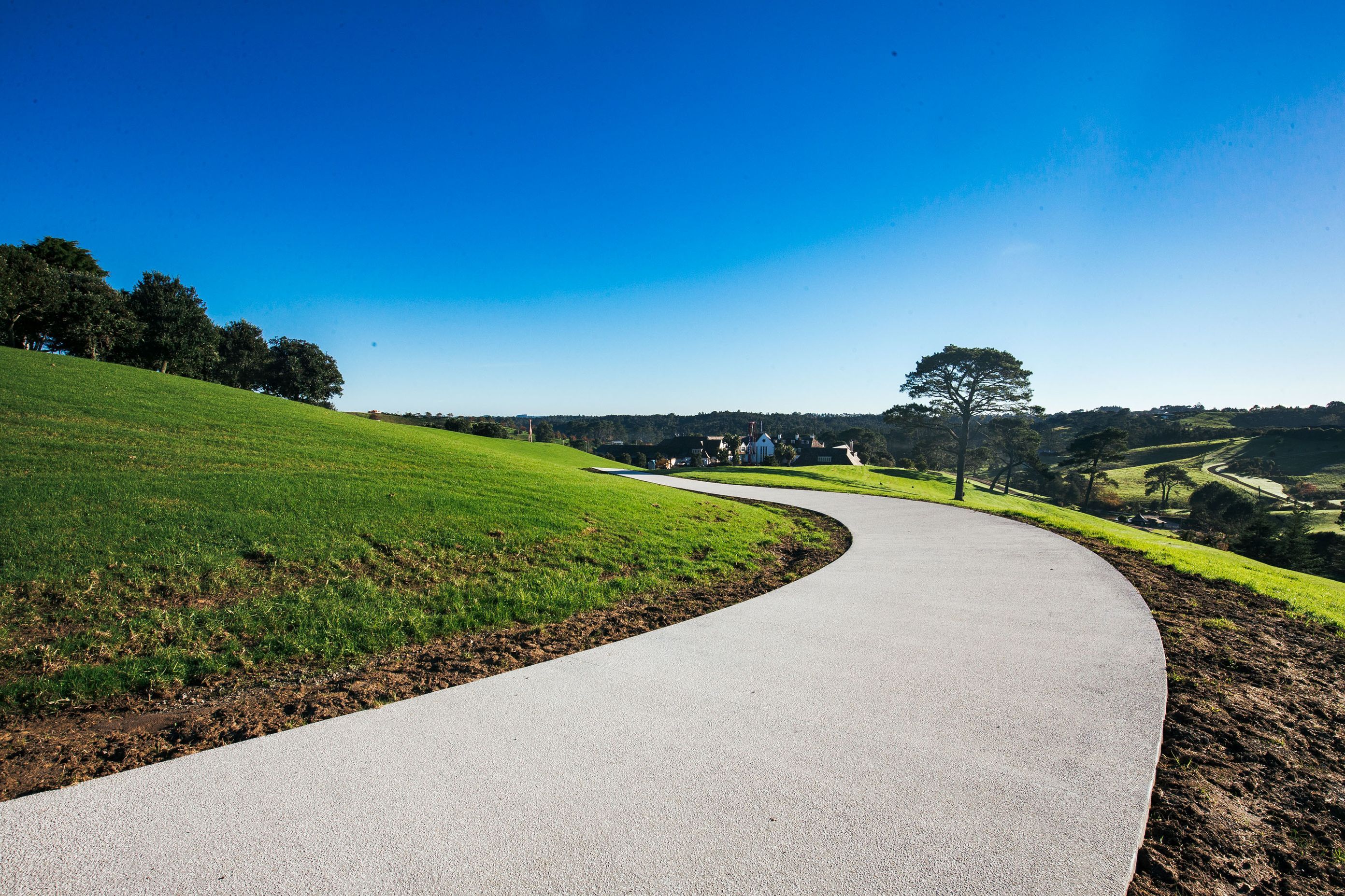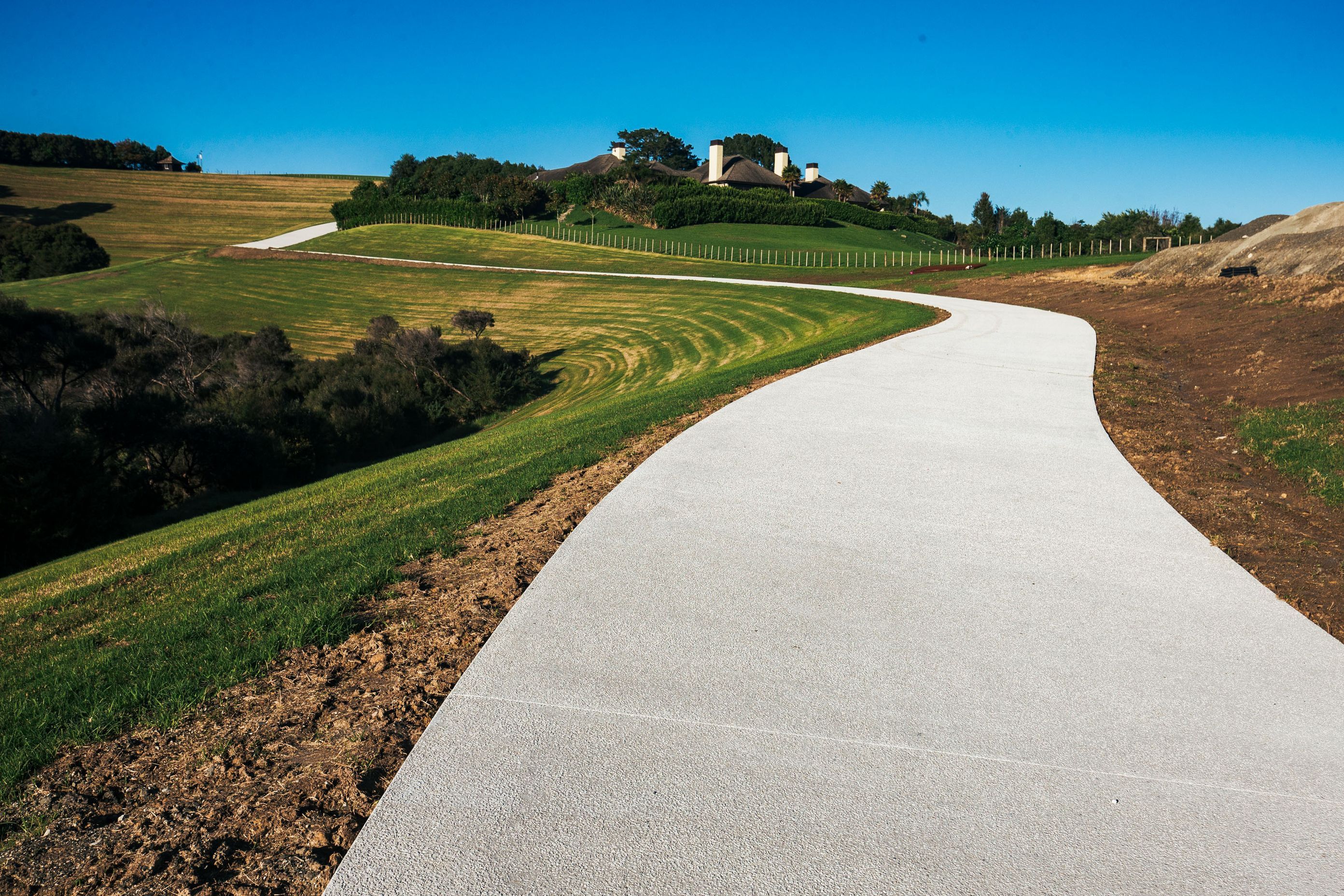 ArchiPro Project Summary - Stunning white exposed aggregate driveway crafted with nearly 1000m3 of PeterFell White Aalborg concrete at Mahoenui Mansion, Coatesville, in collaboration with Concrete and Construction.
