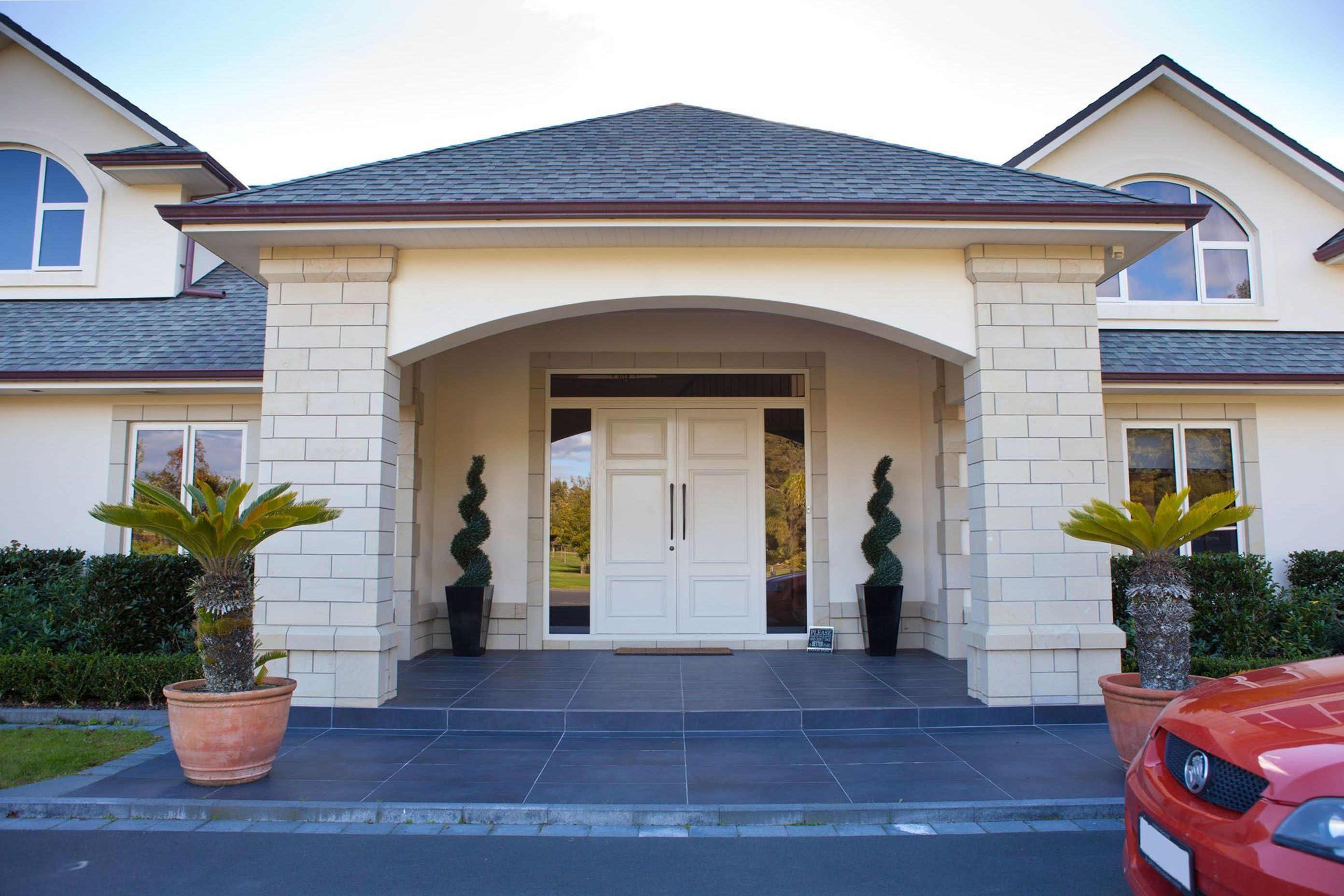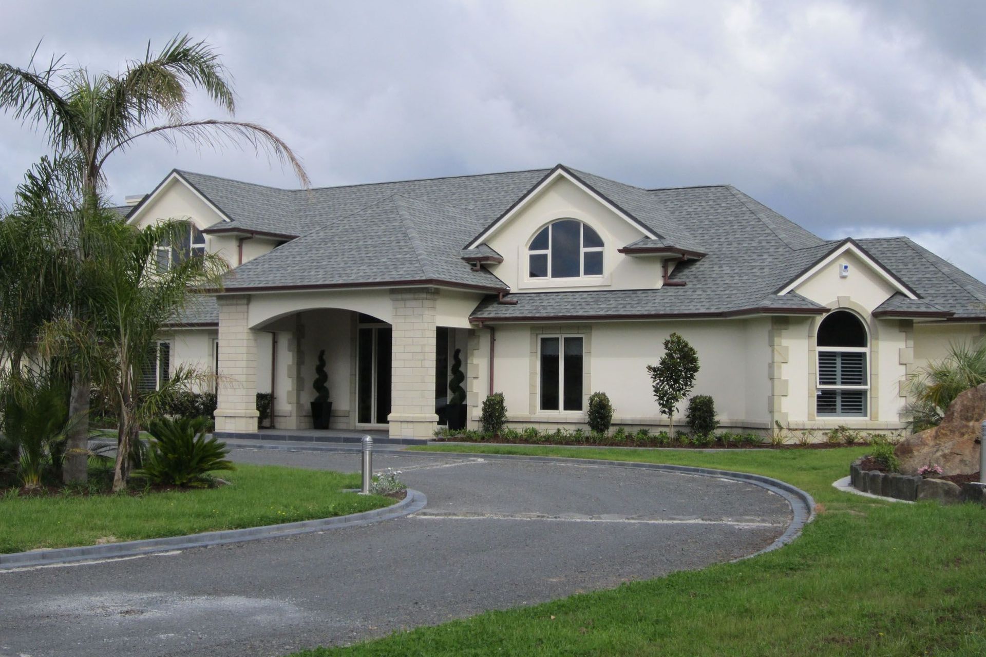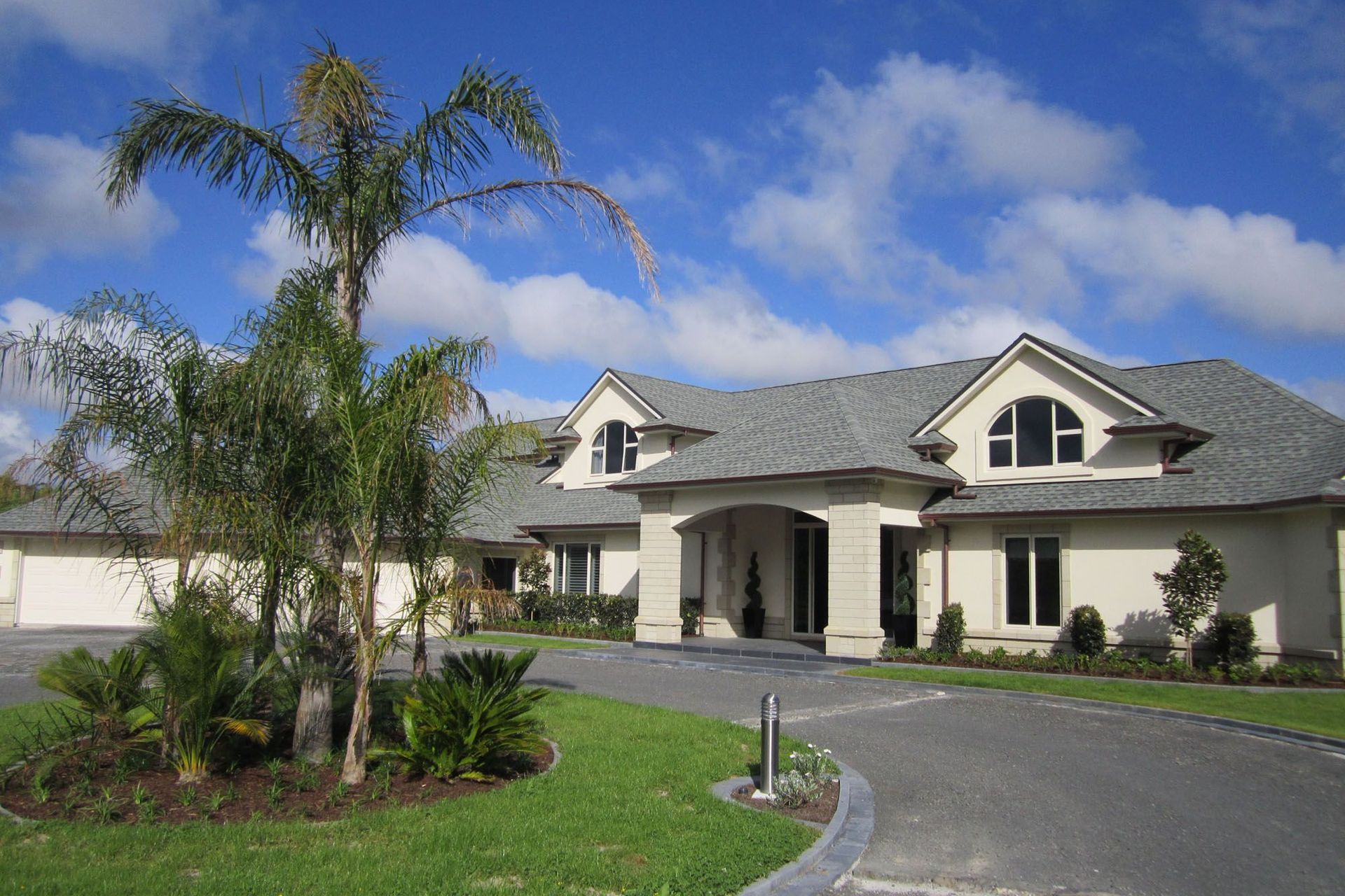 ArchiPro Project Summary - Executive 2-storey home featuring solid plaster brick and Hinuera stone veneer, with 5 bedrooms and 6 bathrooms, complemented by a secondary dwelling offering garaging, a billiards room, kitchen, bar, and bathroom.