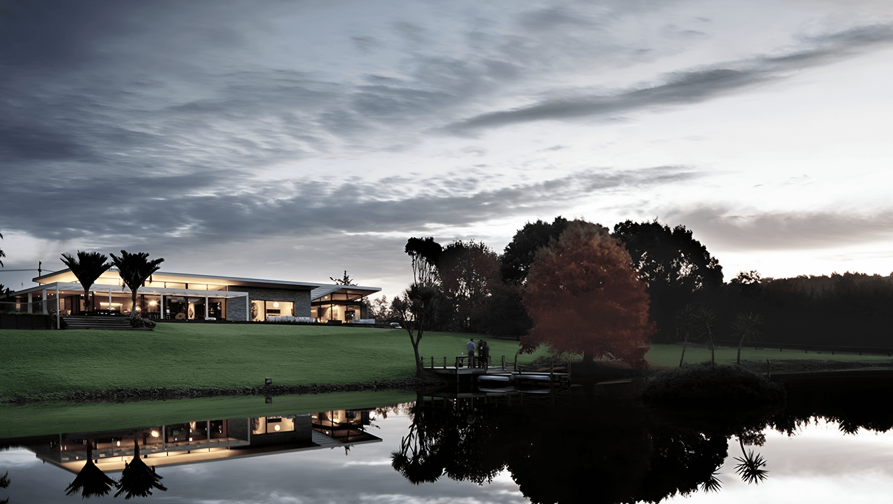 ArchiPro Project Summary - A serene country pavilion that serves as a private retreat and rural gallery, featuring strong modern lines, rich materials, and dramatic water features harmoniously integrated with the native bush and lakeside setting.