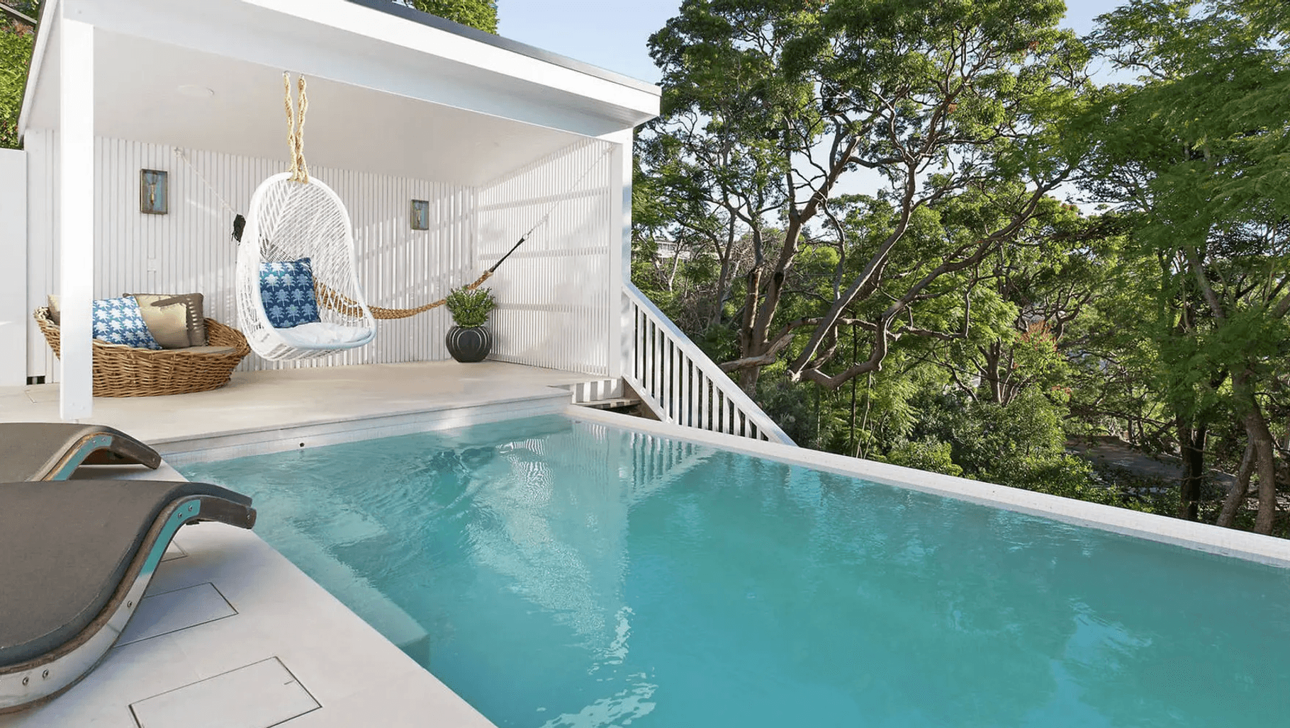 ArchiPro Project Summary - Innovative landscaping project in Mosman inspired by the iconic Raffles in Singapore and coastal Byron Bay, featuring seamless indoor-outdoor connections and key design elements like rounded doors and a pool cabana.