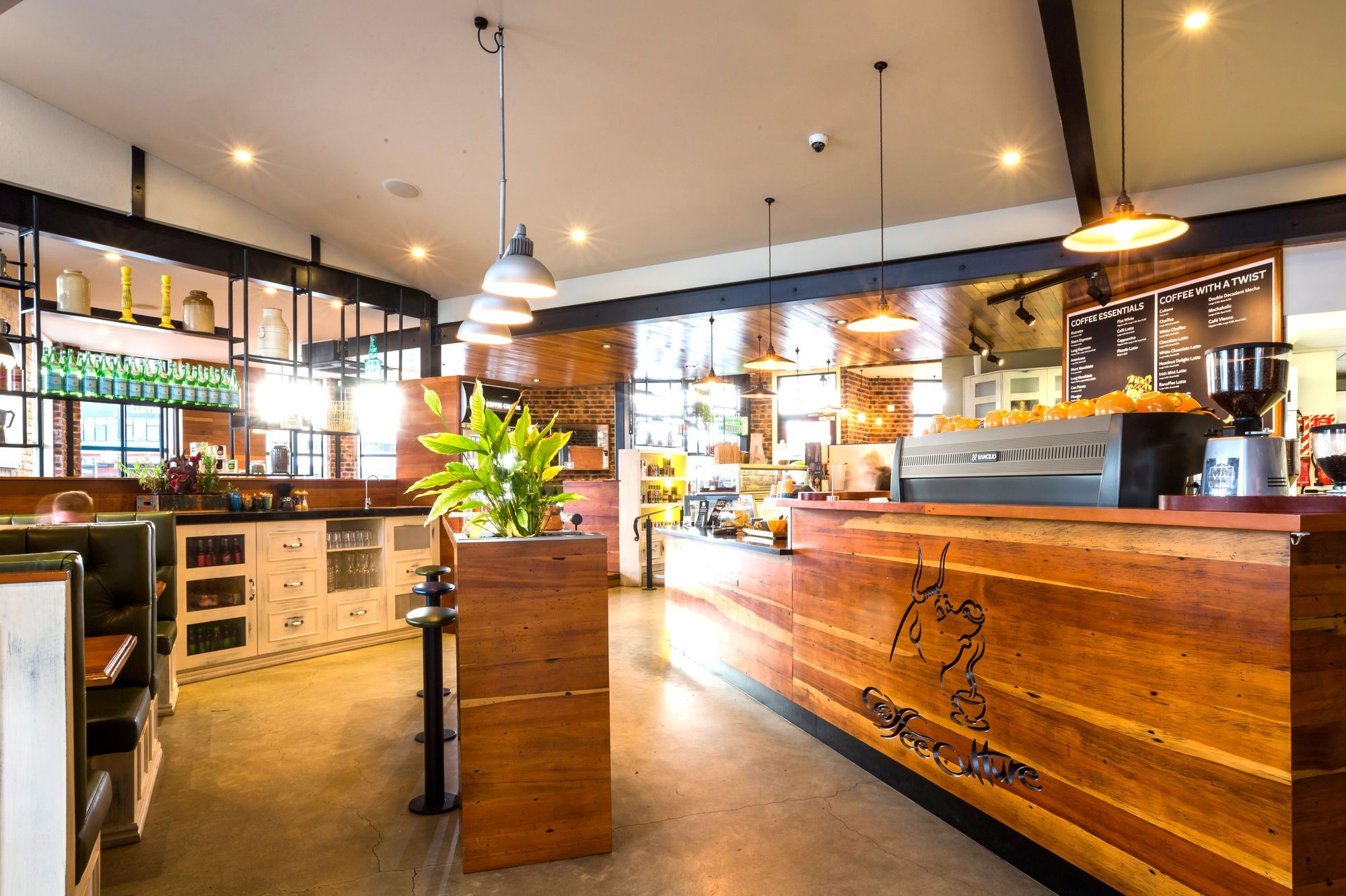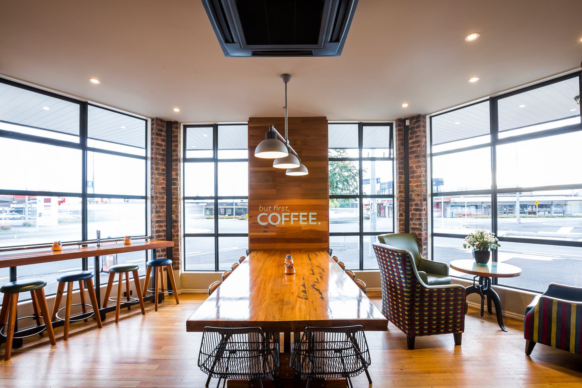 ArchiPro Project Summary - Transformation of a neglected 1960s commercial building into a high-end Coffee Culture franchise, featuring a sophisticated New York loft aesthetic, specialized internal spaces, and a seamless flow for patrons and staff.