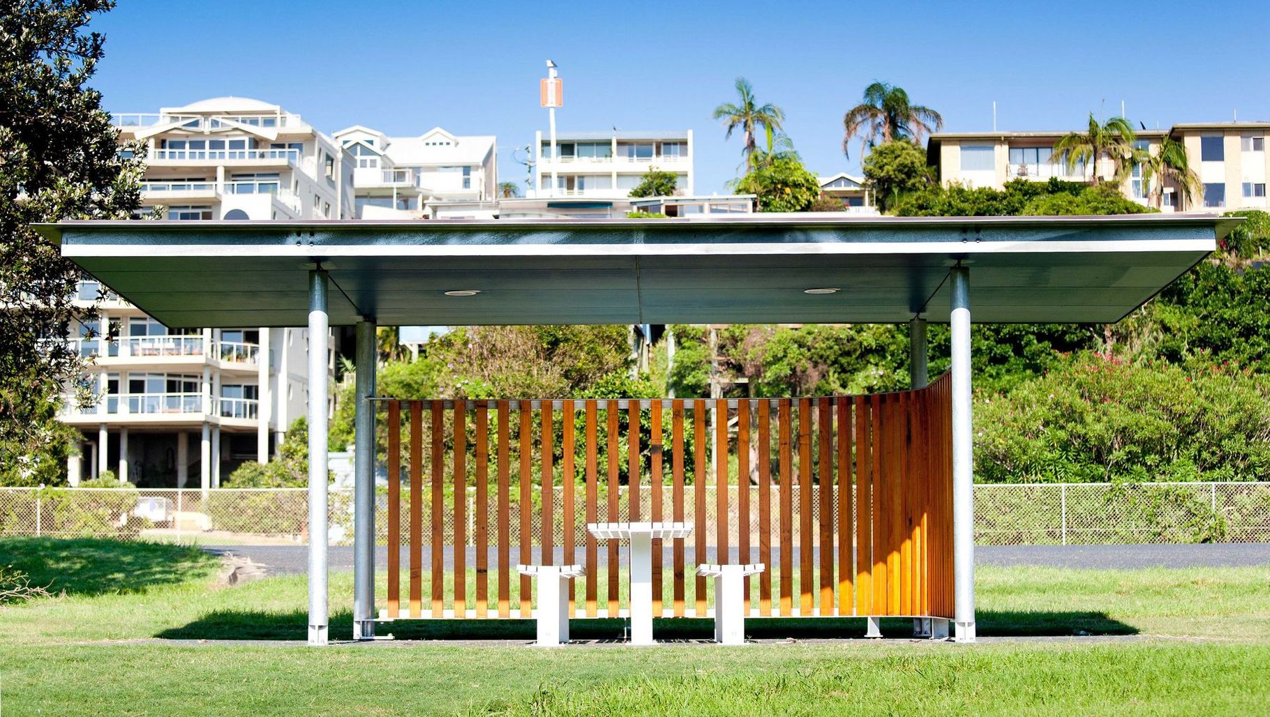 ArchiPro Project Summary - Innovative picnic and BBQ shelters designed for Coffs Harbour Jetty Area, featuring robust galvanized steel, timber screening, and vibrant soffits, enhancing public amenities in line with the evolving masterplan.