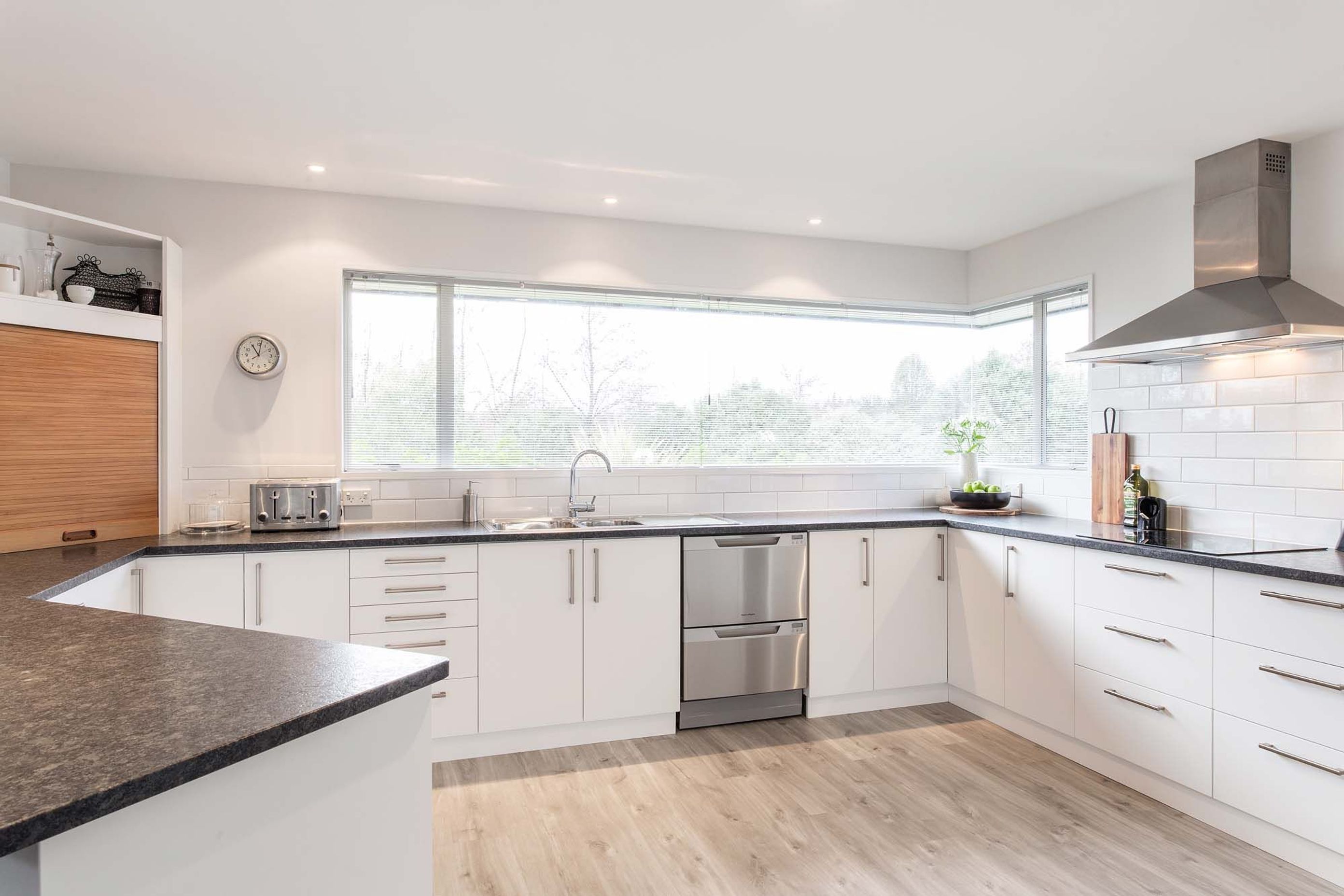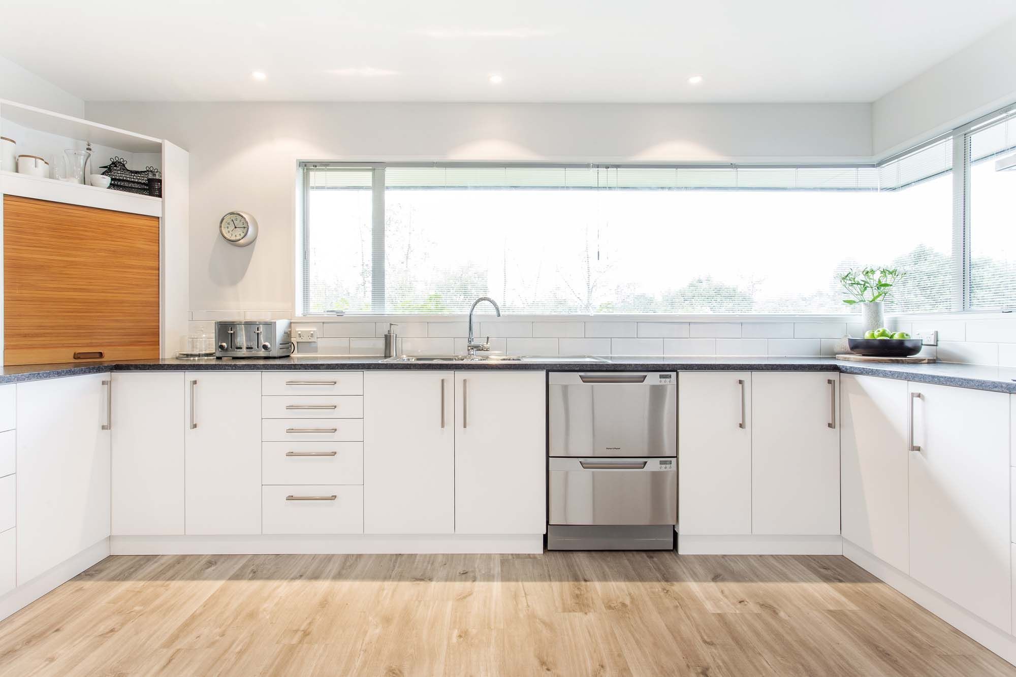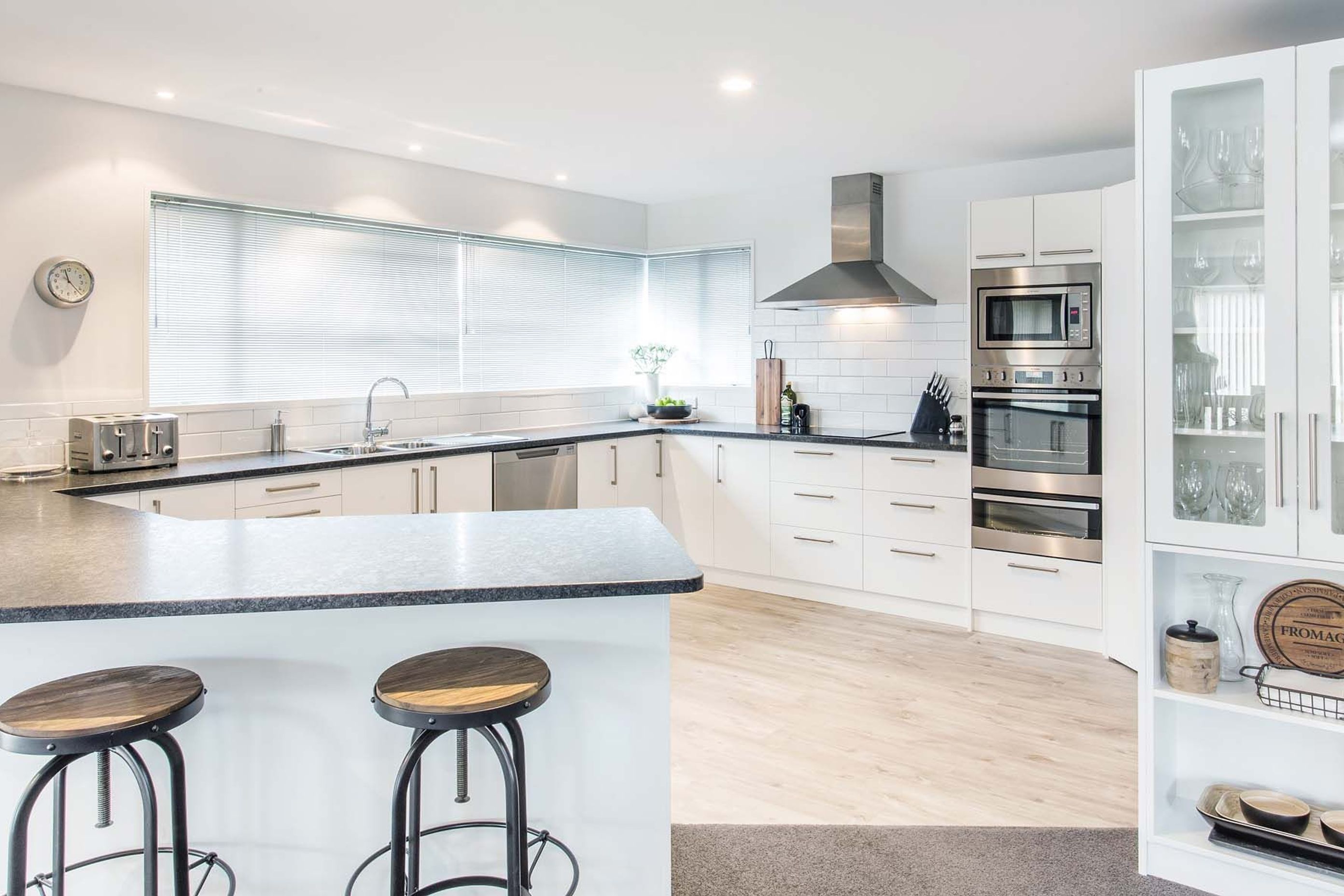 ArchiPro Project Summary - A stunning entertainer’s kitchen featuring Durostyle Lyell doors in Arctic White and Touchtex melamine panels, designed to inspire modern living. Designed and installed by Dream Doors Christchurch, located in Christchurch.