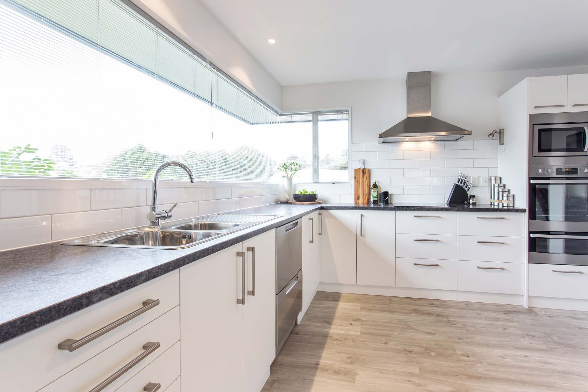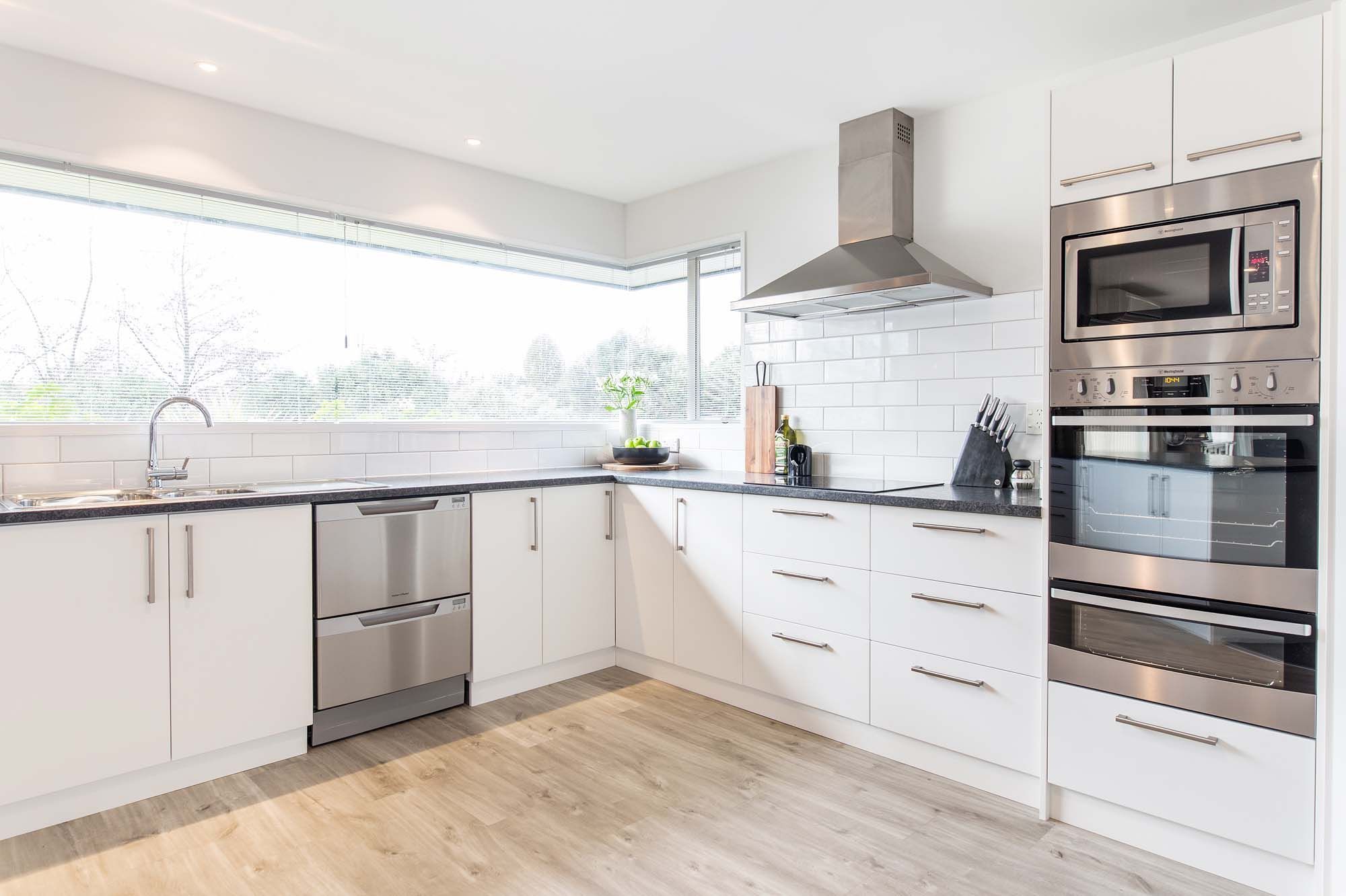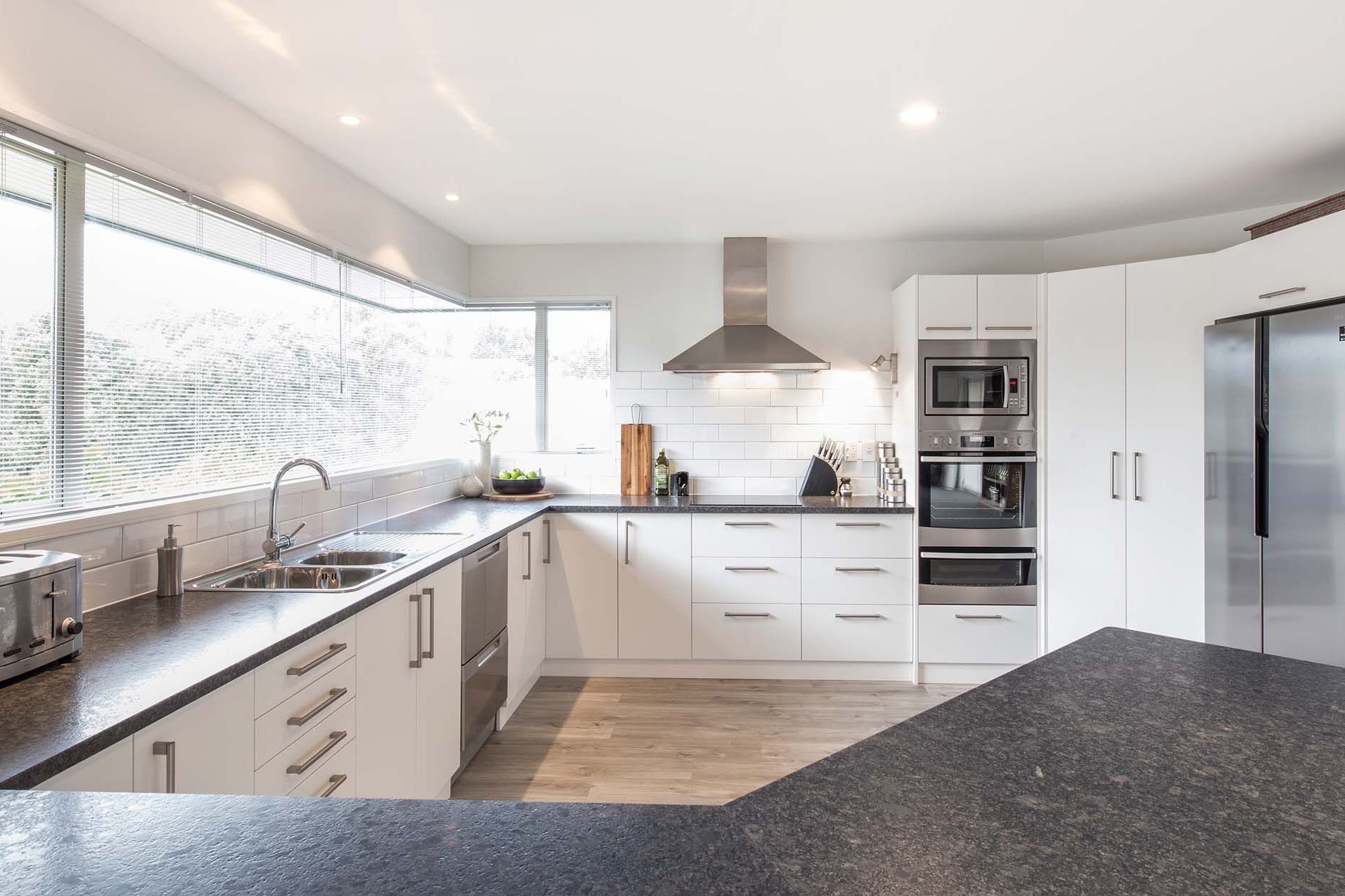 ArchiPro Project Summary - A stunning entertainer’s kitchen featuring Durostyle Lyell doors in Arctic White and Touchtex melamine panels, designed to inspire modern living. Designed and installed by Dream Doors Christchurch, located in Christchurch.