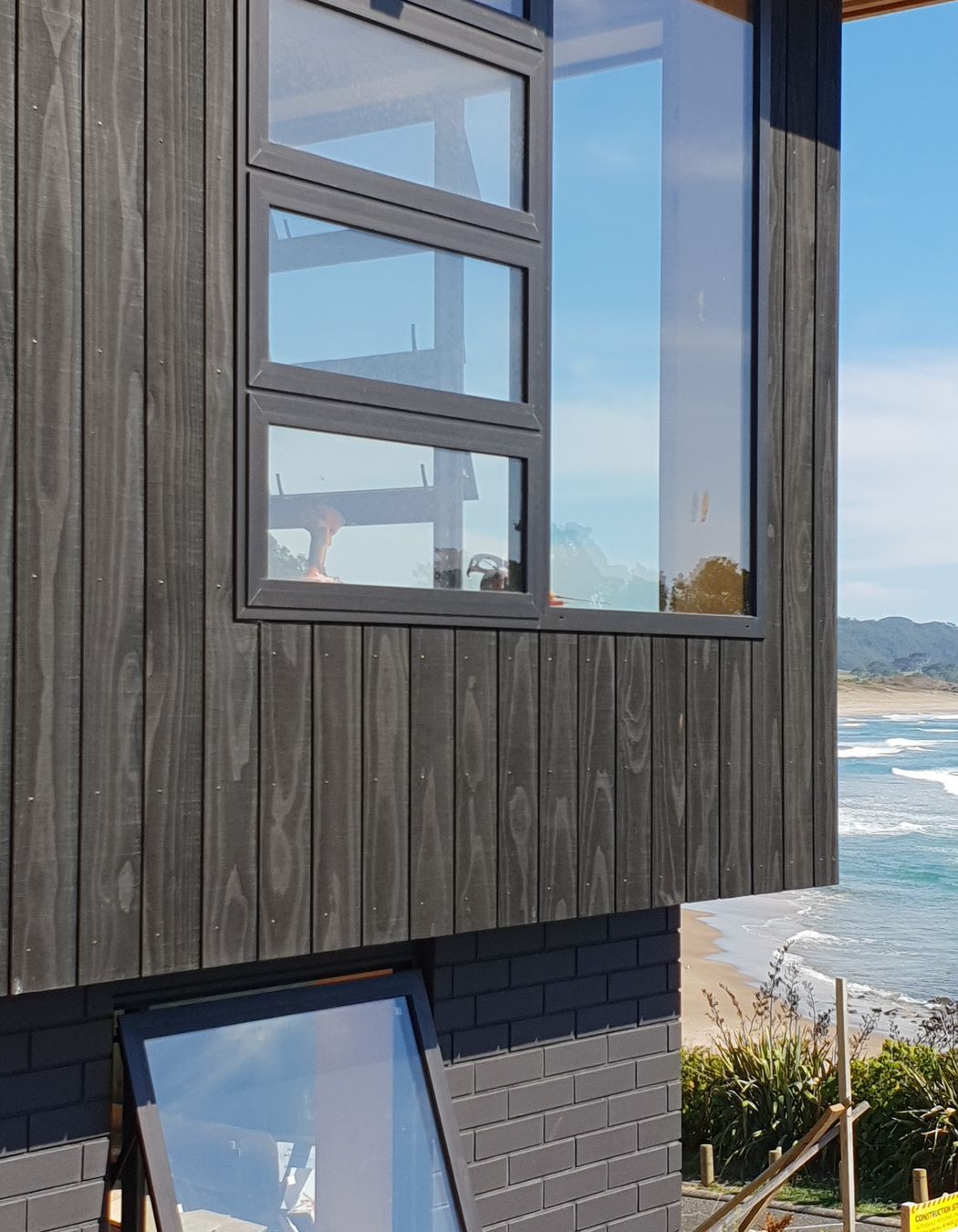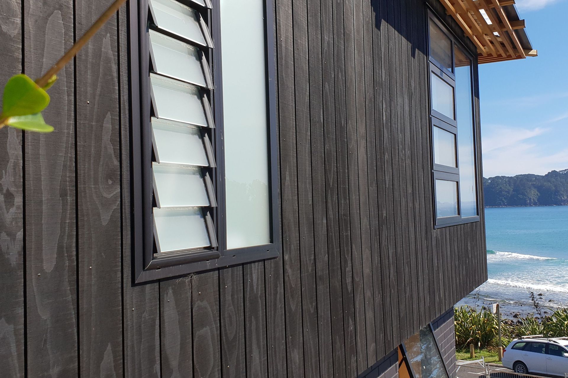 ArchiPro Project Summary - Coromandel House features a stunning Accoya exterior stained black, showcasing a P56 Vertical shiplap profile. Designed by Scarlet Architects, this remarkable home is built to withstand coastal conditions with a 50-year warranty against movement.