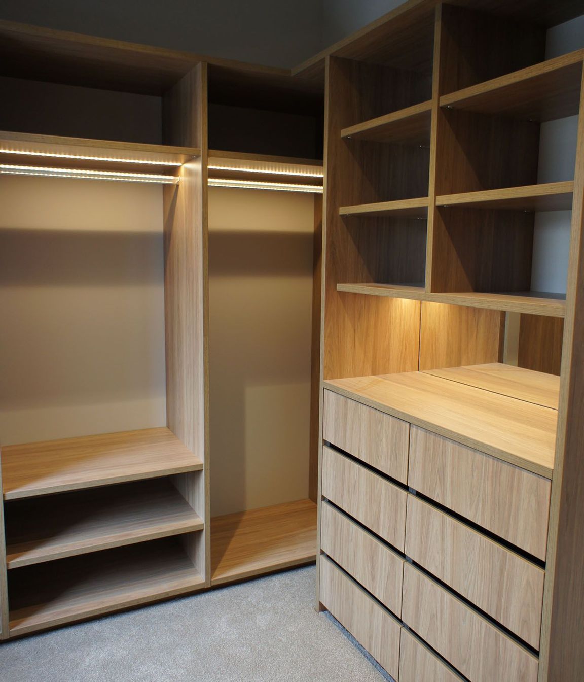 ArchiPro Project Summary - Luxurious dressing room featuring Urban Baroque Velvet Melamine Walk-In Wardrobe with full height cabinetry, soft-close drawers, and LED lighting for an elegant and practical storage solution.