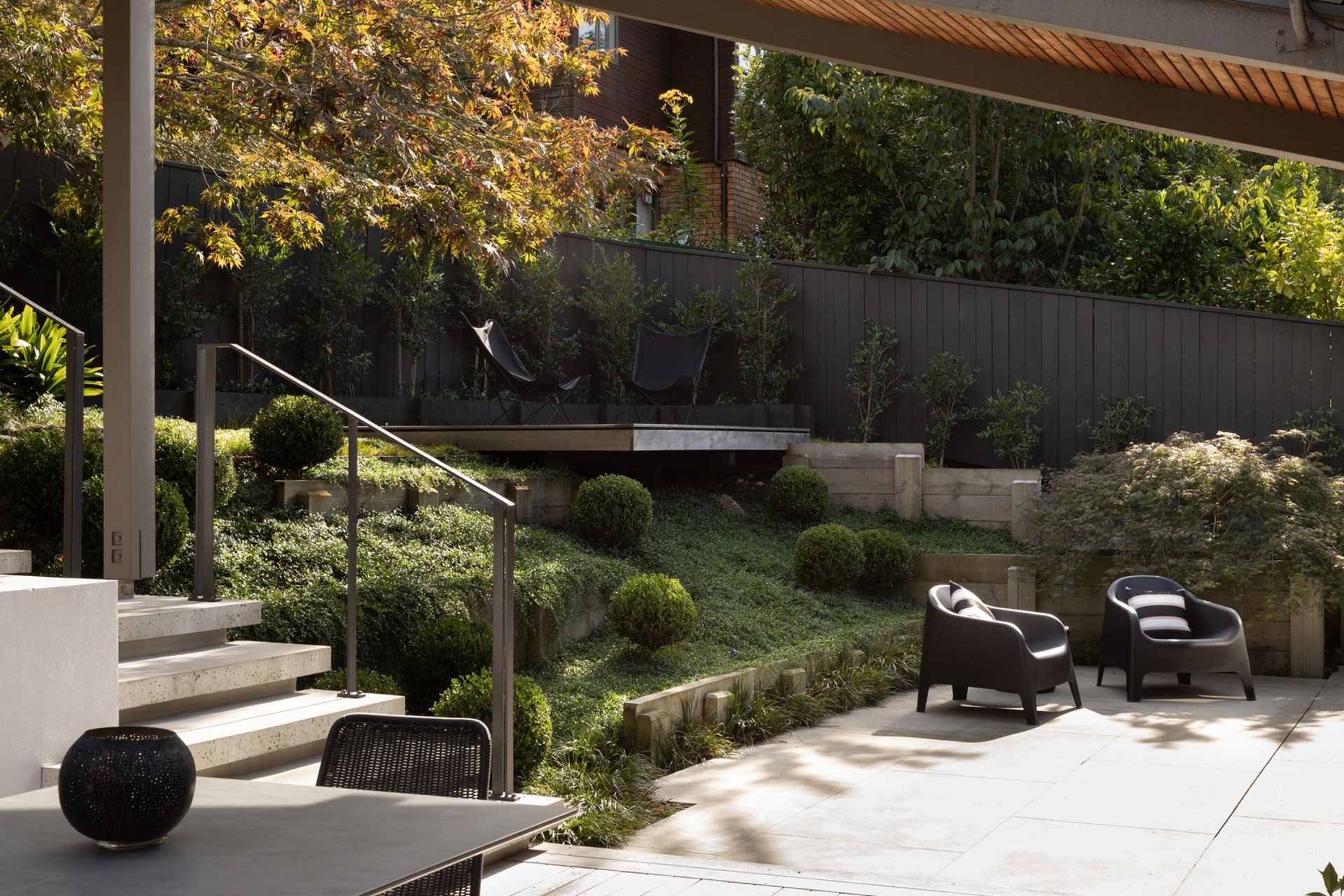 ArchiPro Project Summary - A mid-century, Japanese-influenced courtyard garden designed to create versatile outdoor living spaces, featuring a simple material palette and a striking Japanese maple as the focal point.